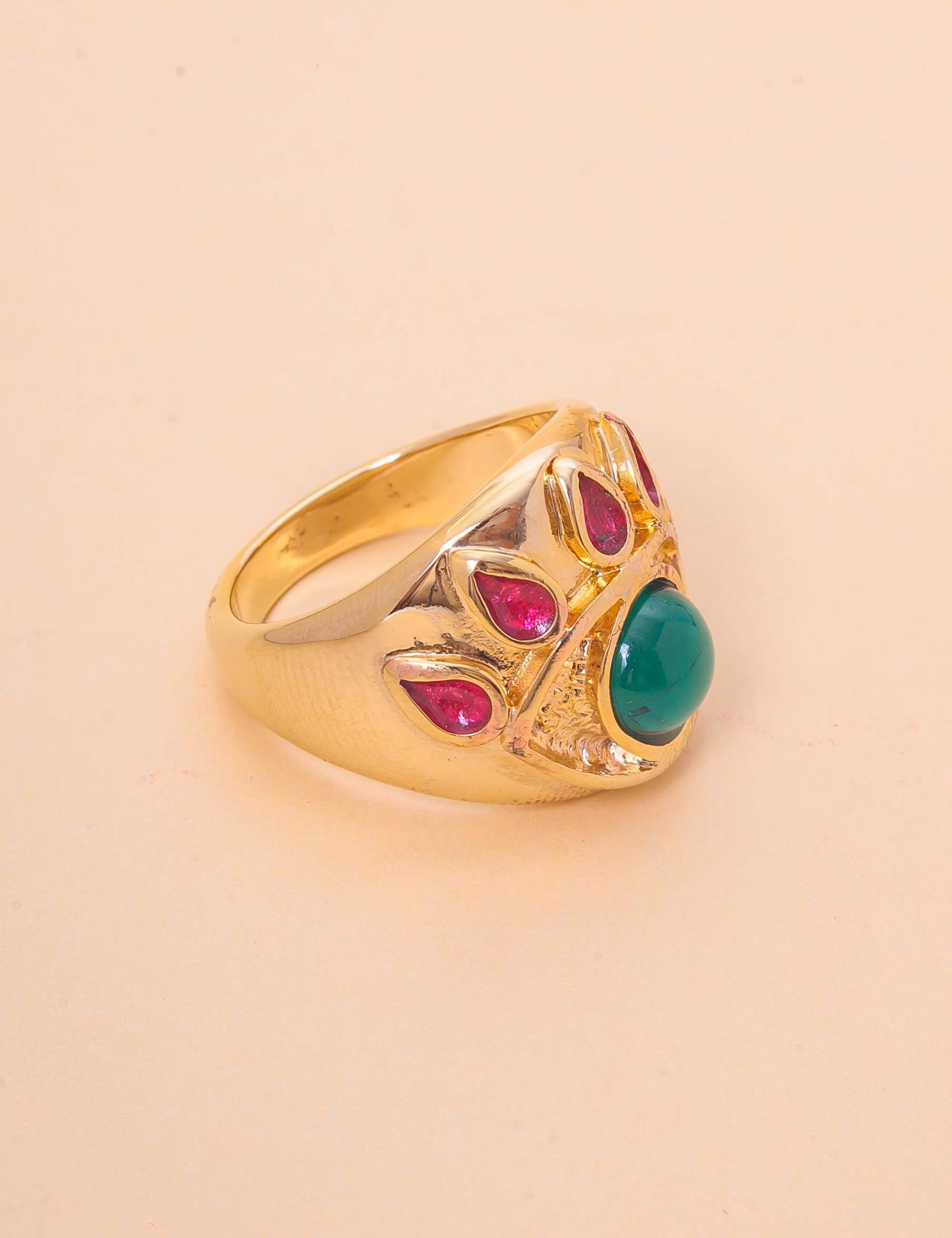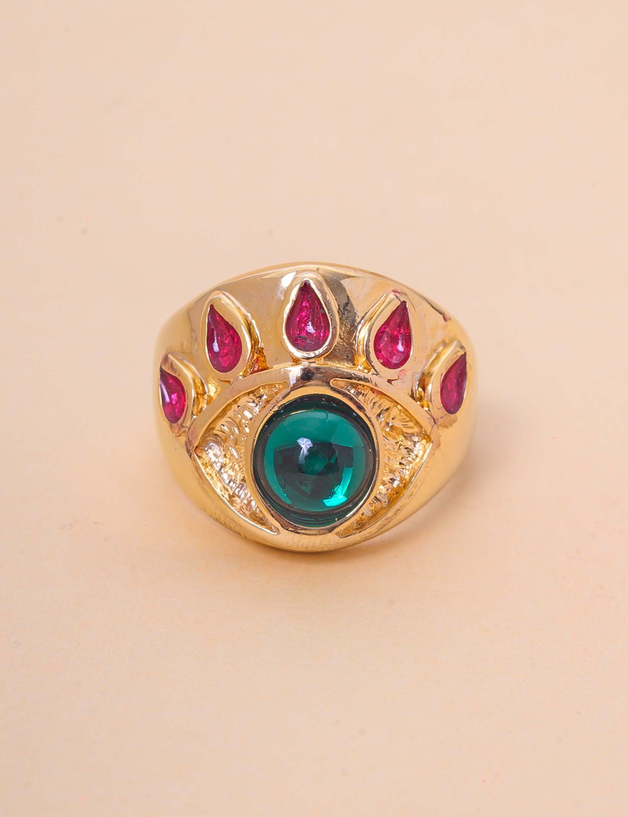 Anel com cristais coloridos em formato de olho grego, simboliza proteção e estilo em uma peça delicada e moderna.