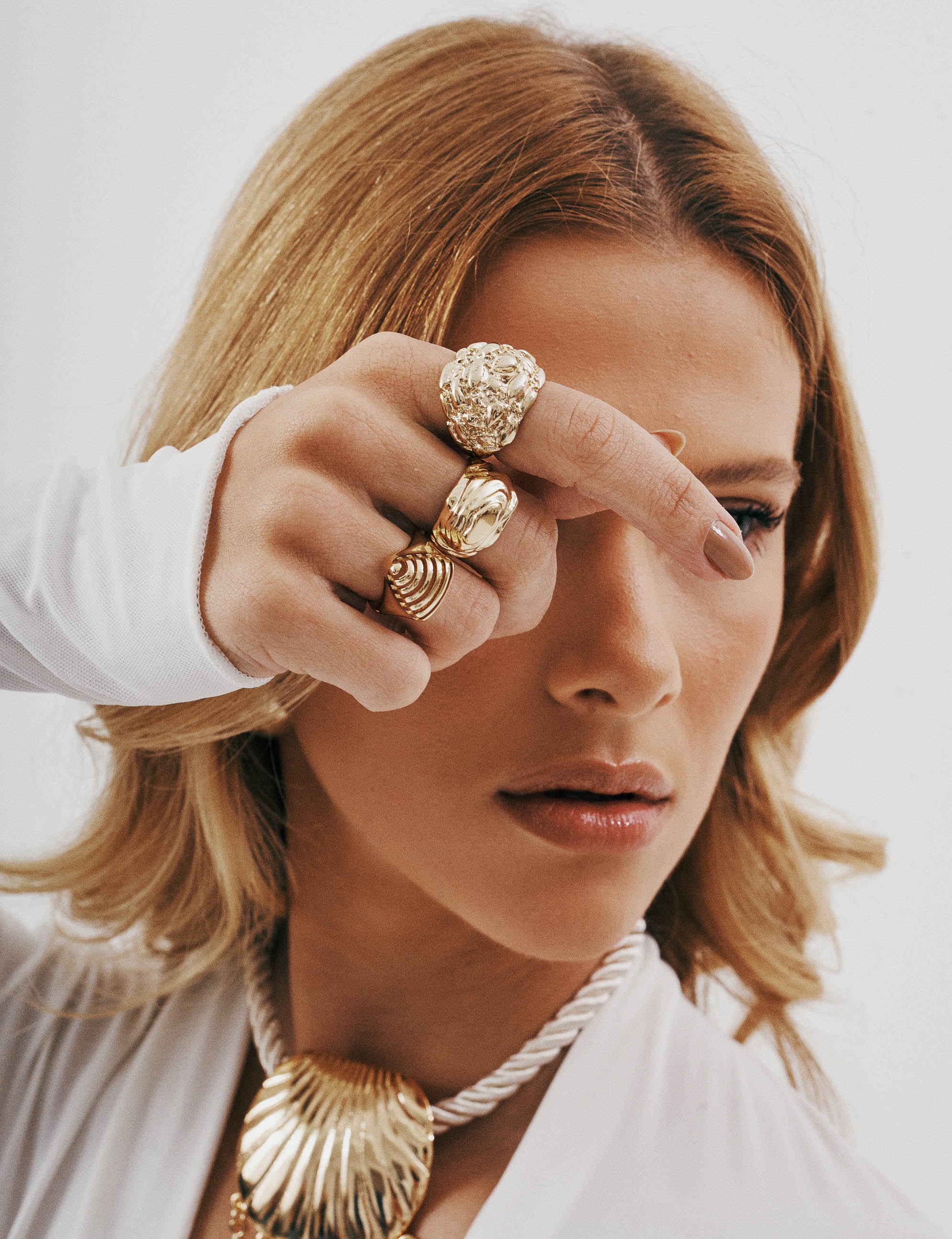 Anel texturizado, moderno e cheio de estilo. Um detalhe único que transforma qualquer look com sofisticação.