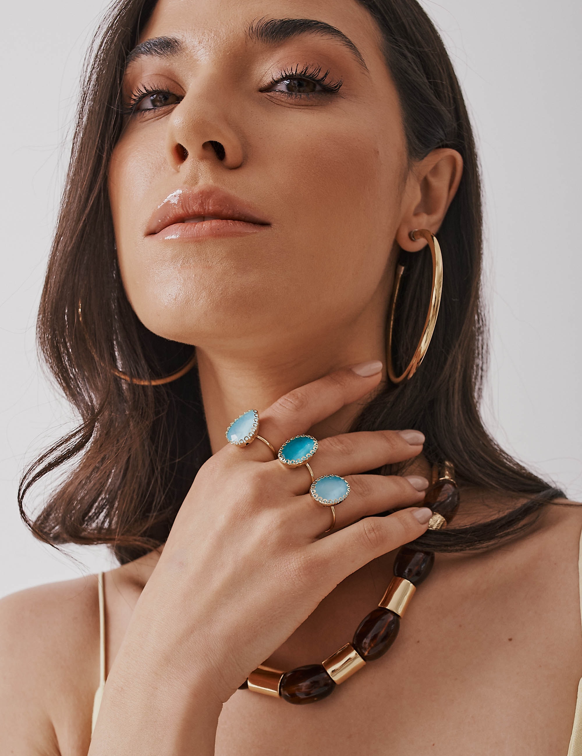 Todos os nossos metais são banhados a ouro, possuem camada protetiva para bijuterias finas e também possuem camada de metal precioso em sua composição. As bijuterias precisam de cuidados, limpe-as com flanela seca e macia, evite contato direto com cosméticos, areia, praia e piscina.