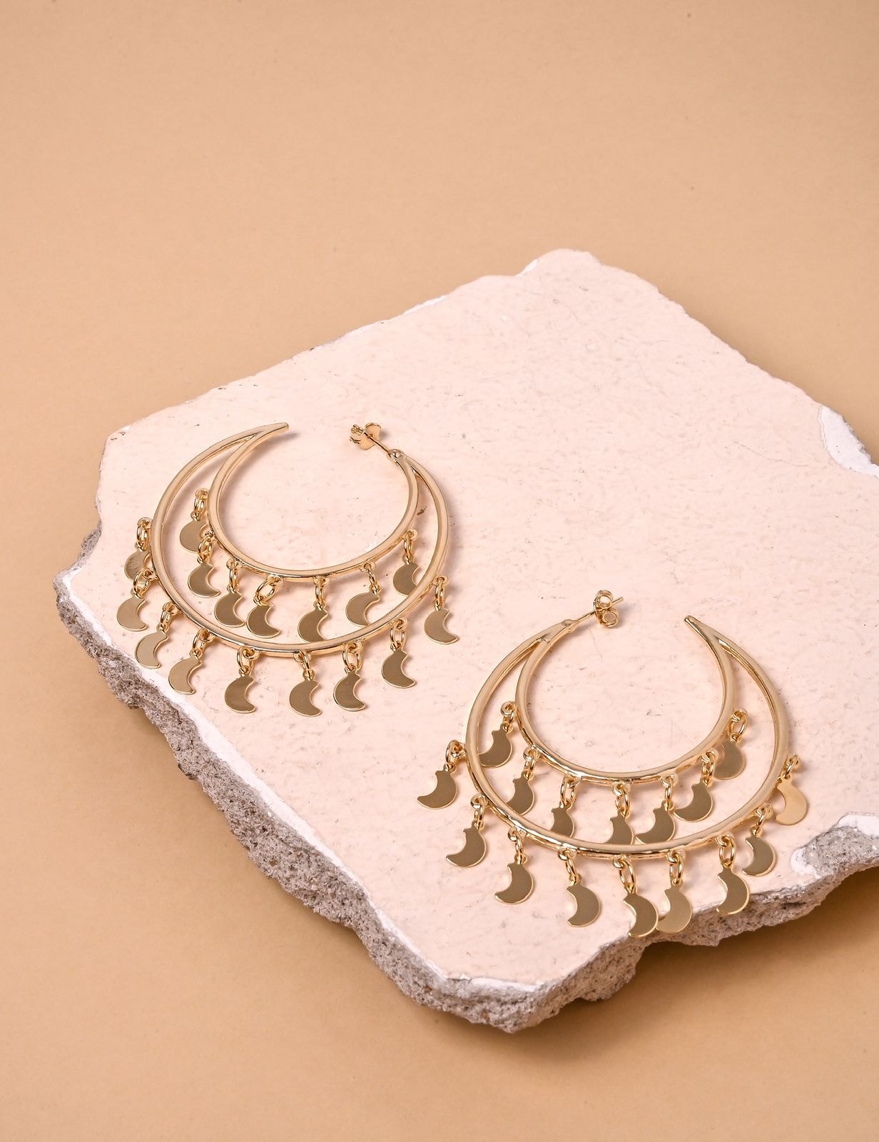 Brinco argola com banho em ouro e delicado pingente de lua. Um acessório leve, versátil e cheio de charme para complementar qualquer look.