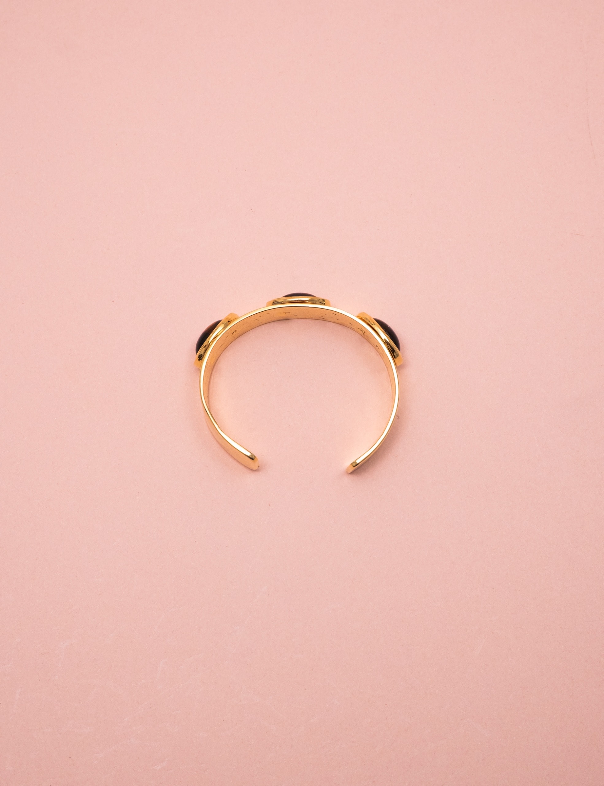 Bracelete banhado a ouro com pedra tartaruga, um design moderno que une elegância e personalidade. A tonalidade quente da pedra cria um contraste sofisticado com o brilho dourado, resultando em uma peça versátil e marcante