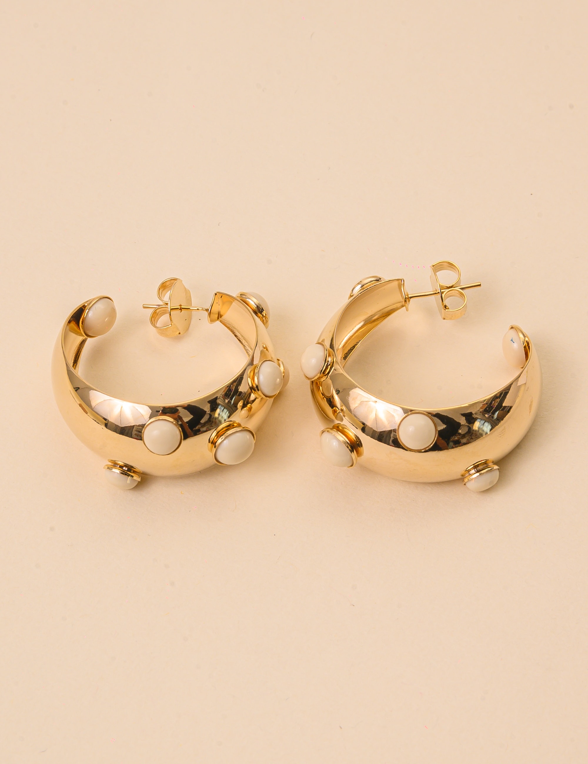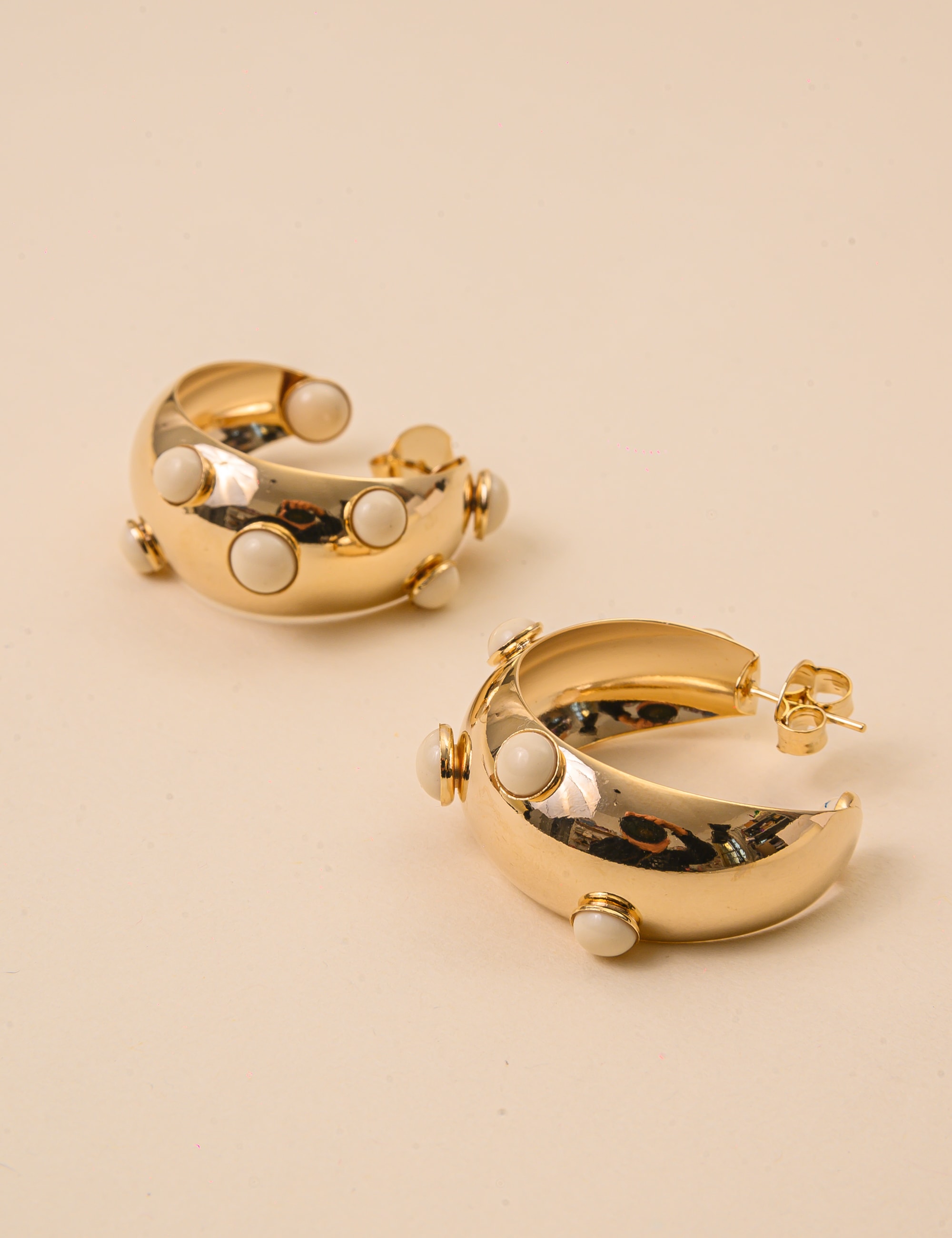 Brinco de argola banhado a ouro com delicadas esferas brancas. Um modelo clássico e elegante, ideal para iluminar o visual e complementar qualquer produção com sofisticação.