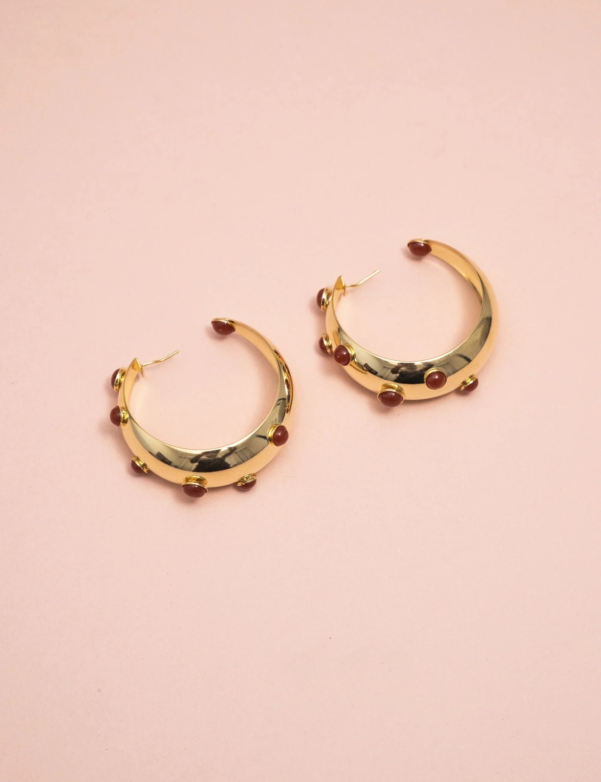 Brinco de argola banhado a ouro com pedras vermelhas. Um acessório marcante e elegante, perfeito para adicionar cor e sofisticação ao visual.