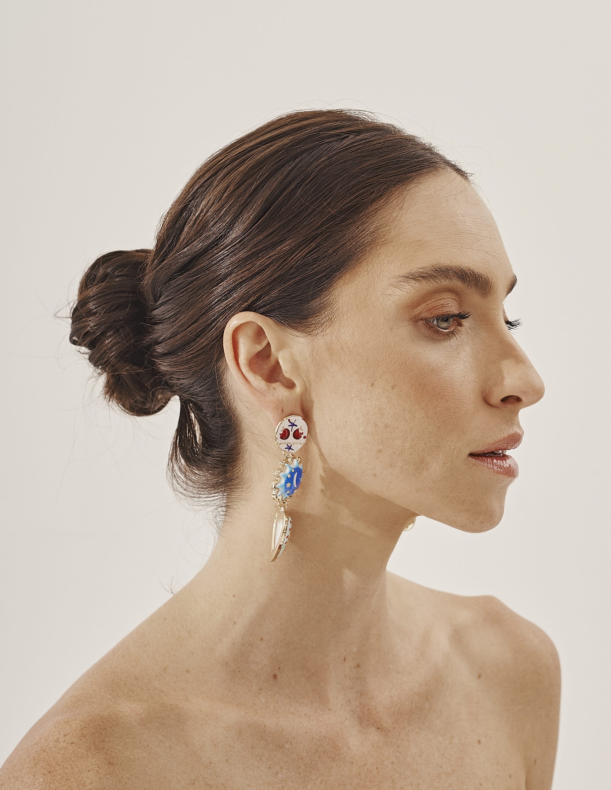 Brinco com base redonda e detalhes desenhados, pêndulos em formato de sol e coração com detalhes de estrela, lua e flores. Moderno e cheio de charme para realçar qualquer look.