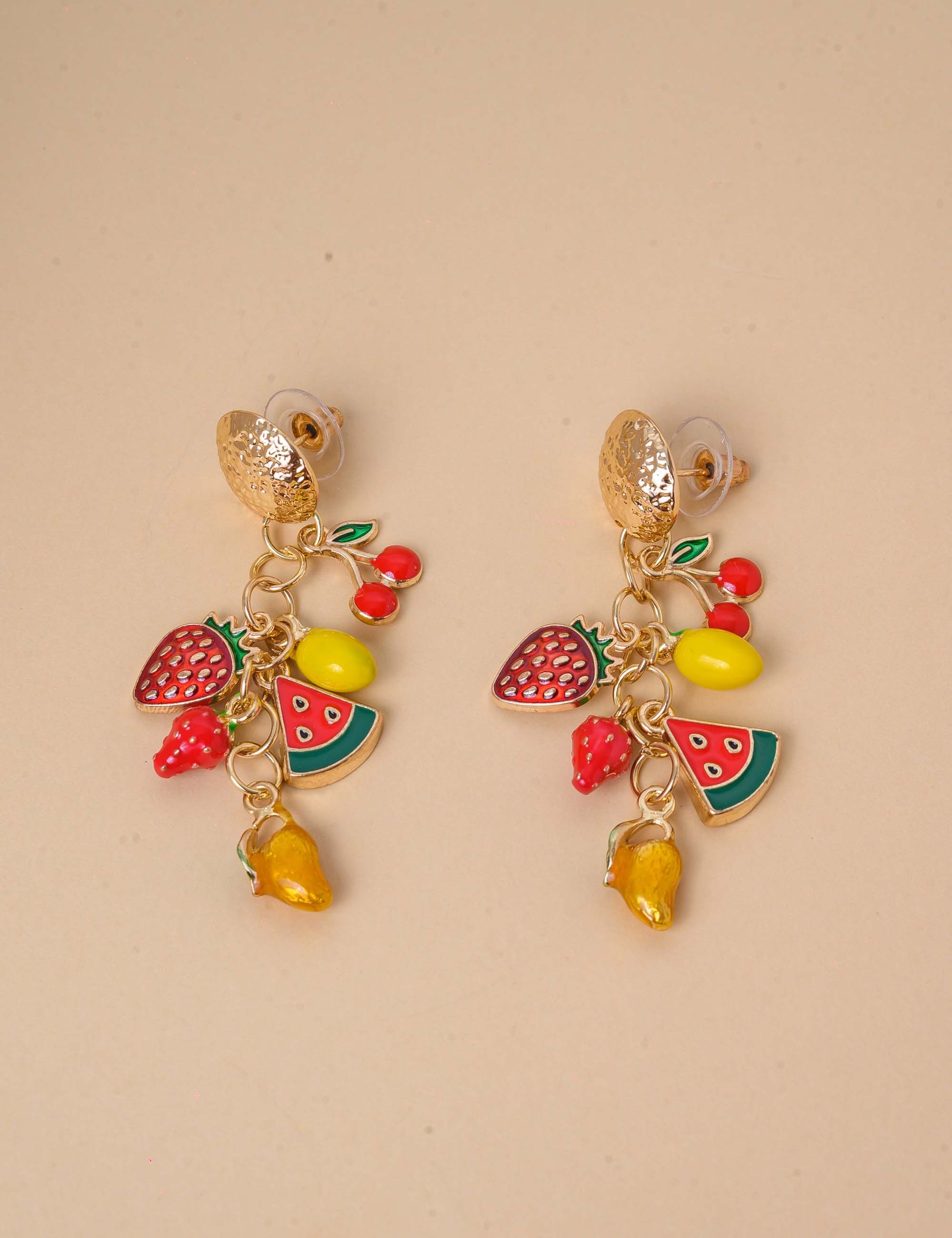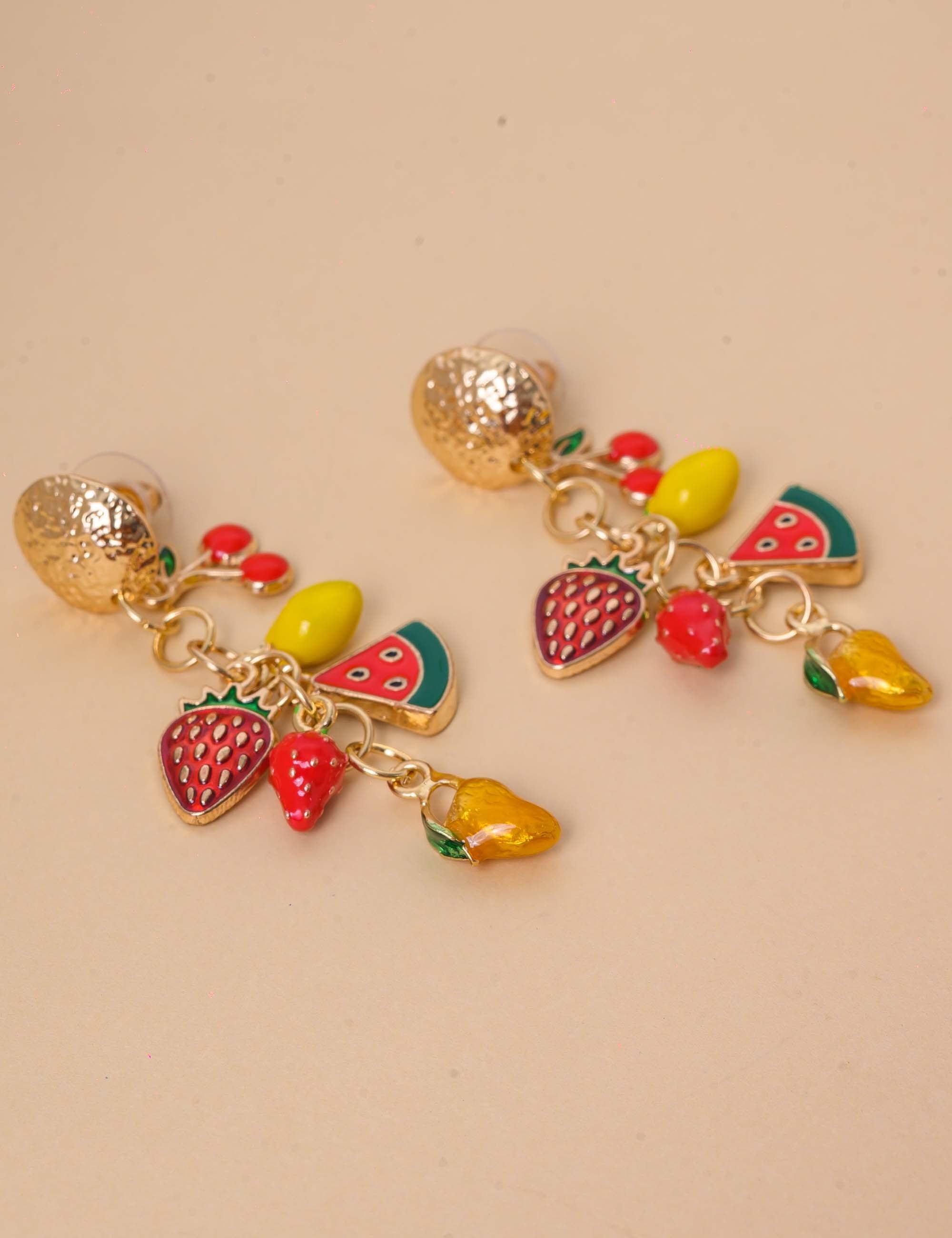 Brinco divertido e colorido com mini frutas em resina e banho de ouro. Leve, moderno e perfeito para dar um toque tropical ao seu look!