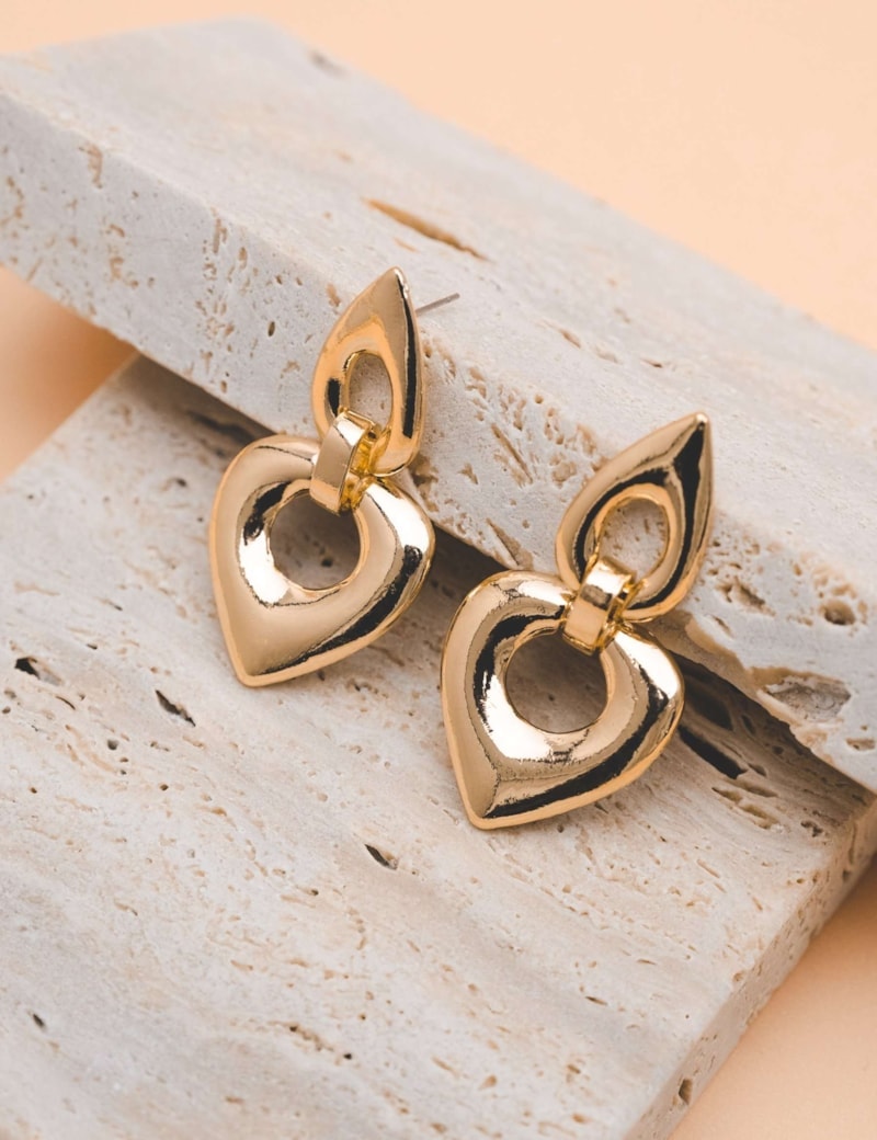 Brinco com formato na base de gota vazado e pingente de coração vazado, tamanho médio. Peça alta fusão, pino aço cirúrgico, banhado no ouro, verniz e antialérgico. Brinco que traz estilo e leveza para você usar no dia a dia ou ocasiões especiais.