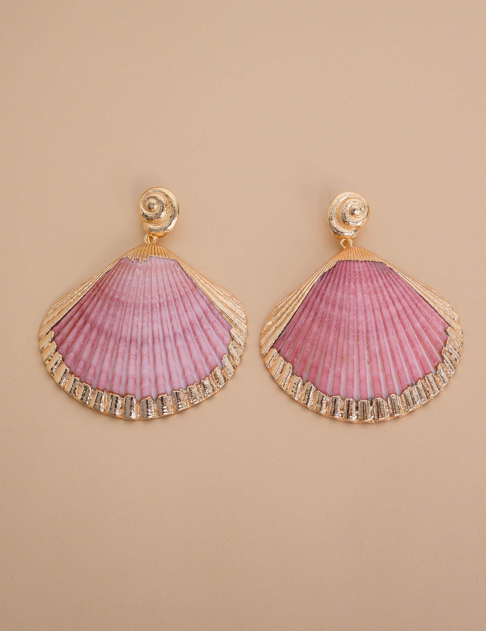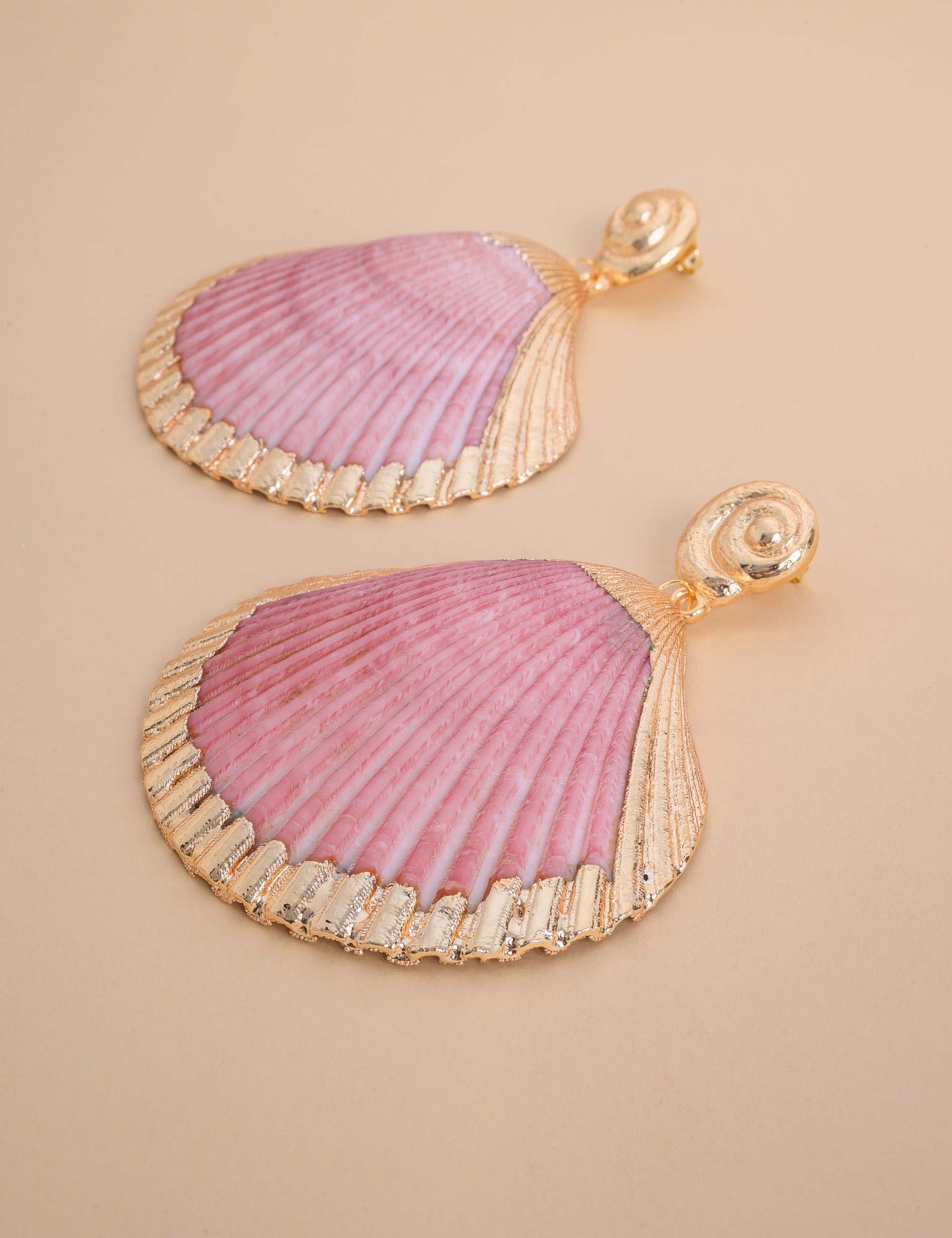 Brinco em formato de concha na cor rosa, banhado a ouro. Um modelo moderno e vibrante que traz leveza e estilo, ideal para compor produções cheias de personalidade.