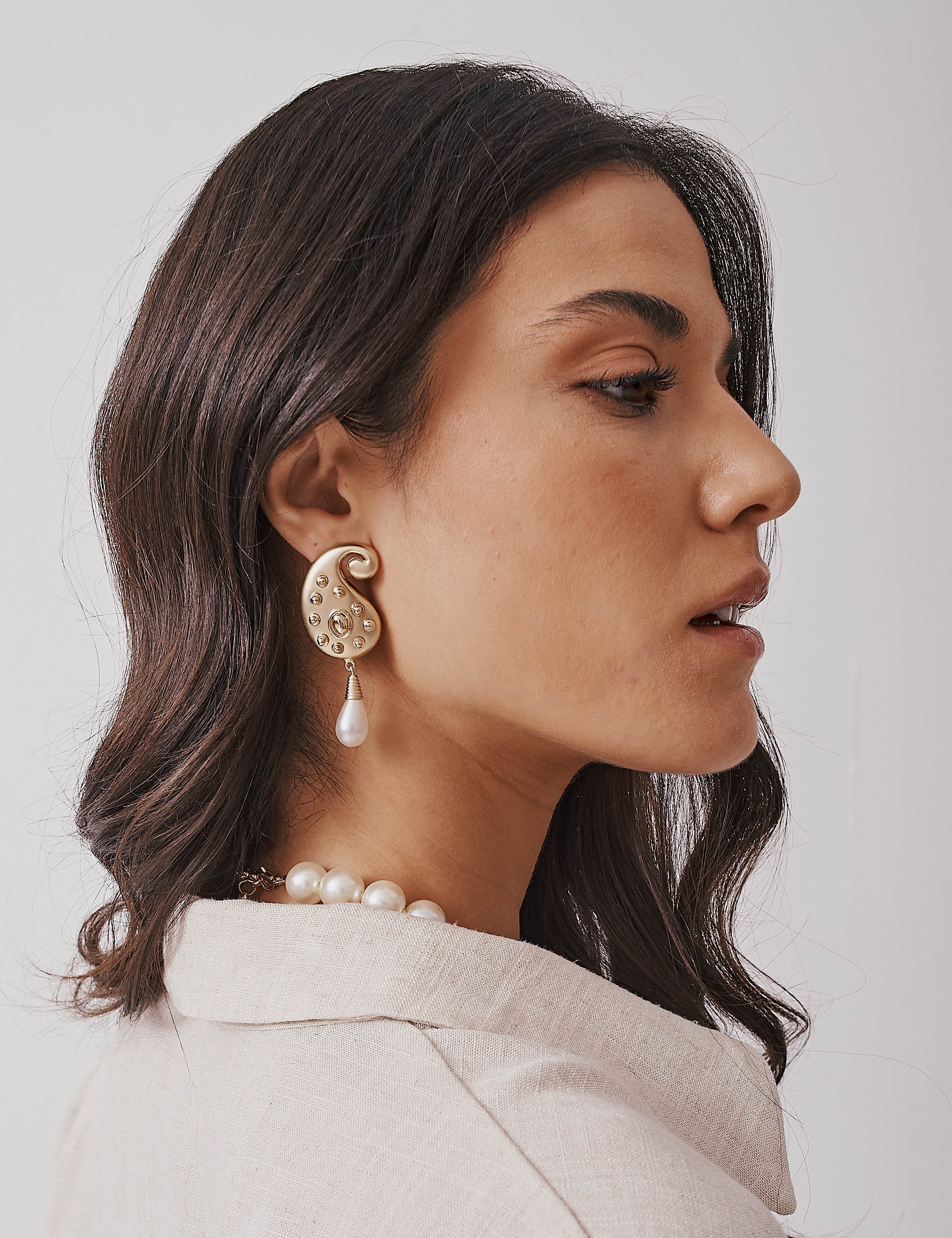 Brinco com design em formato orgânico, que apresenta detalhes delicados na sua base, trazendo textura e personalidade à peça. Conta ainda com um pingente em formato de gota, que adiciona movimento e elegância ao acessório.