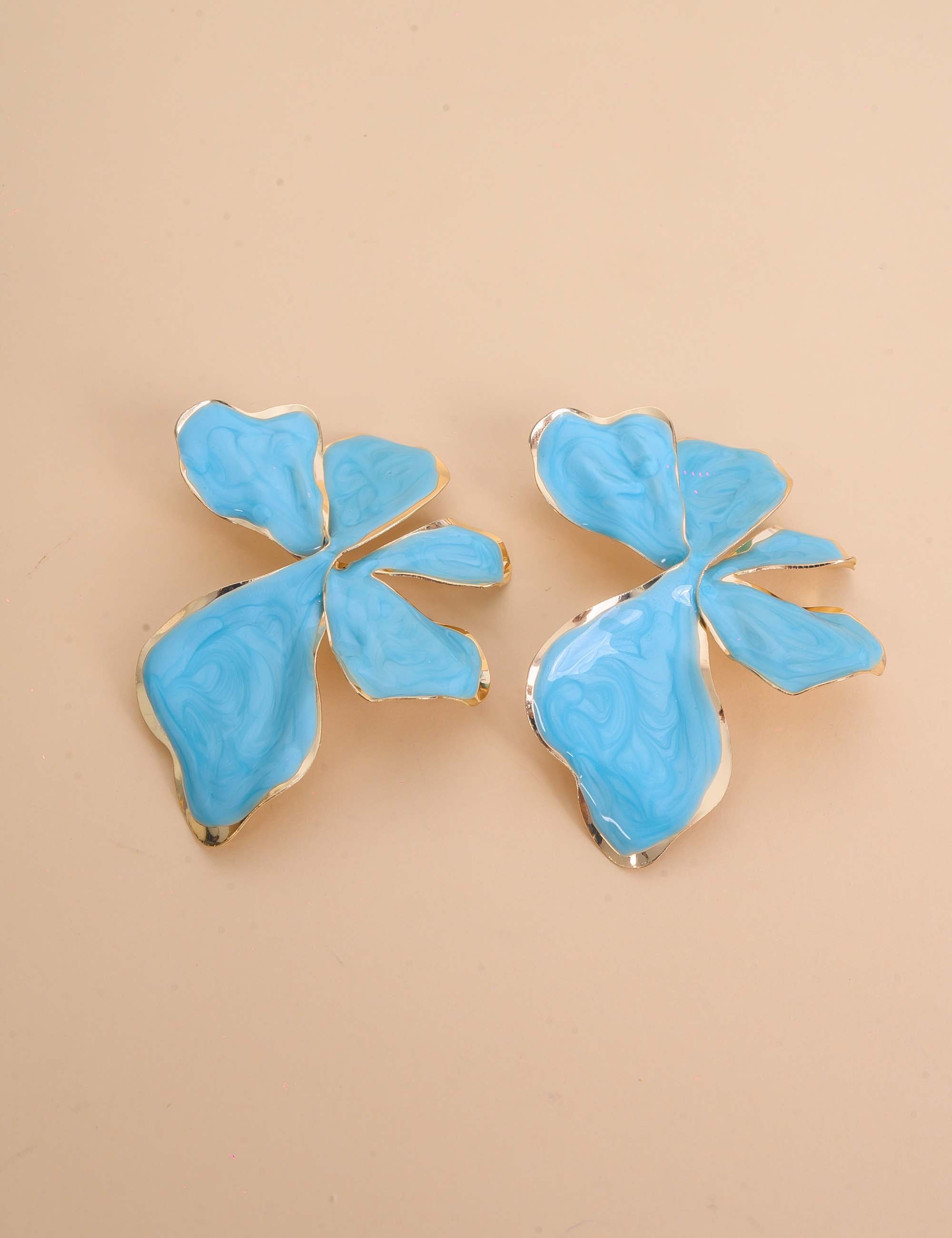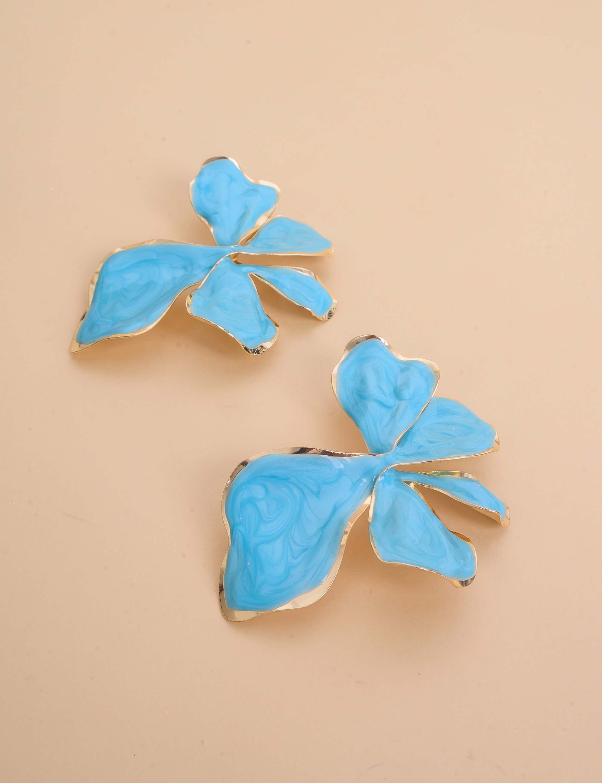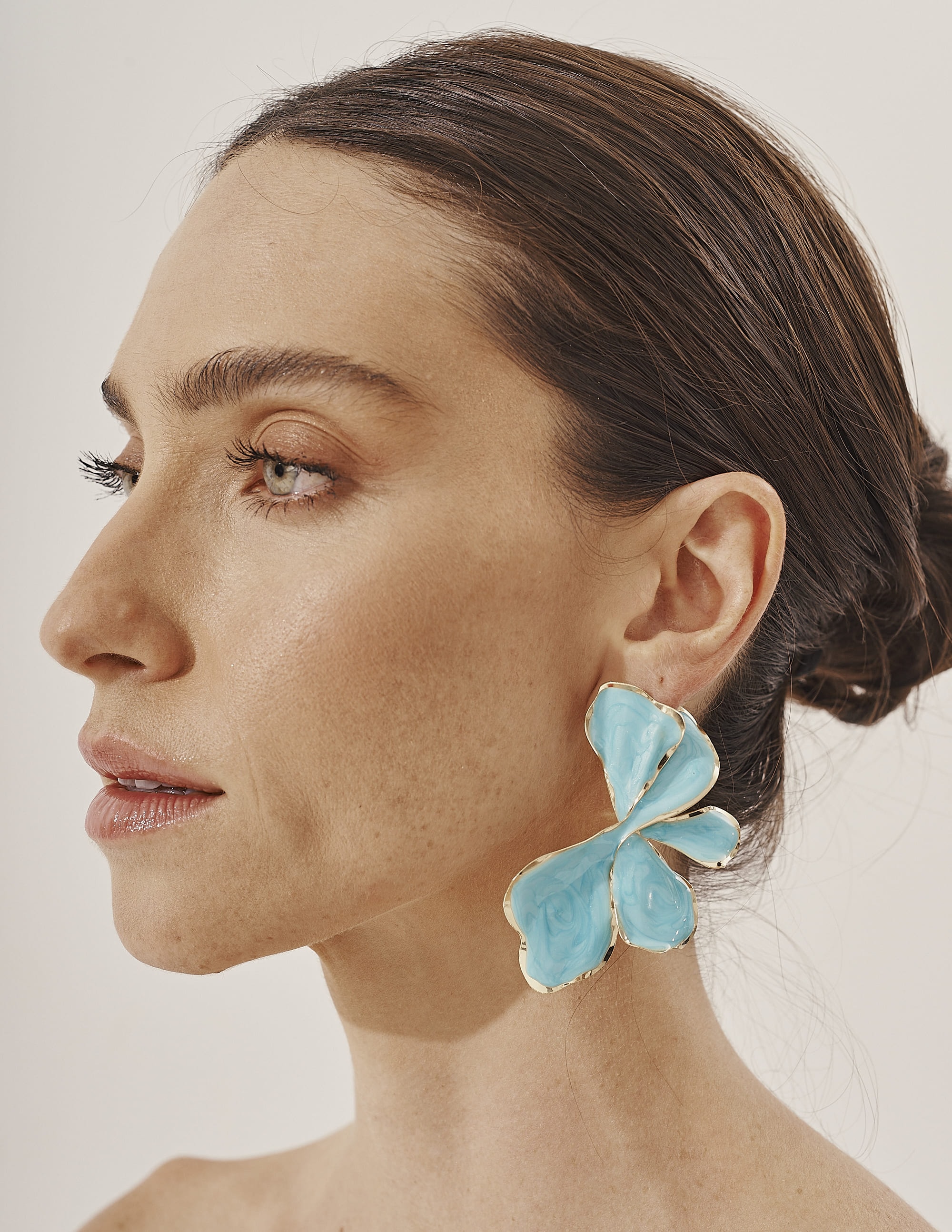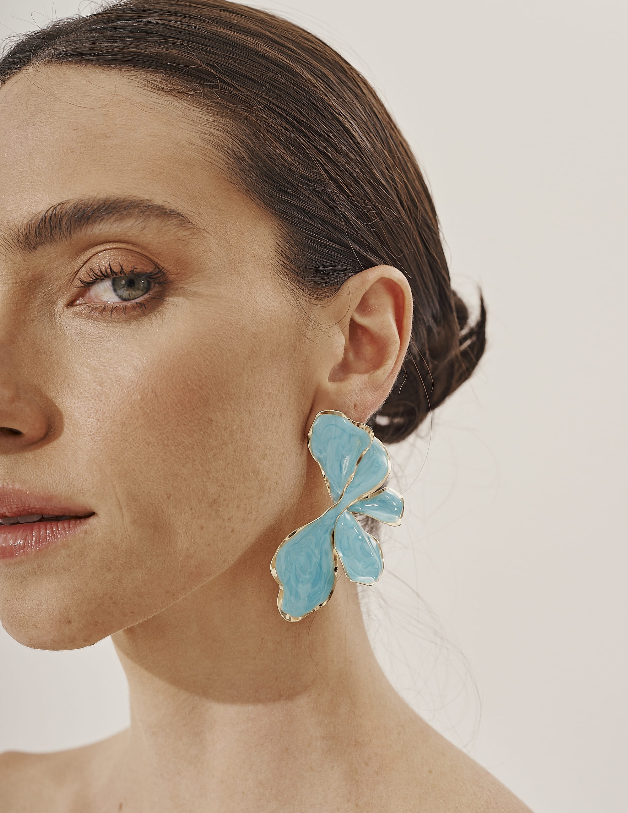 Brinco de ouro e resina na cor azul celeste, elegante e versátil, perfeito para adicionar charme e estilo ao visual.