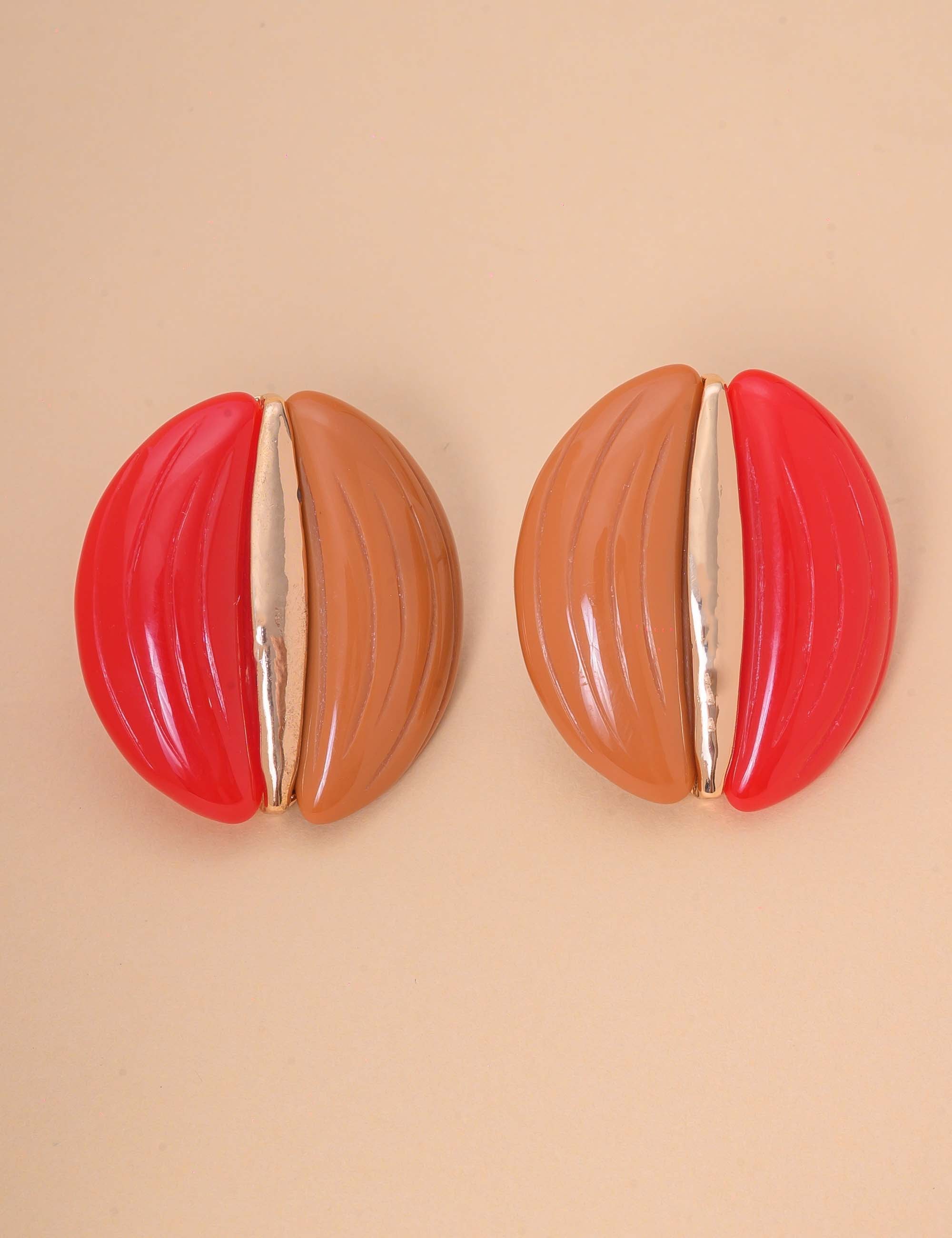 Brinco elegante e moderno, resina vermelha e bege, com sua base dourada, é perfeito para quem busca um toque sofisticado no dia a dia, criando um contraste refinado e harmonioso.