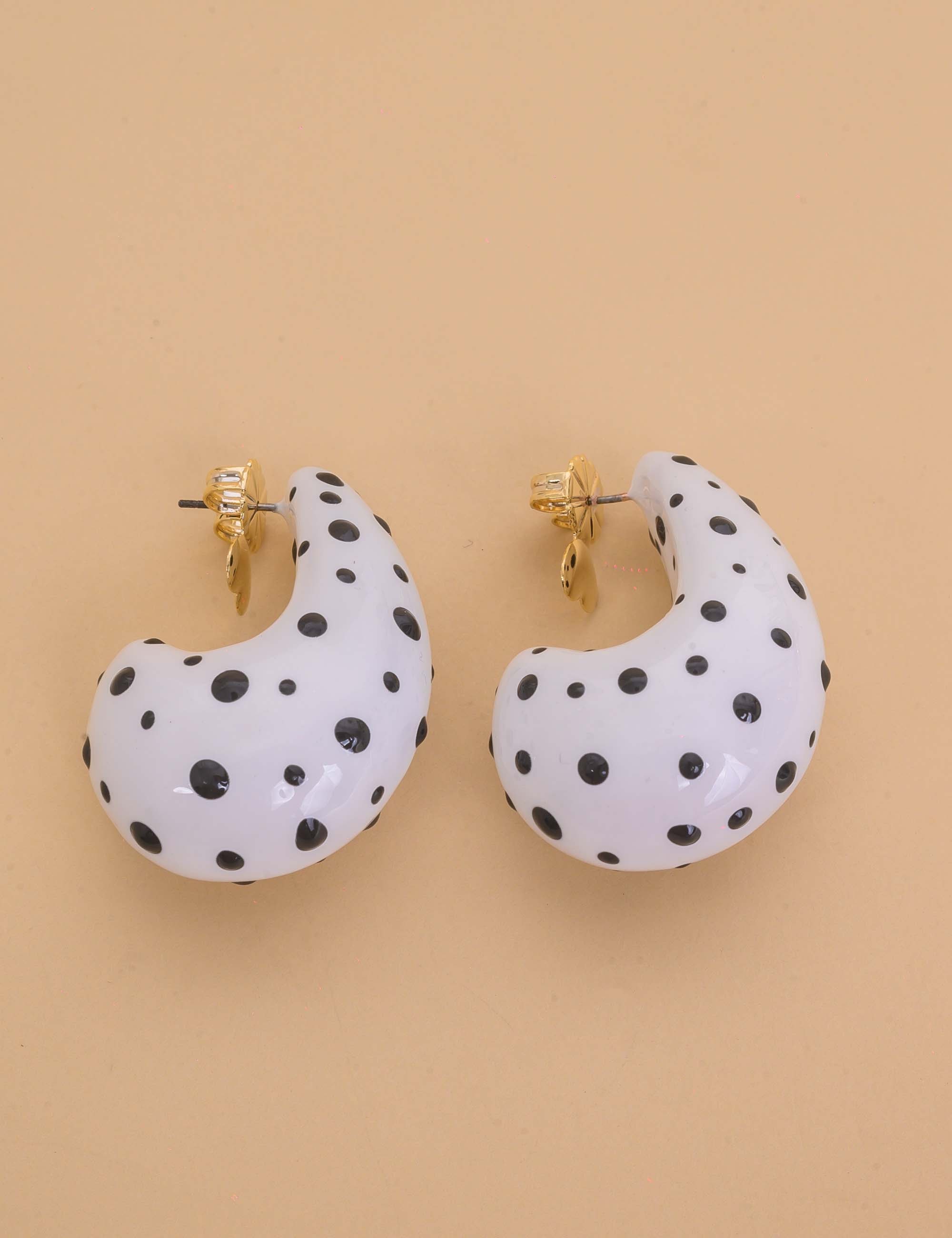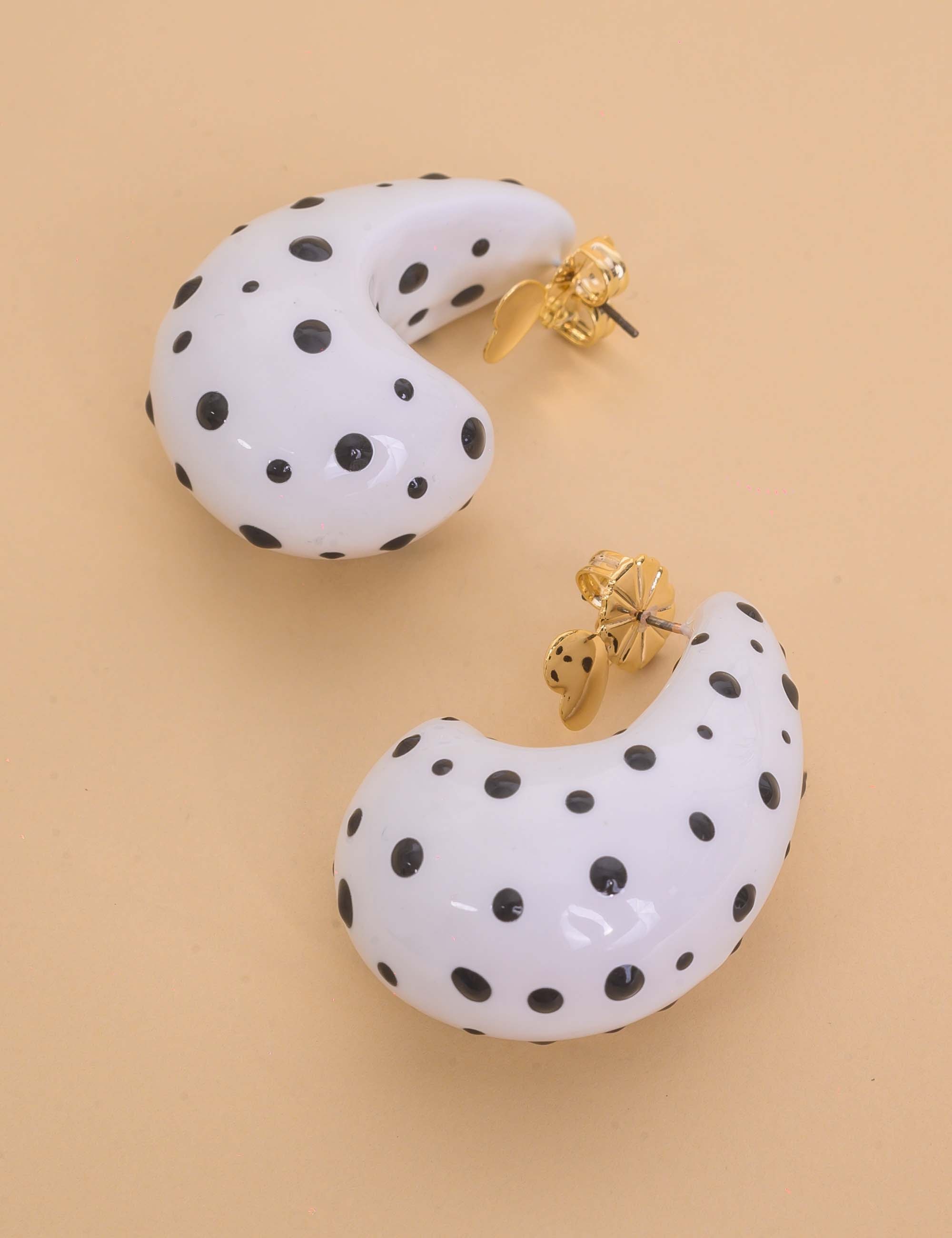 Brinco poá de resina branca com detalhes pretos, elegante e versátil, perfeito para adicionar charme e estilo ao visual.