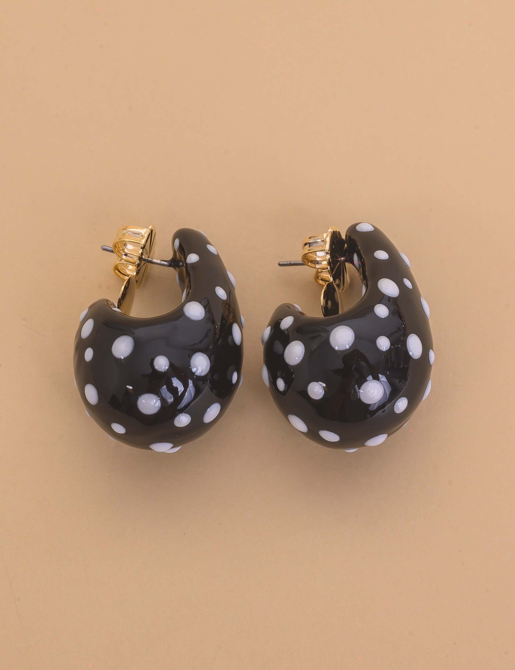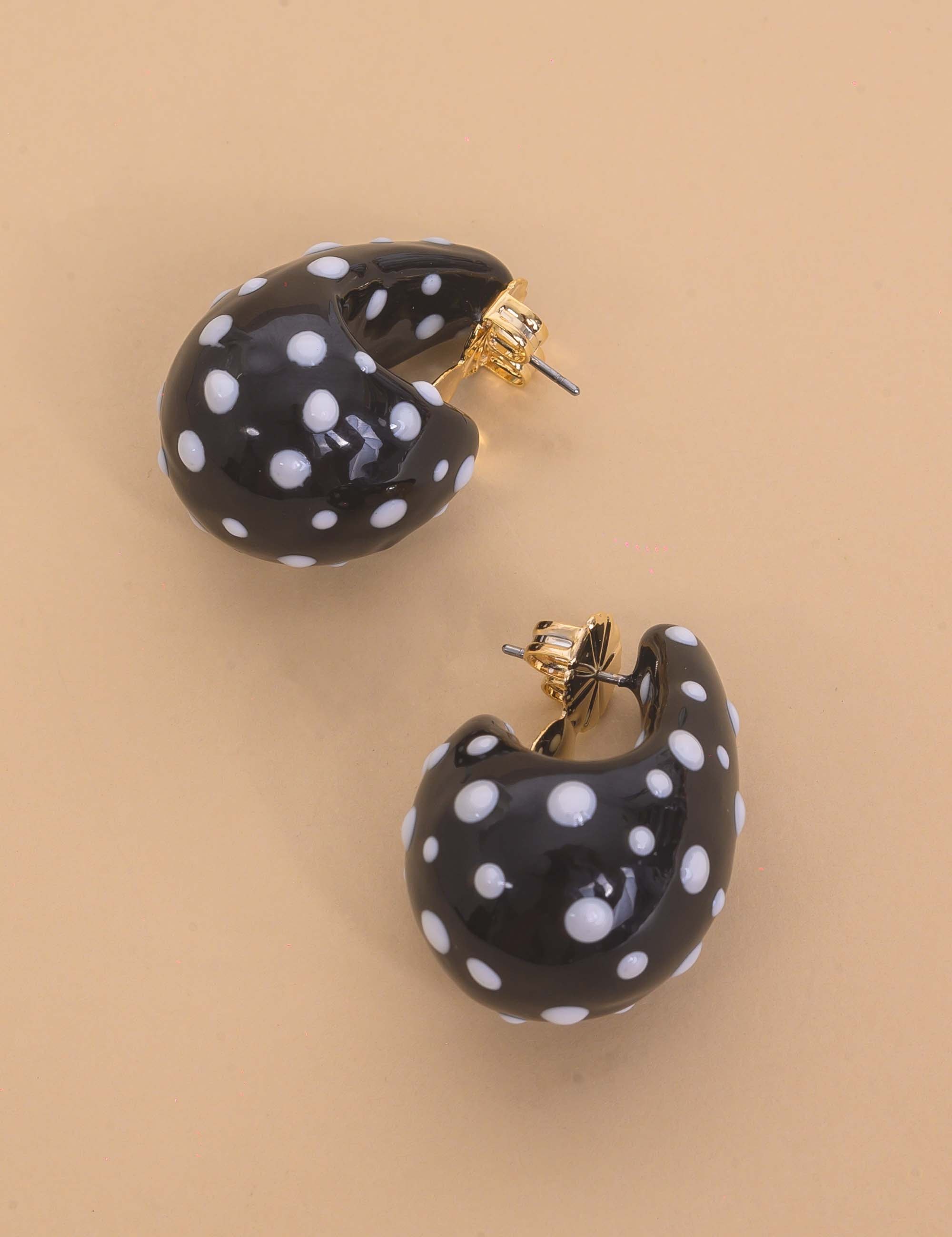 Brinco poá de resina preta com detalhes brancos, elegante e versátil, perfeito para adicionar charme e estilo ao visual.