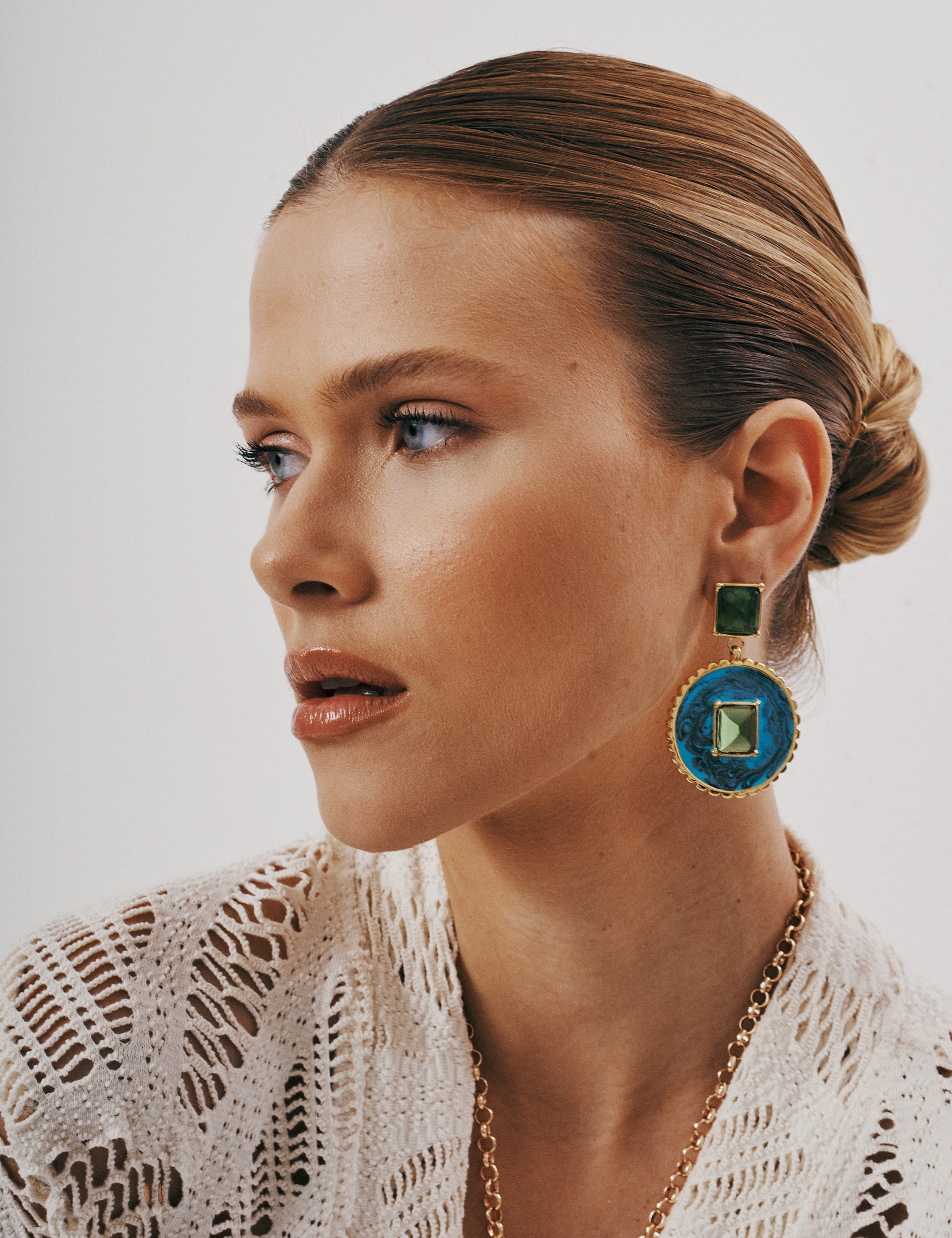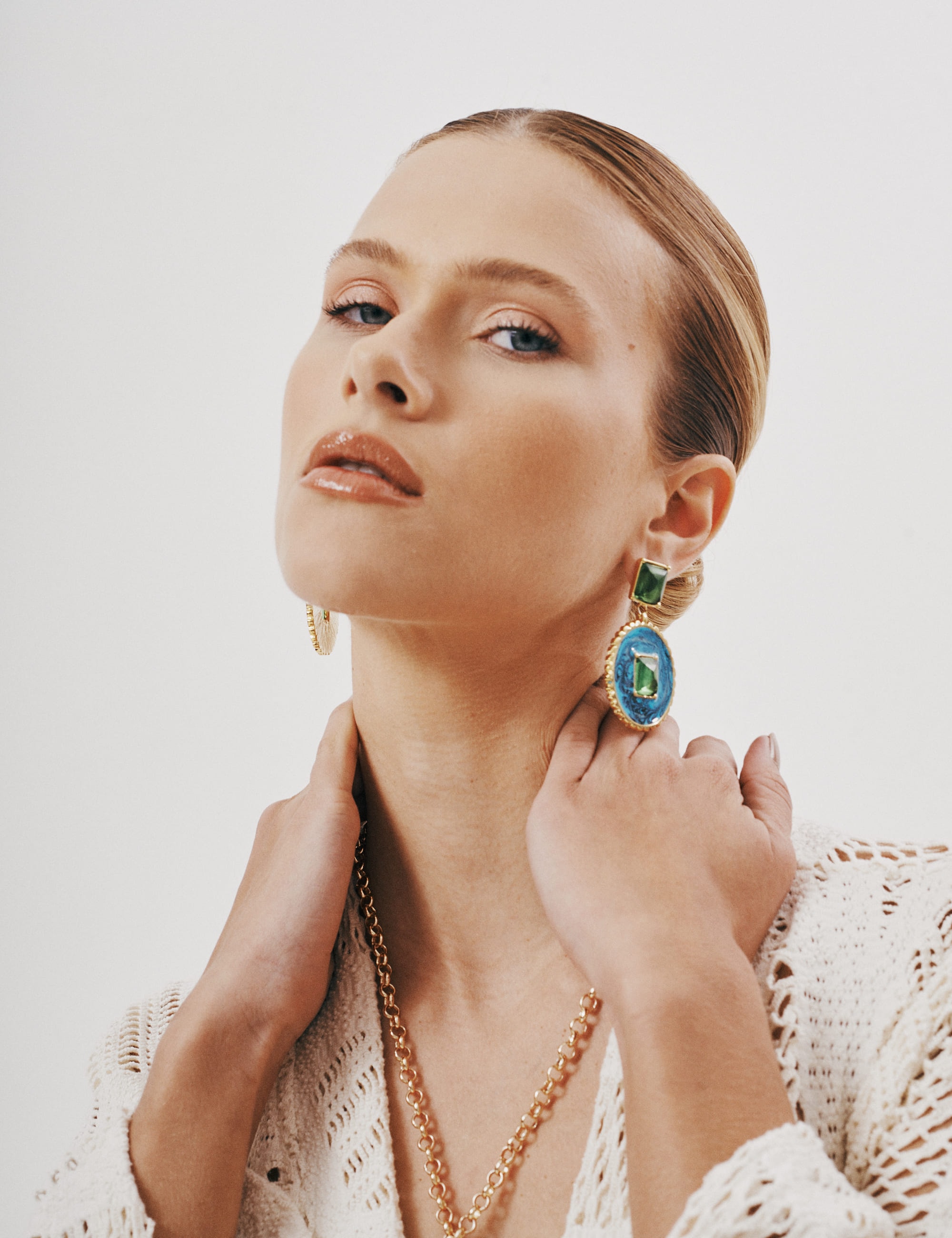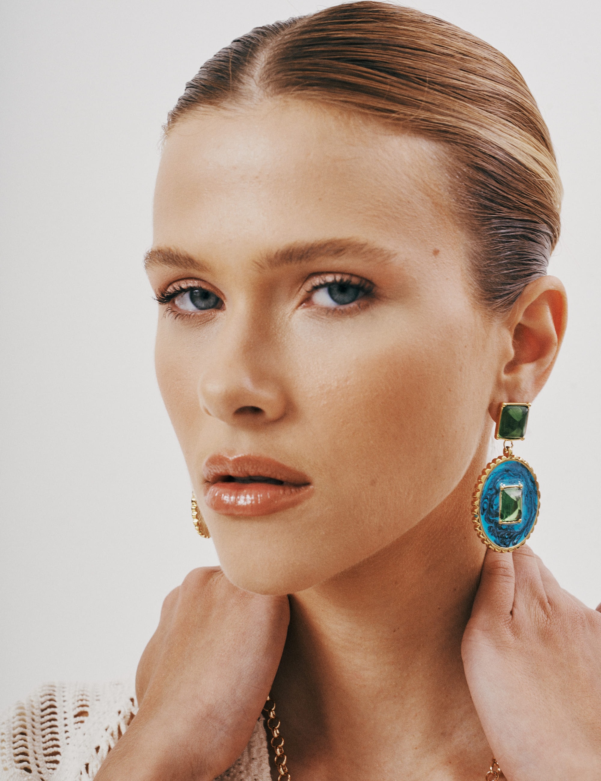 Brinco de resina banhado a ouro com pedra verde. Design elegante e acabamento de alto brilho, é o acessório ideal para adicionar um toque de cor e sofisticação a qualquer look