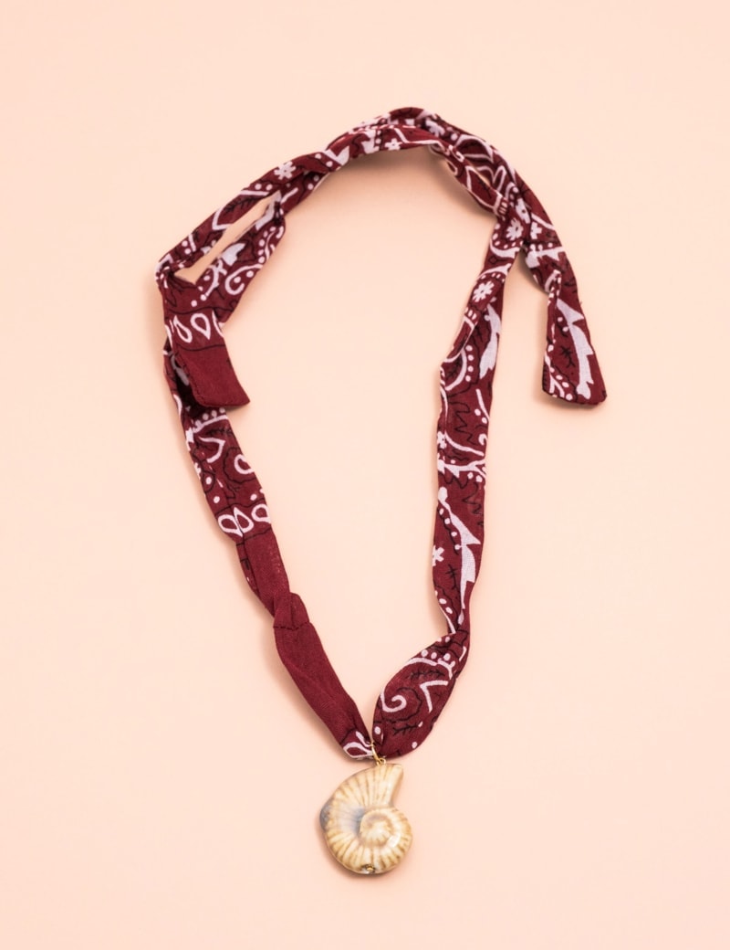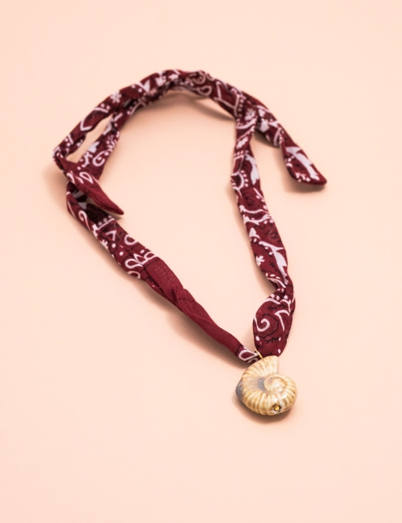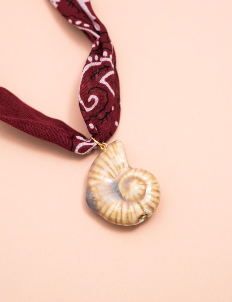 Colar bandana em tecido de algodão com detalhe de pingente no formato de concha resinada. Uma peça que combina leveza, feminilidade e elegância em um design moderno e versátil.