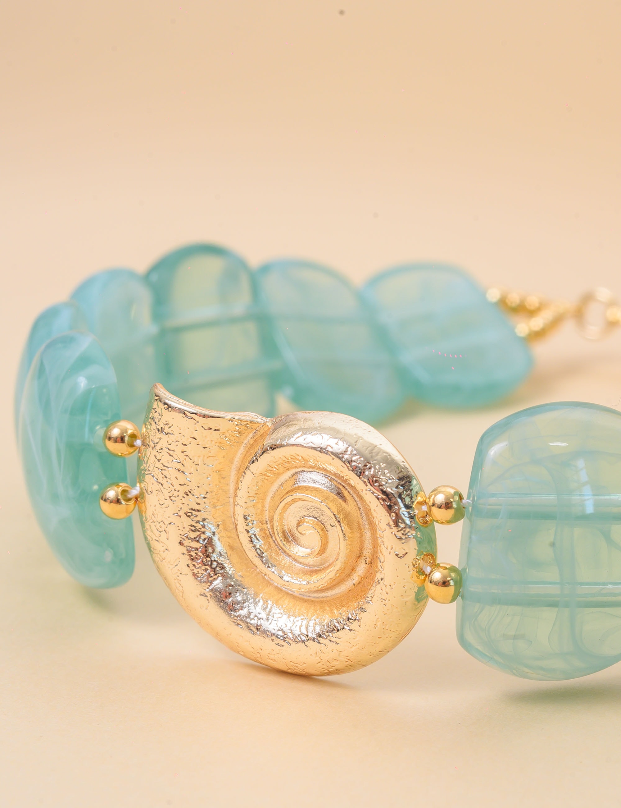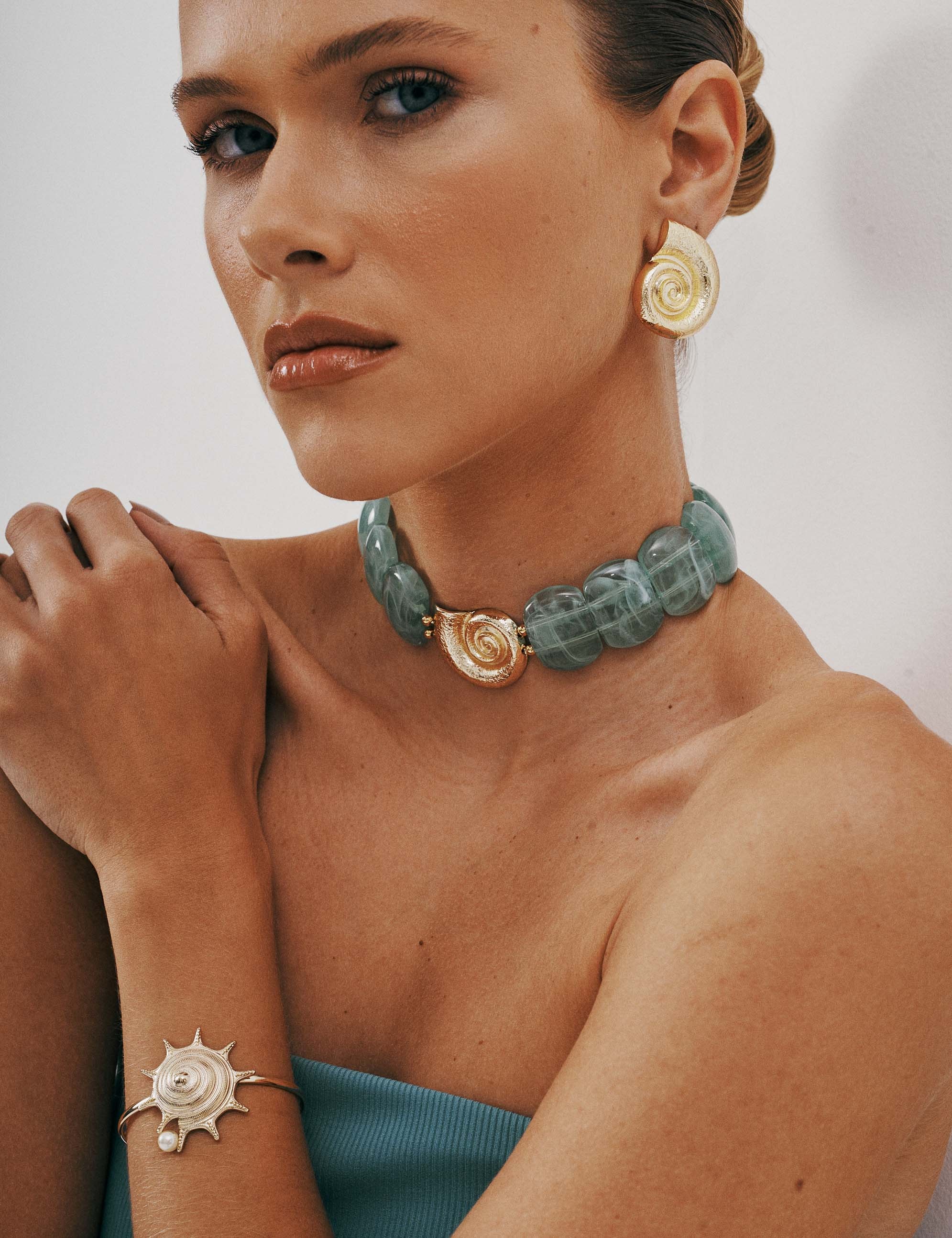 Colar choker concha com pedras verdes, elegante e natural. Perfeito para iluminar o visual com um toque de frescor.