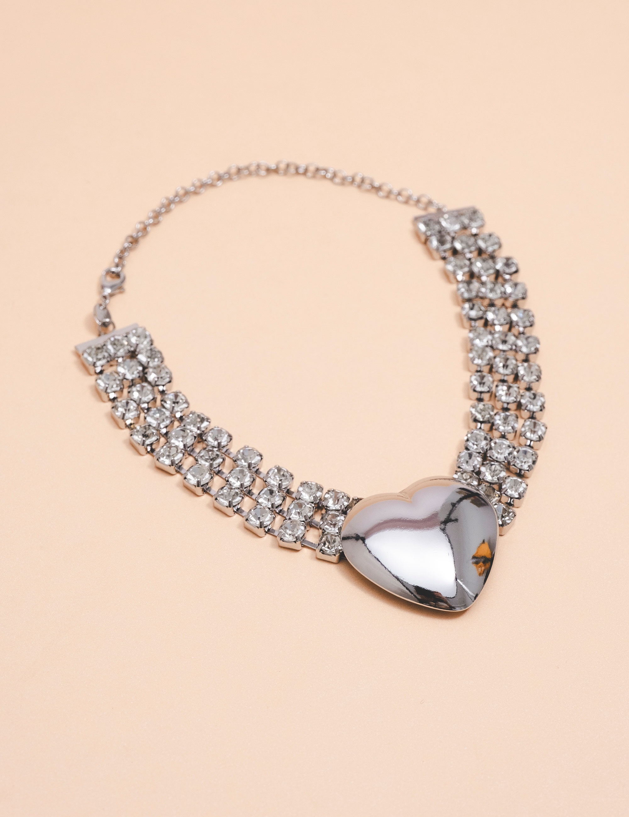 Colar com aplicação de strass brilhante e pingente em formato de coração com acabamento espelhado em tom prata. Uma peça marcante, sofisticada e cheia de glamour, perfeita para destacar o visual com elegância e personalidade.