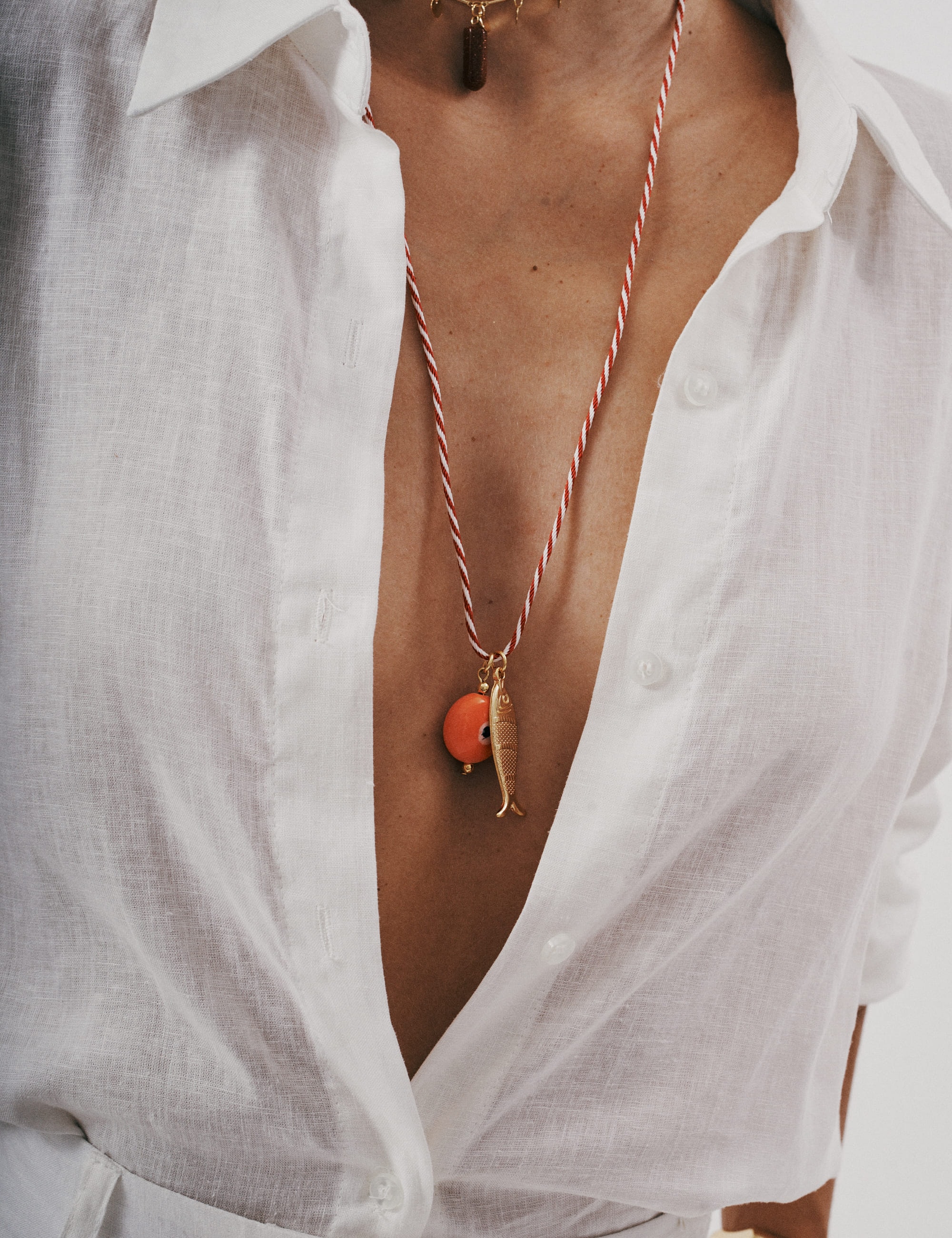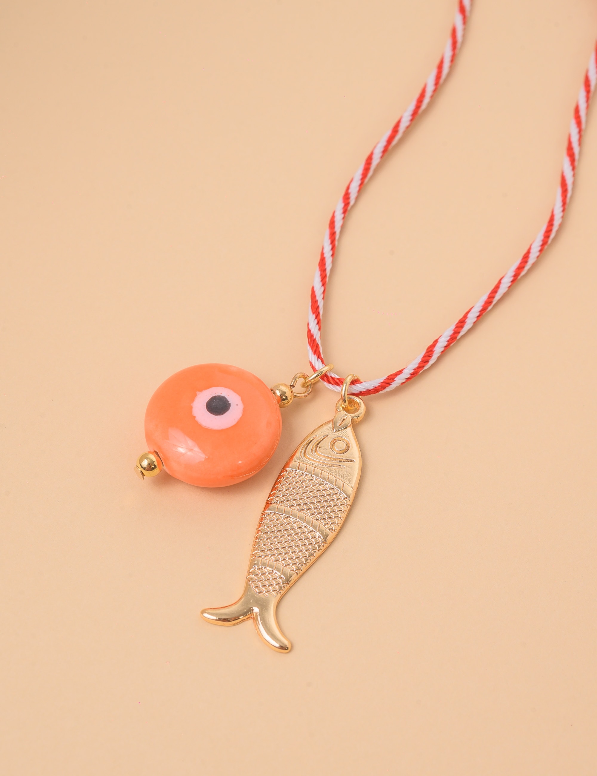Colar com cordão torcido e pingente de peixe banhado a ouro com detalhe de olho grego laranja. Uma peça moderna e vibrante, ideal para destacar o visual com elegância e um toque de proteção.