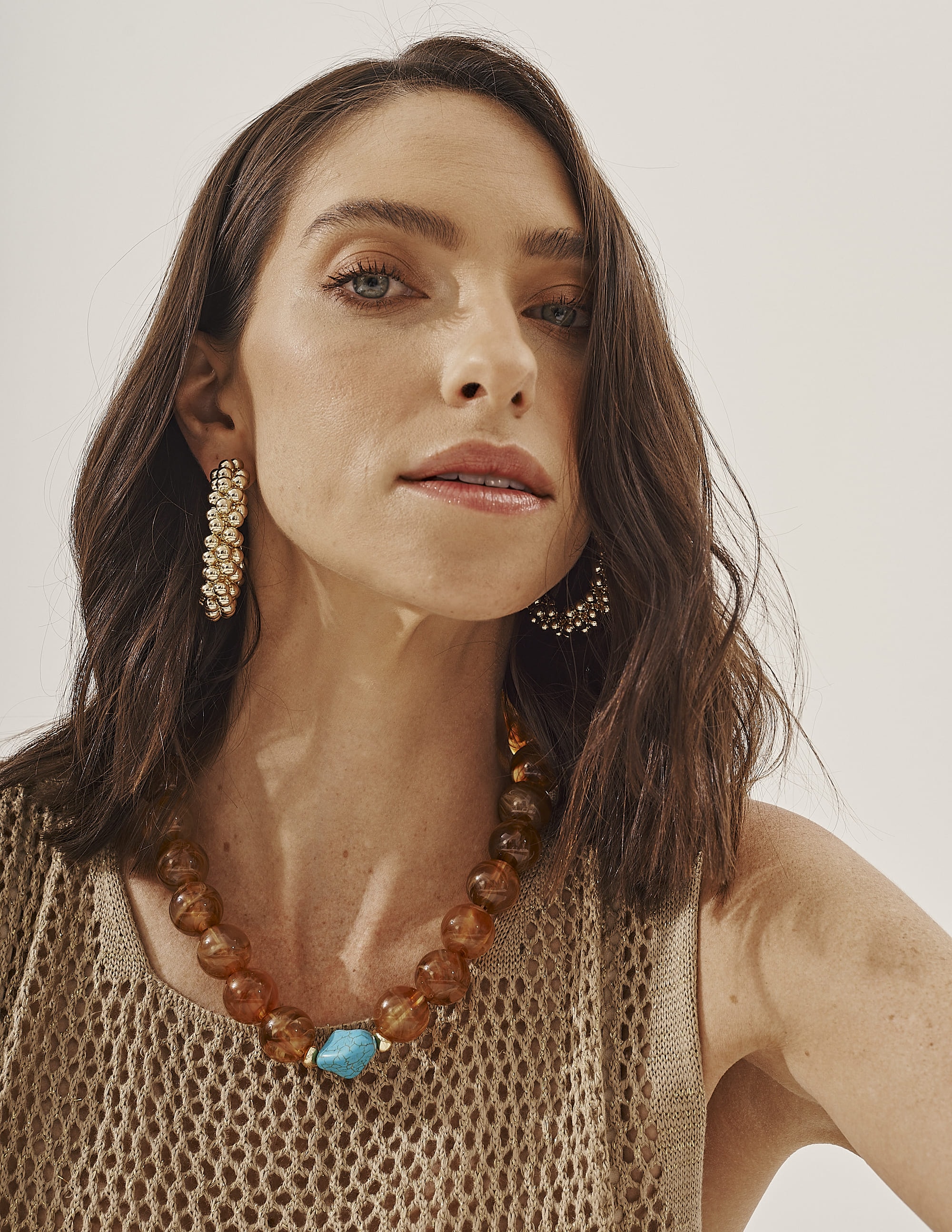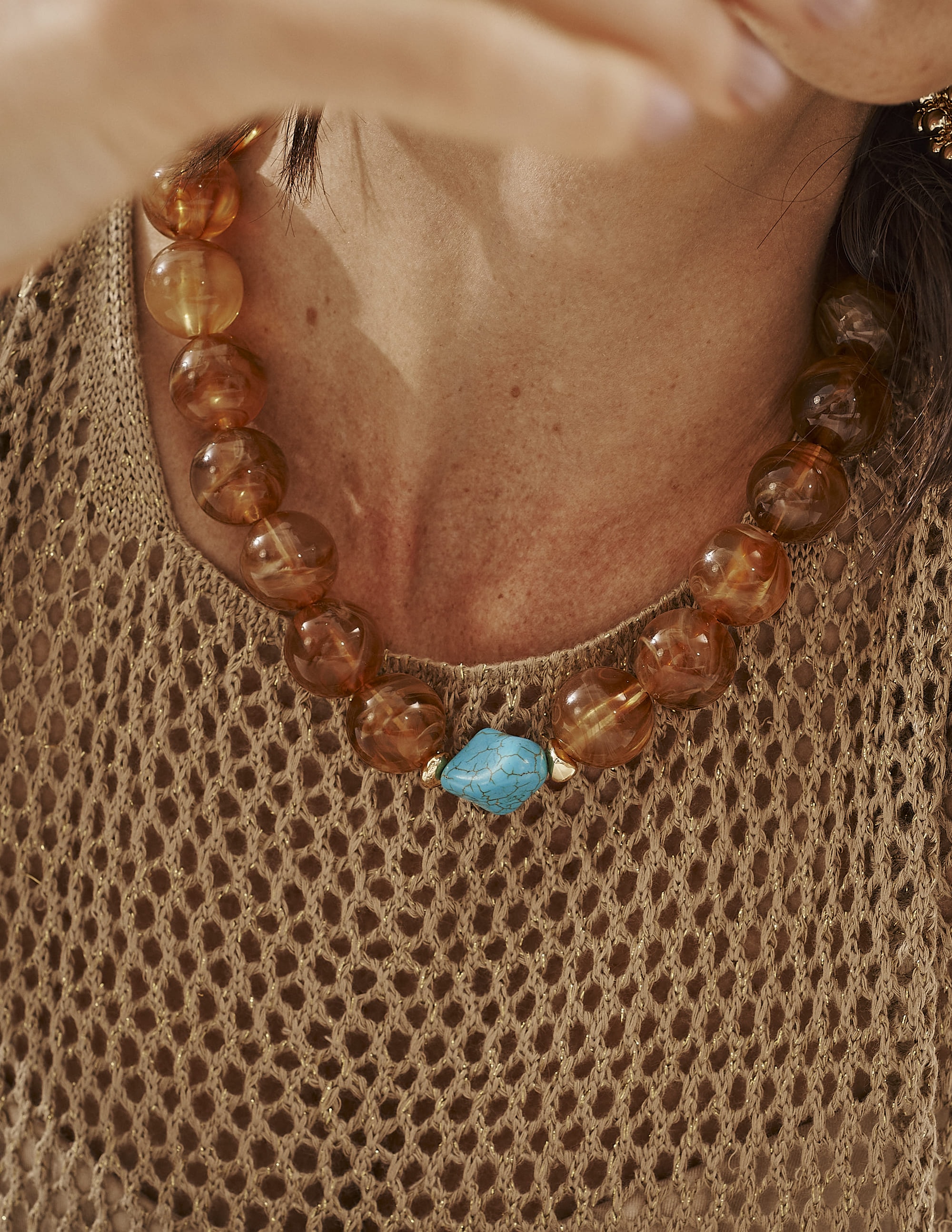 Colar de esfera âmbar com pedra turquesa howlita, trazendo um visual moderno e descontraído. O acessório combina estilo casual com acabamento sofisticado, valorizando qualquer produção com um brilho imponente.
