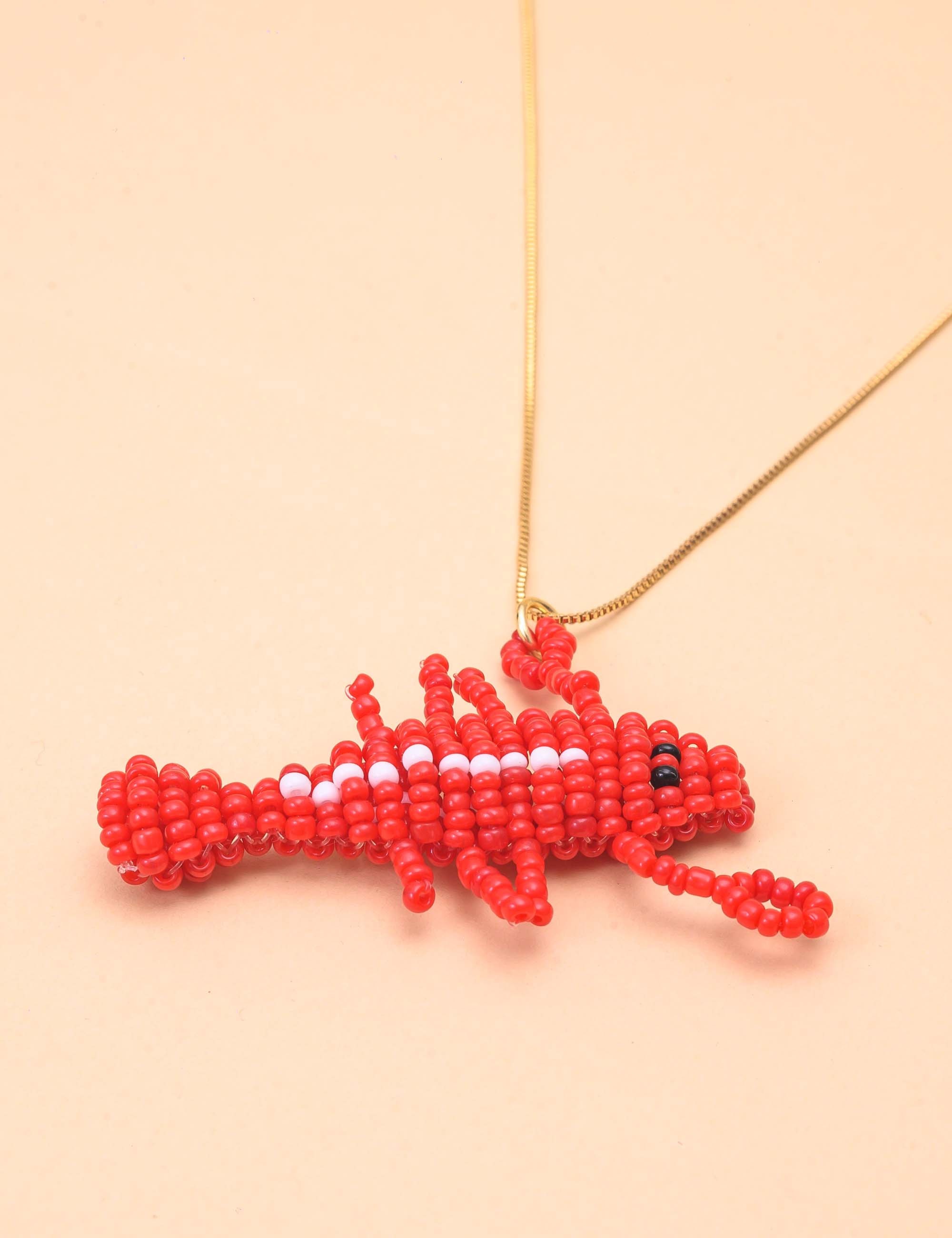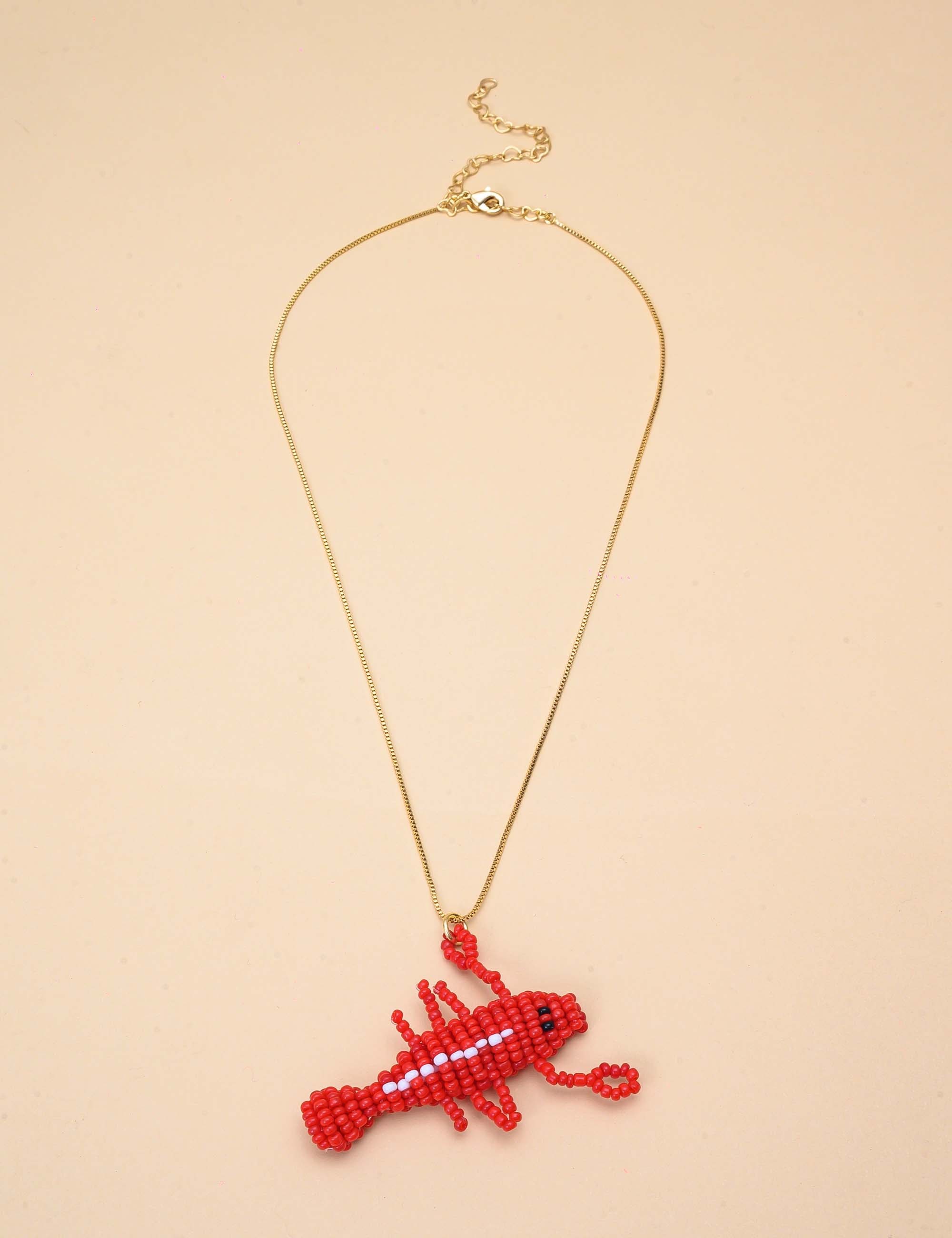 Colar banhado a ouro com pingente em miçangas formando uma lagosta, peça versátil que agrega personalidade ao visual.