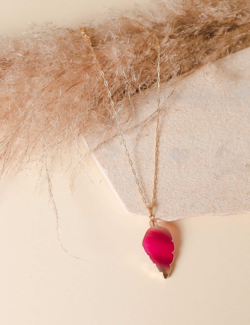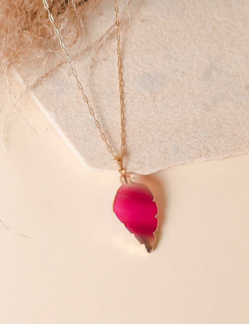 Colar de Pedra Natural, com formato de folha. corrente Cartier, fecho lagosta, pingente de pedra natural ÁGATA PINK, pingente podendo variar na largura de 3cm á 5cm e comprimento de 4cm á 8cm, com detalhe metalizado, banhado a ouro com verniz antialérgico. Por ser pedras naturais, podem haver alterações de cor e tamanho em relação as imagens da foto. A beleza da imperfeição traz particularidade em cada pedra natural, tornando ela única. Joias imperfeitas trazem conceito de estilo.