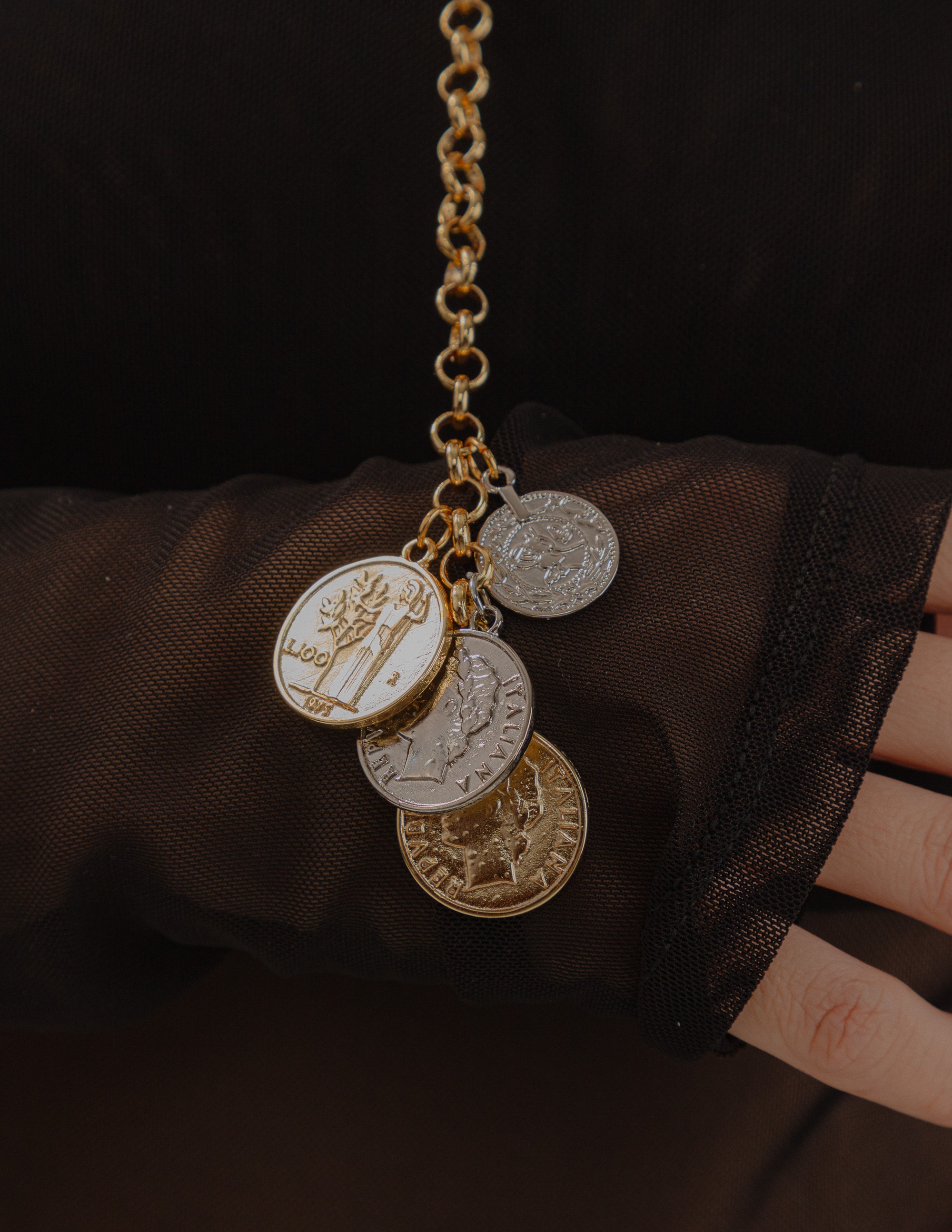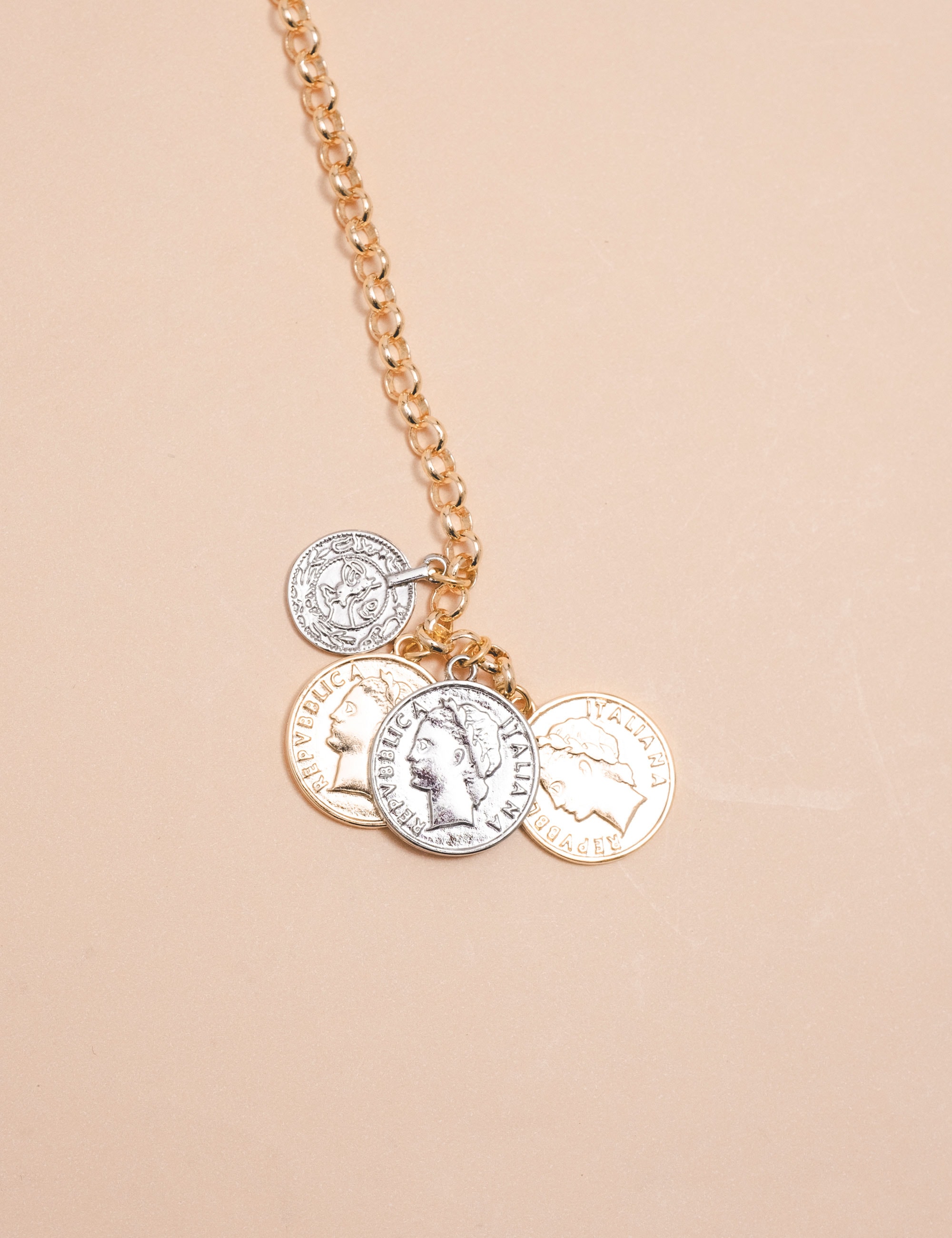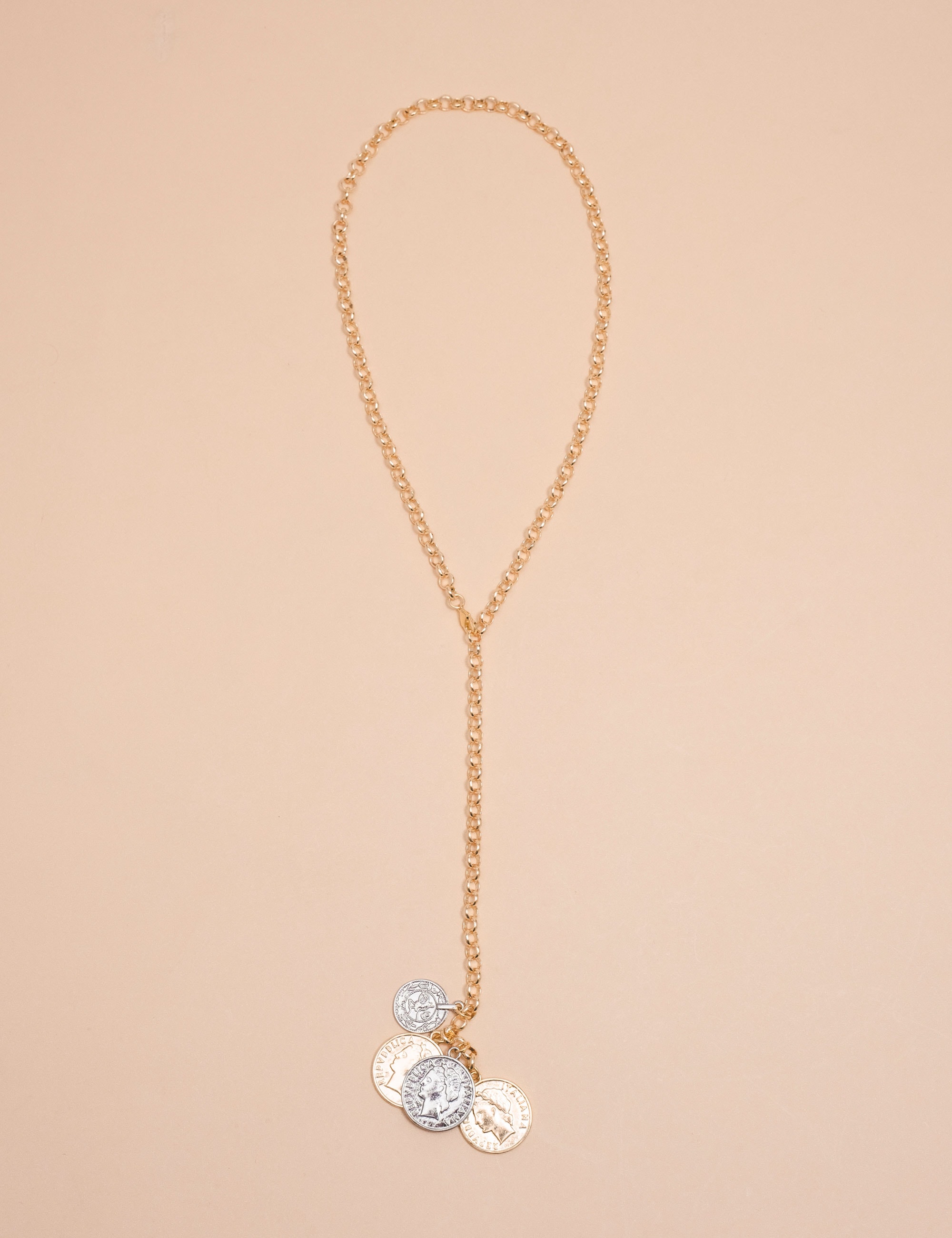 Colar estilo gravata com medalhas em composição duo, trazendo um design moderno e sofisticado em acabamento ouro. O caimento alongado valoriza o colo e proporciona elegância na medida certa, criando um visual contemporâneo e versátil.