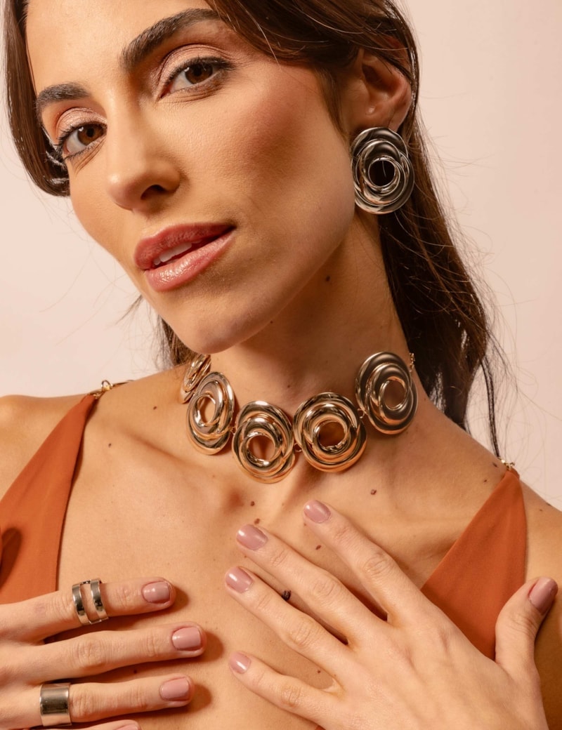 Colar maxi com formato de voltas. Peça de latão, banhado no ouro, verniz e antialérgico. Os colares cada vez mais bem ganhando espaço e destaque no mundo dos acessórios, cada vez mais estilosos e imponentes para traduzir o lado imponente que a mulher traz em sua feminilidade.