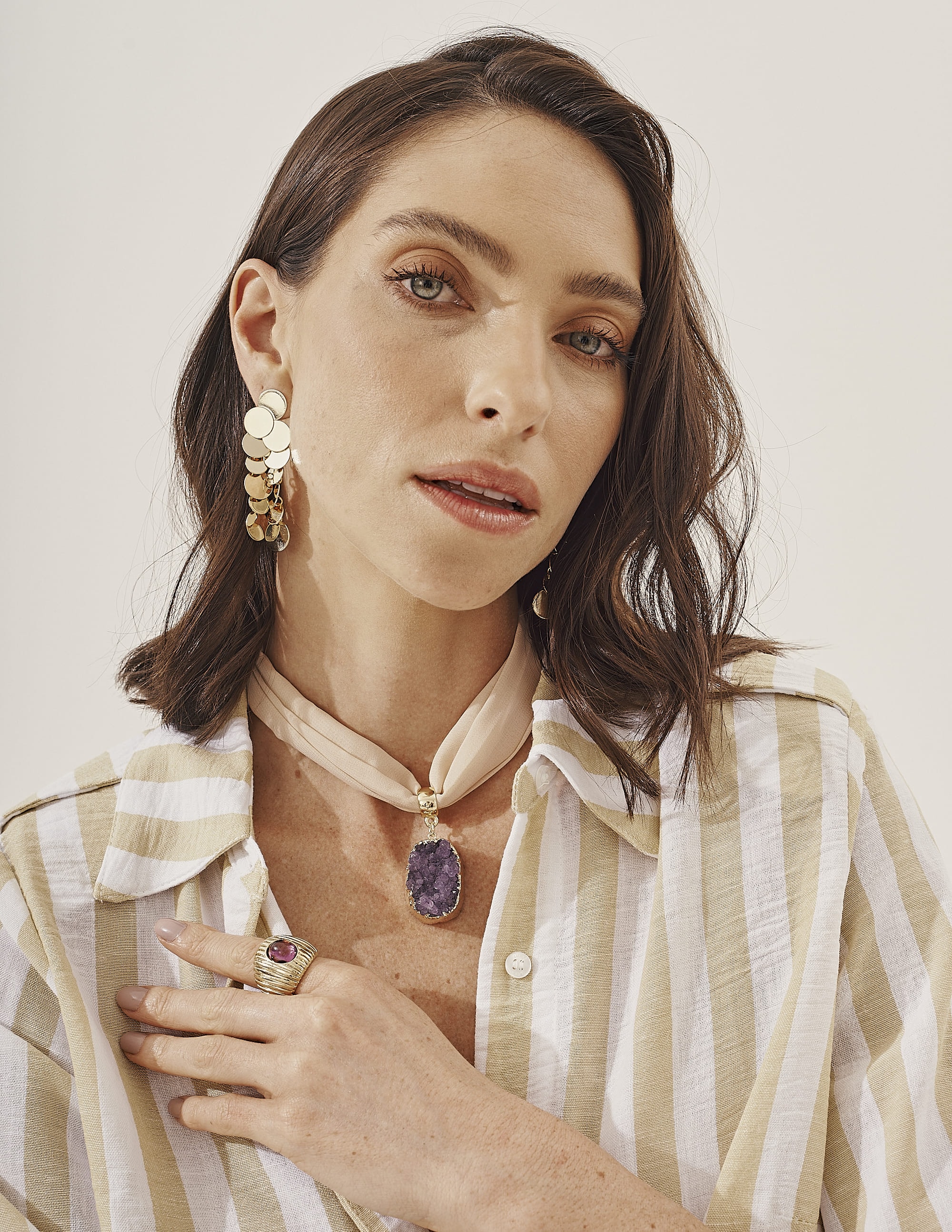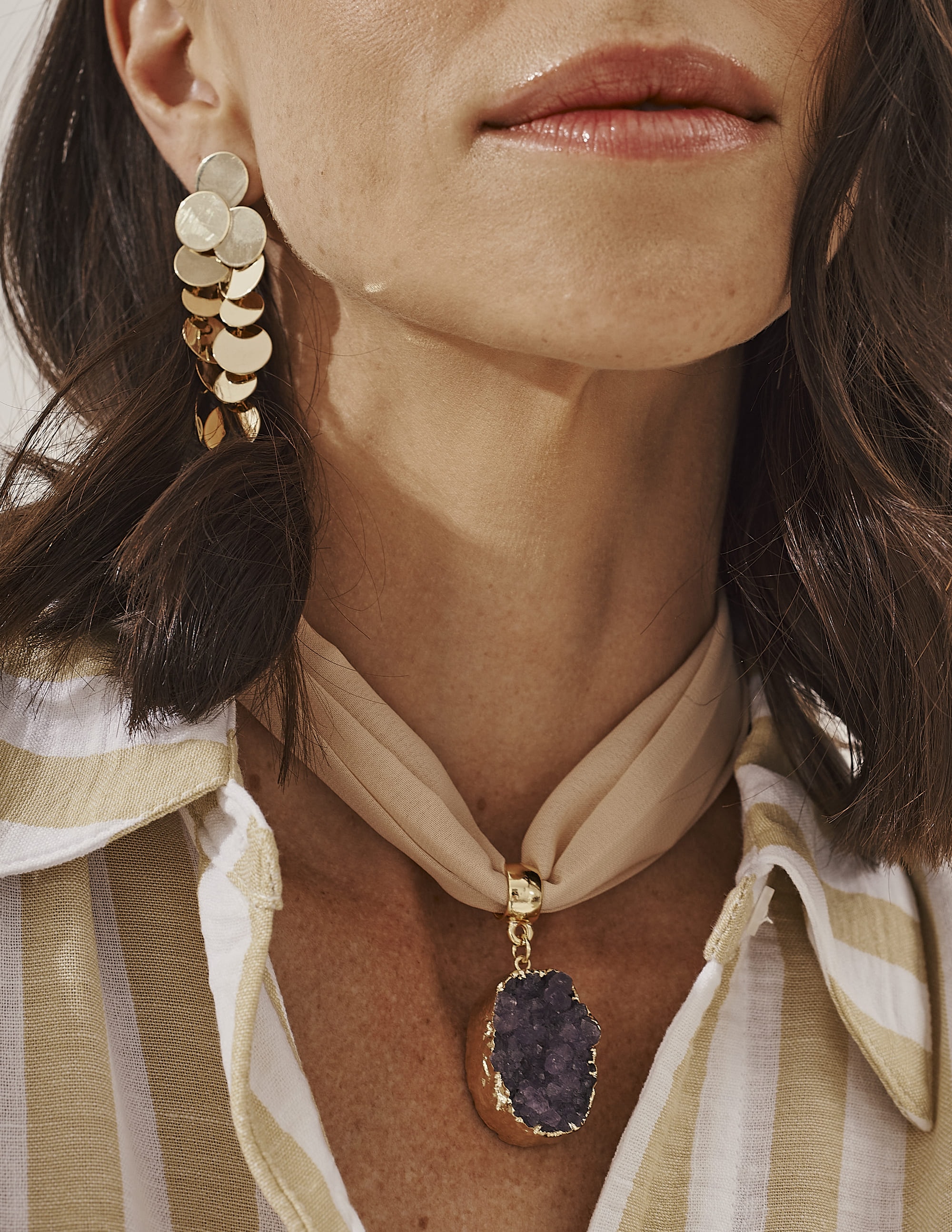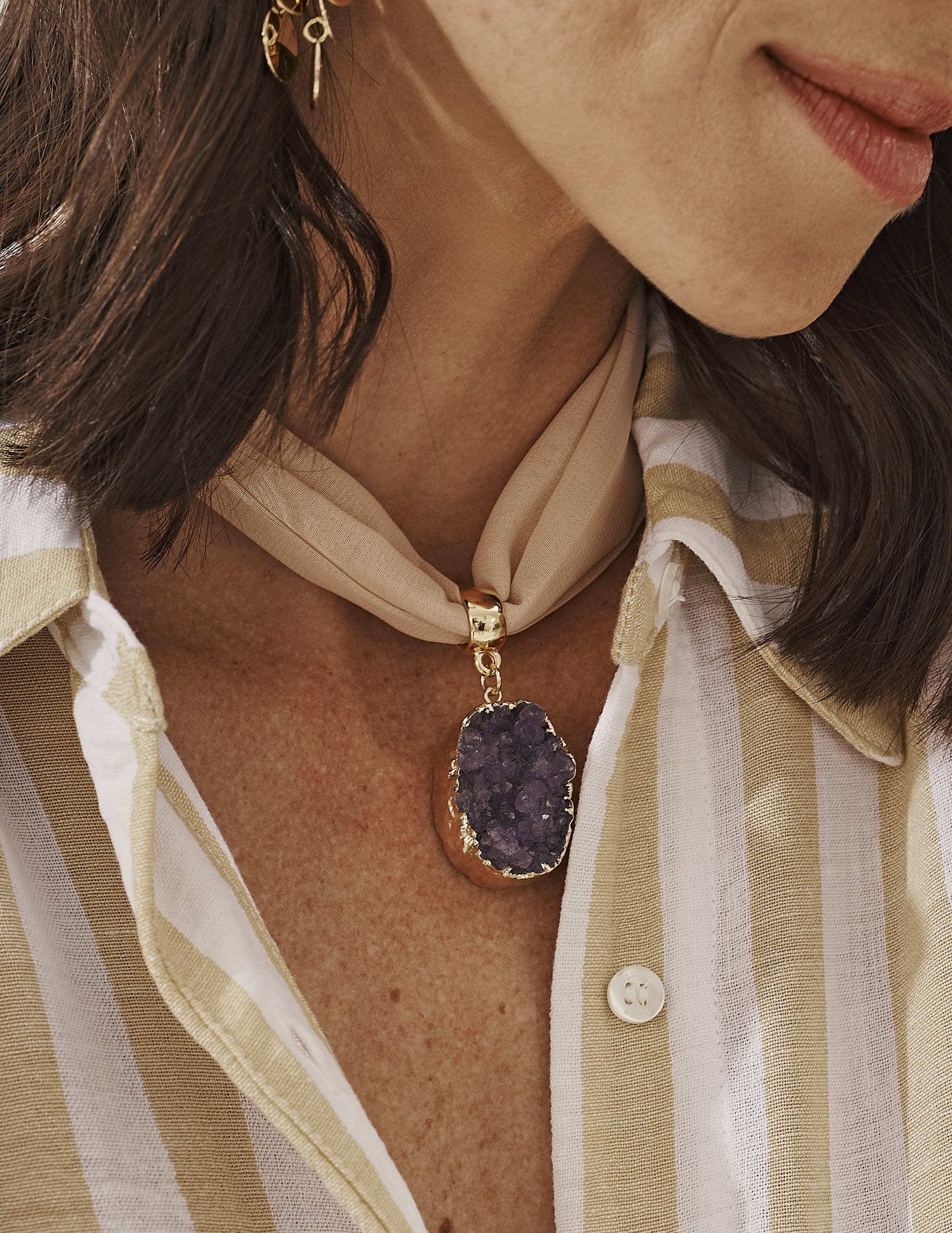 Colar de lenço com pingente de pedra drusa ametista. Uma peça moderna e cheia de charme, com acabamento brilhante e detalhe artístico que destaca o visual com estilo único.