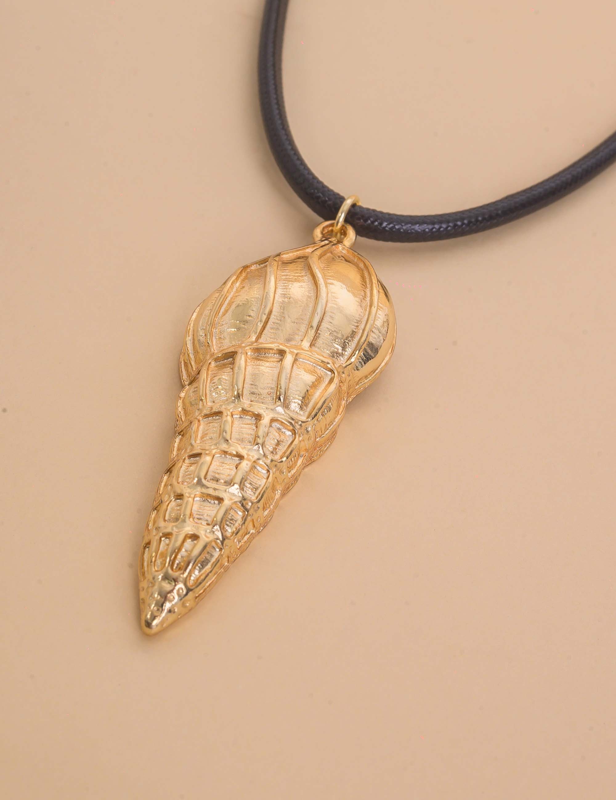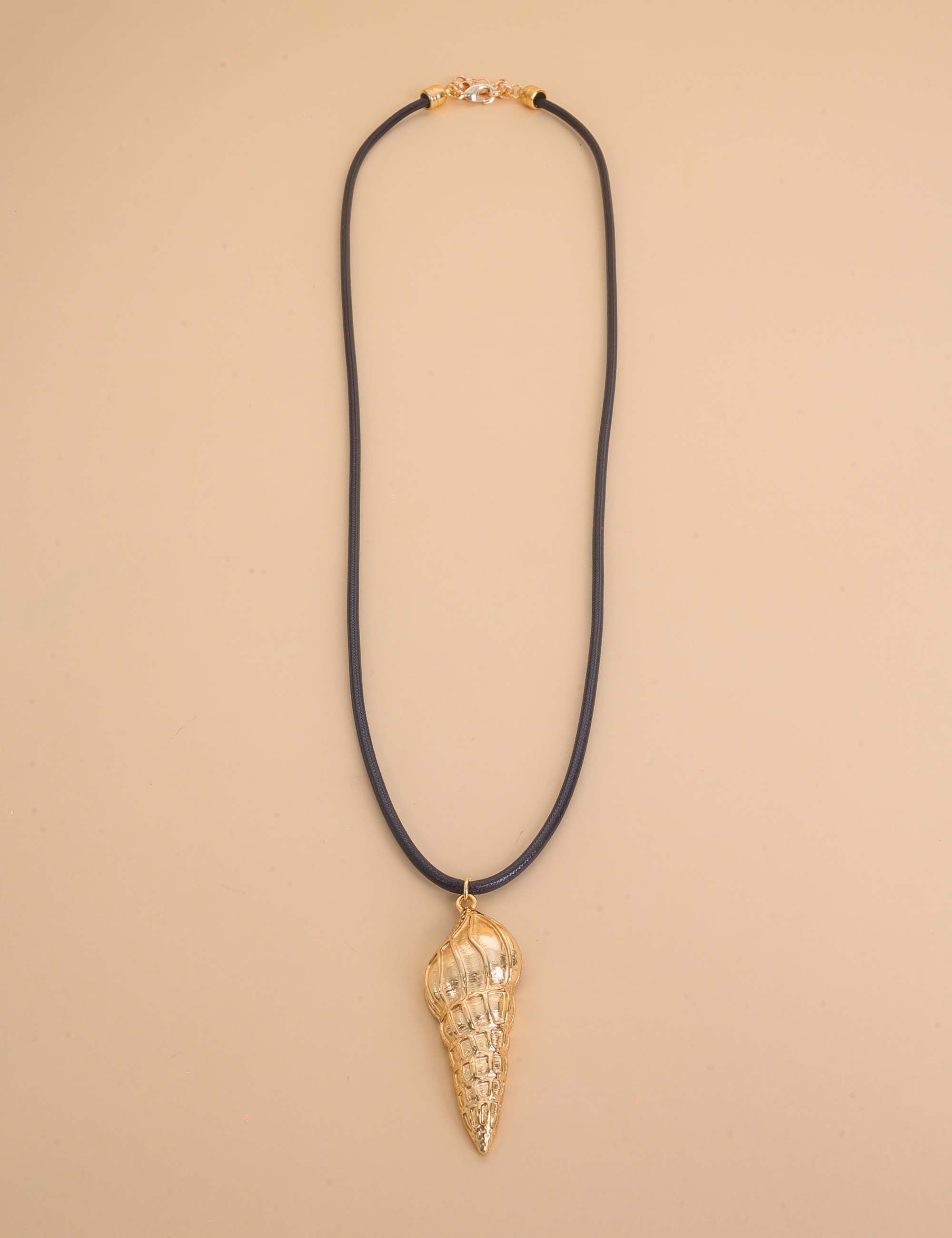 Colar longo de couro sintético, com pingente de ouro em formato de concha. O acessório combina estilo casual com acabamento sofisticado, valorizando qualquer produção com um brilho delicado.