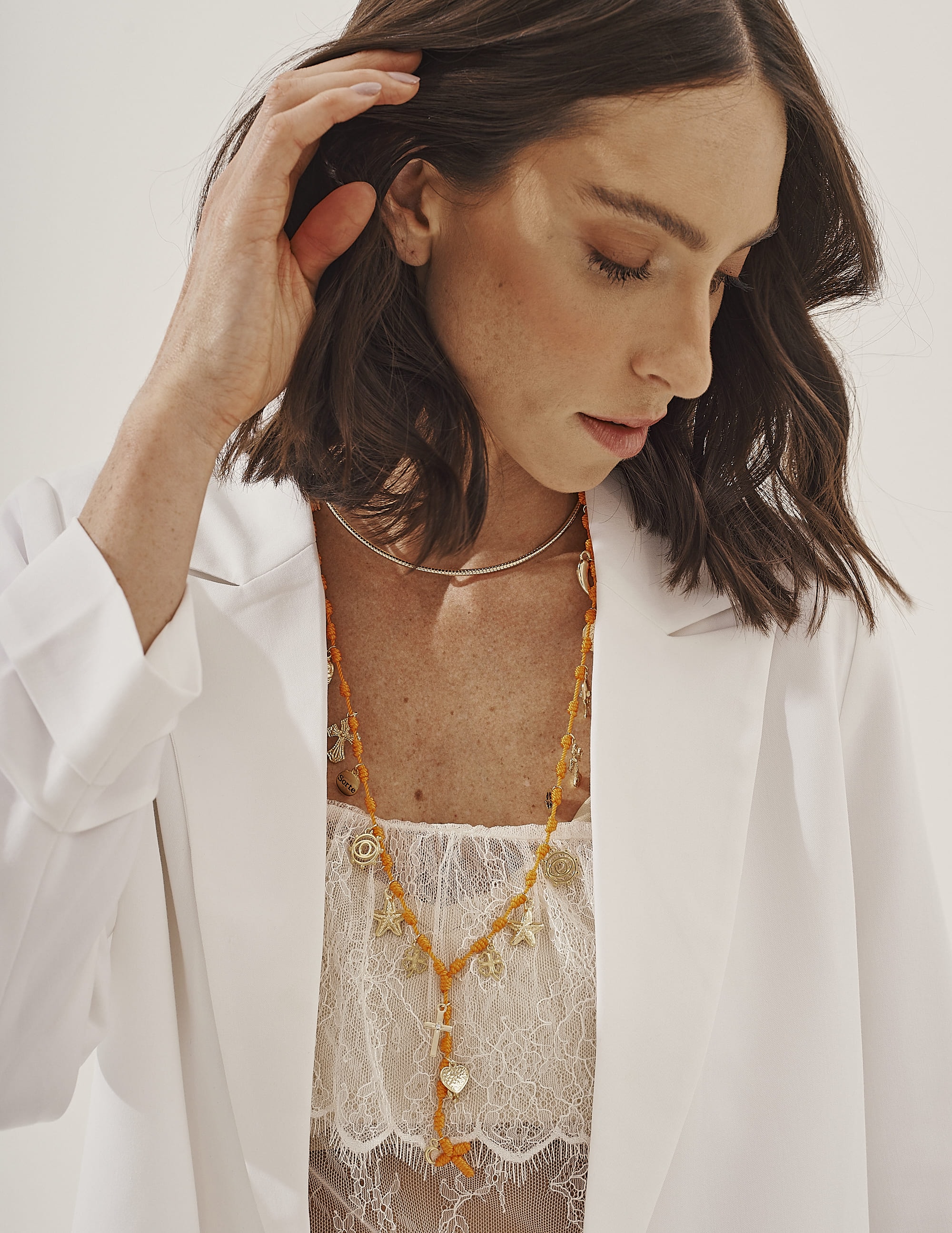 Colar laranja com diversos pingentes dourados, moderno e cheio de charme para realçar qualquer look.