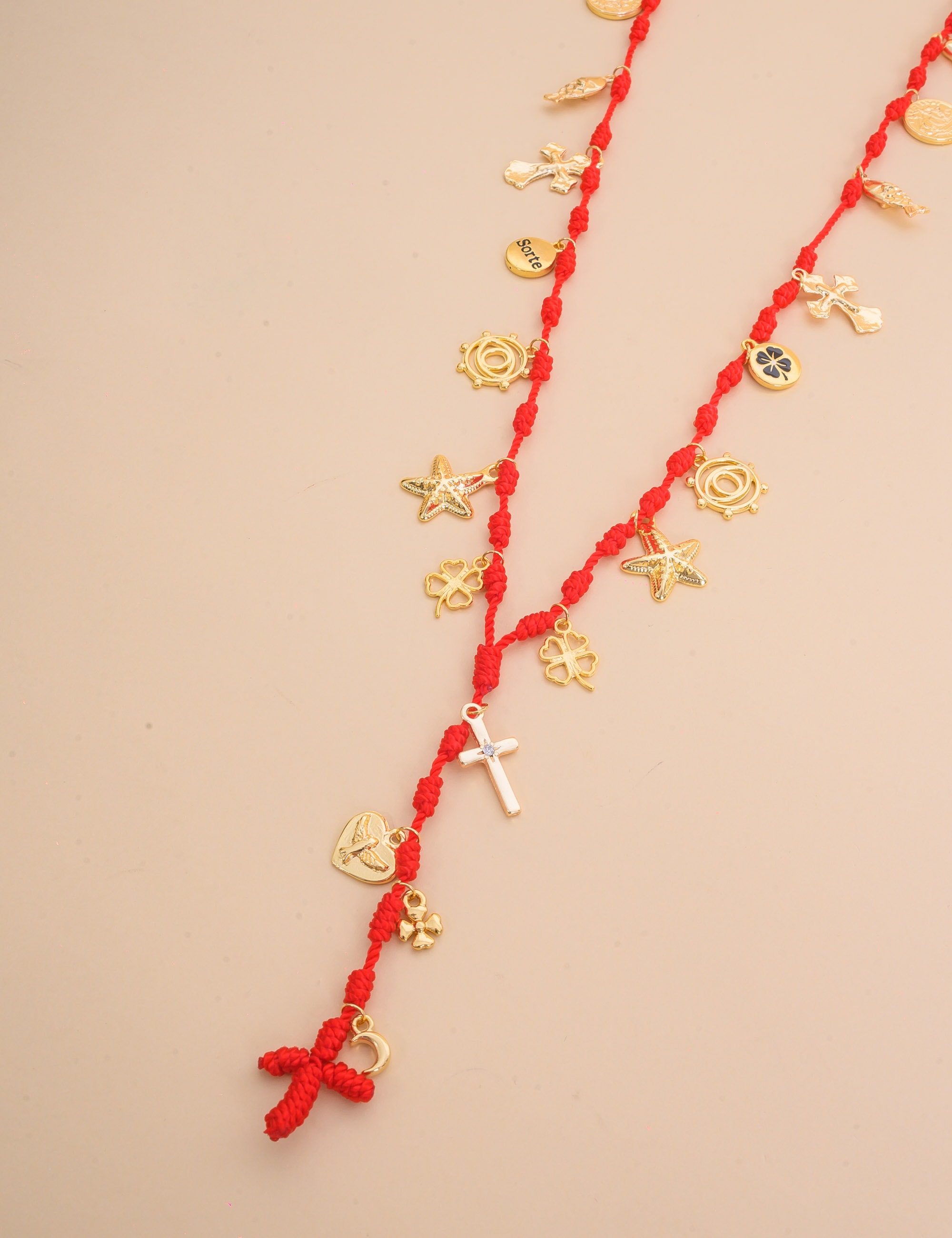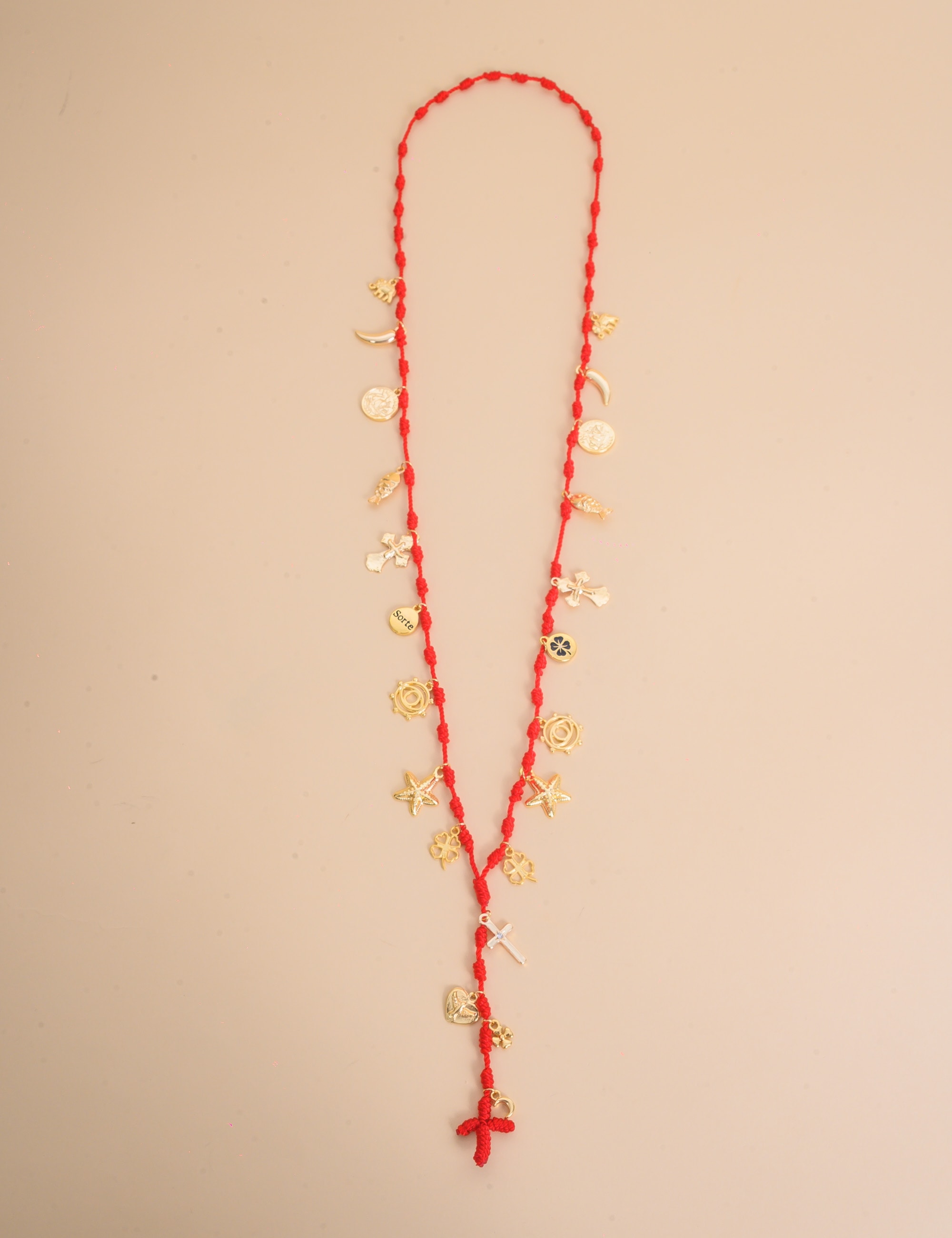 Colar vermelho com diversos pingentes dourados, moderno e cheio de charme para realçar qualquer look.