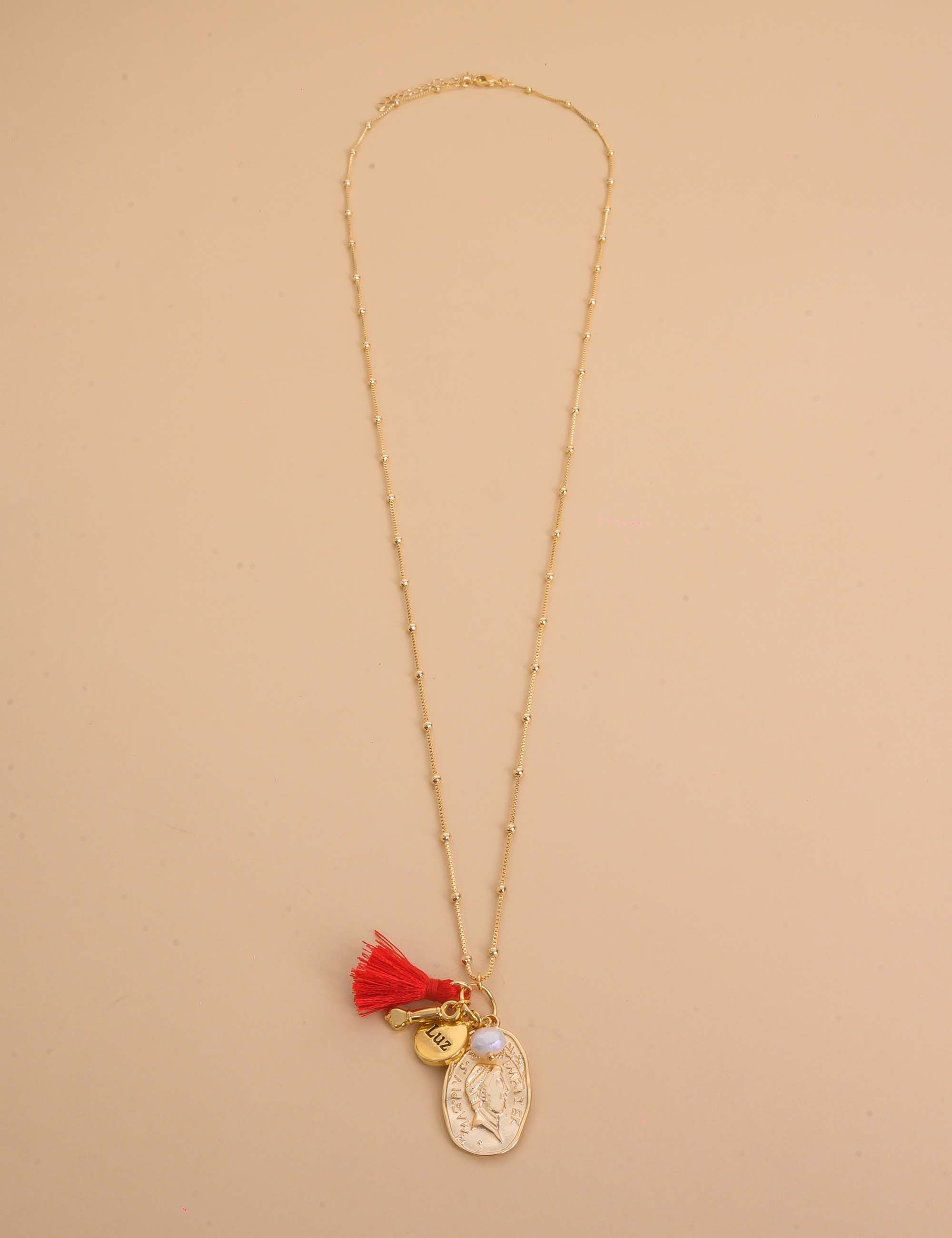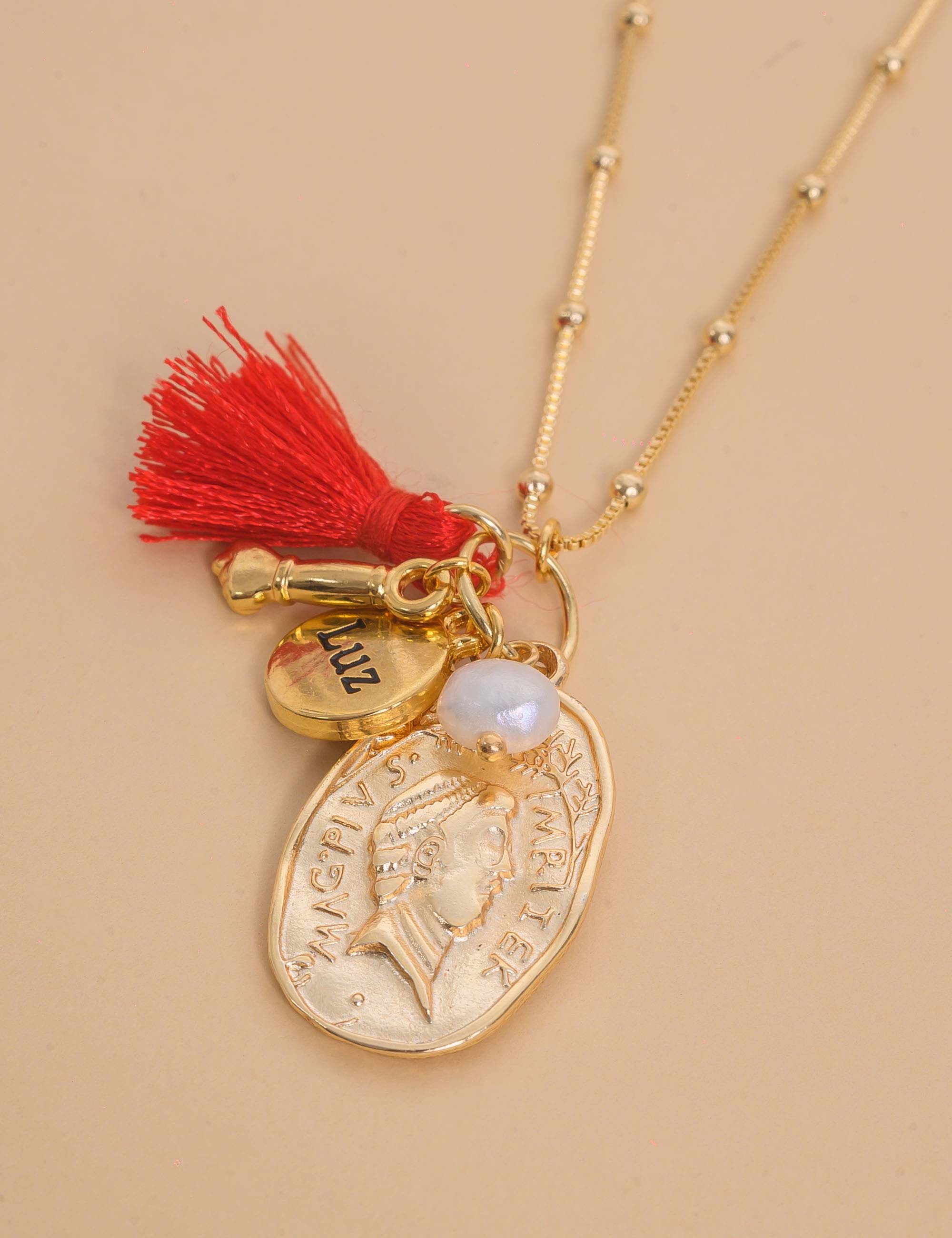 Pingente: Moeda - Paz - Figa - Tassel Vermelho - Pérola