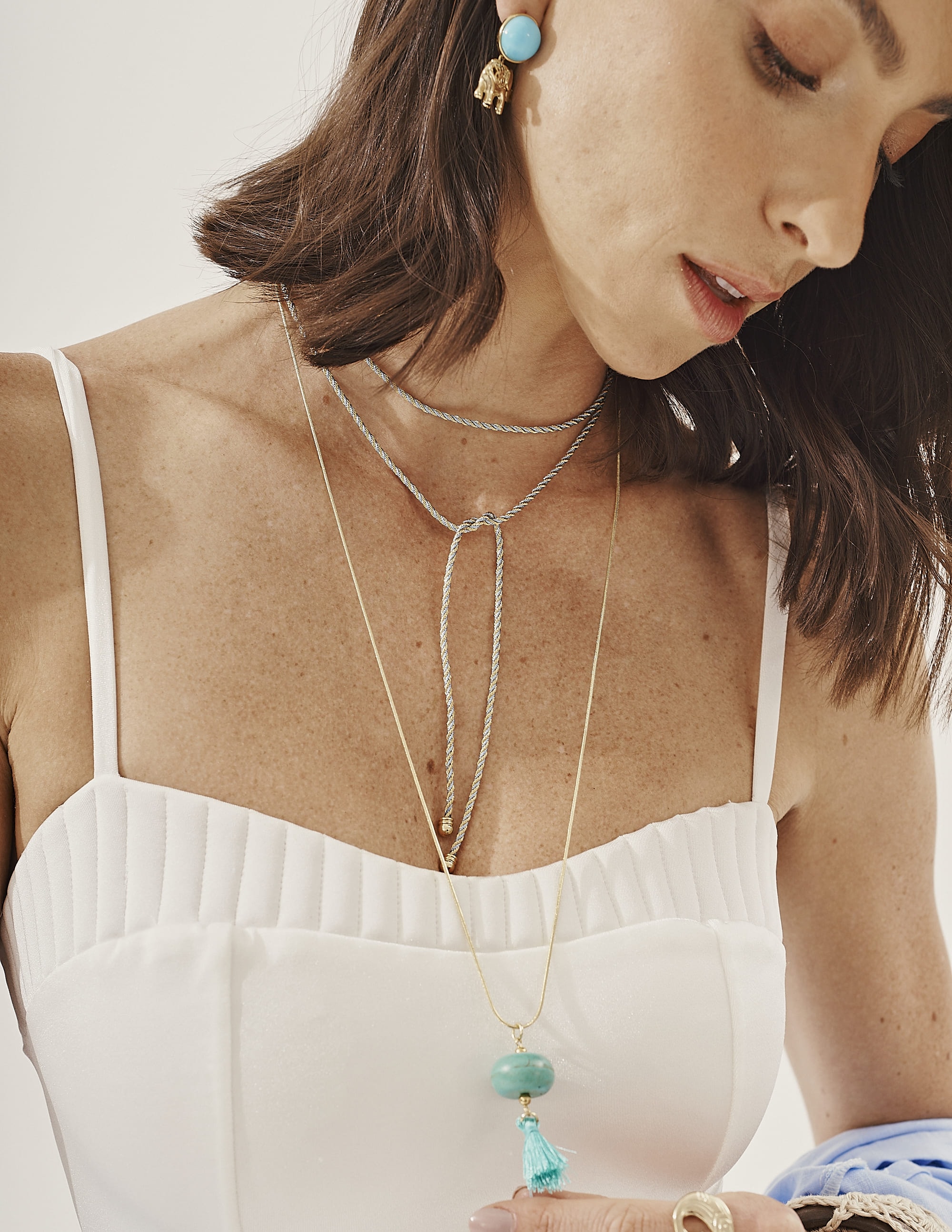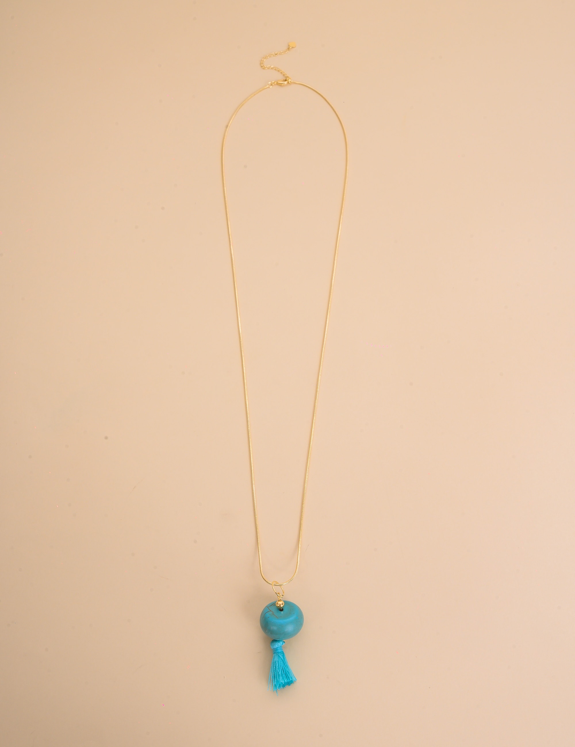 Colar de ouro, pingente tassel azul turquesa, trazendo um visual moderno e descontraído. O acessório combina estilo casual com acabamento sofisticado, valorizando qualquer produção com um brilho delicado.