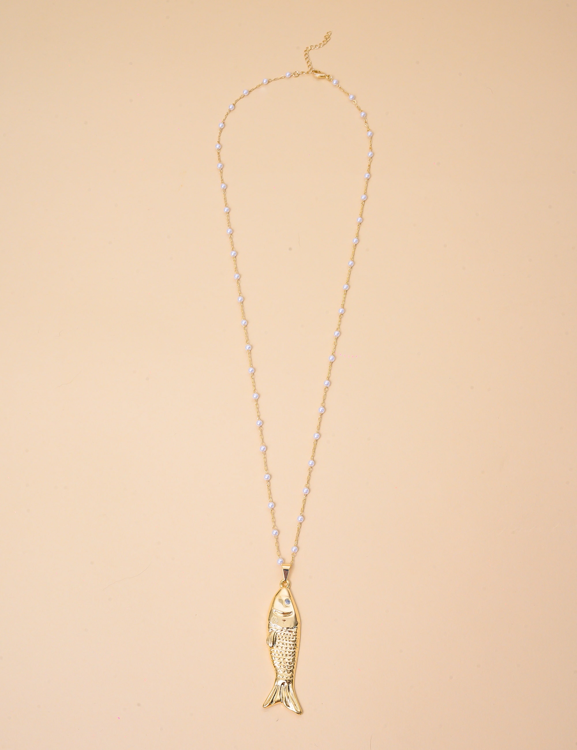 Colar banhado a Ouro com pérolas delicadas e pingente de peixe, unindo elegância e leveza em uma peça cheia de charme.