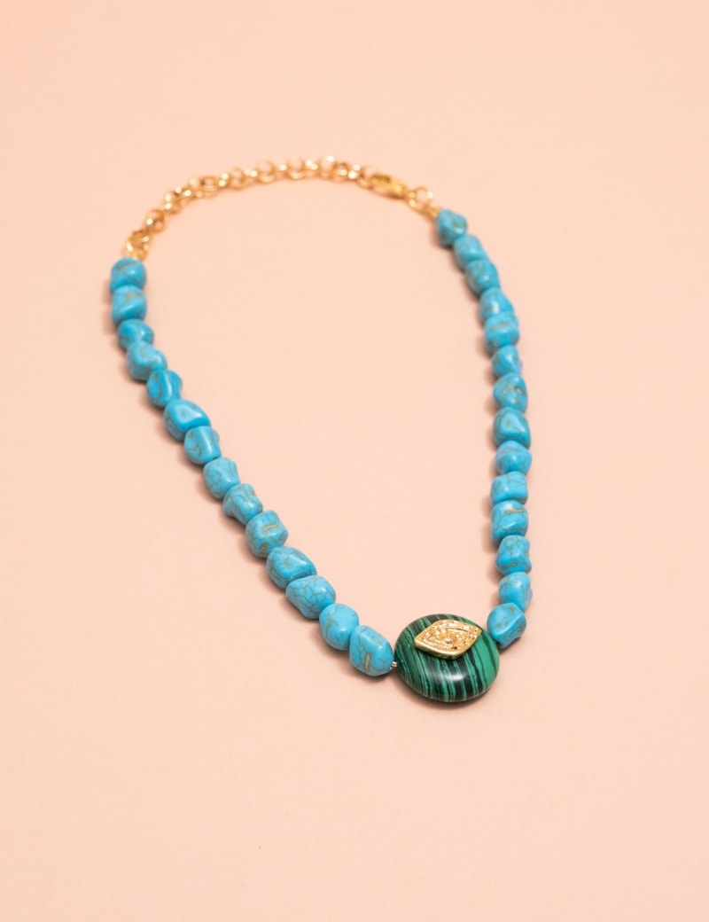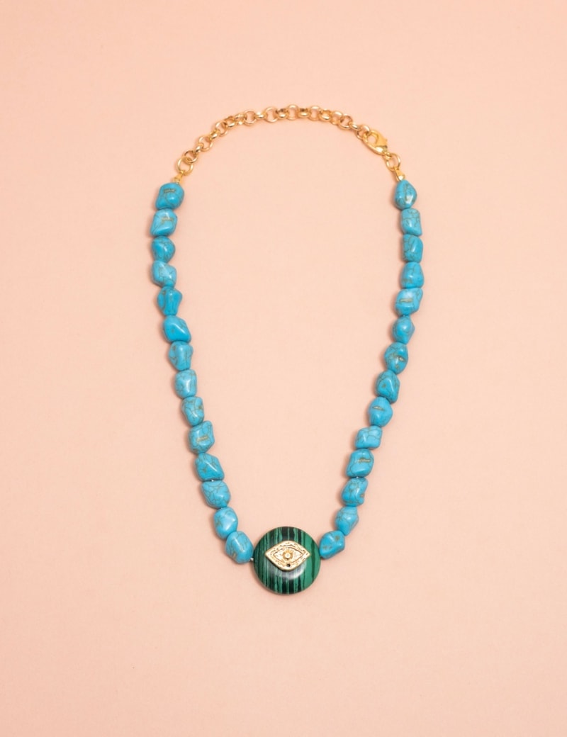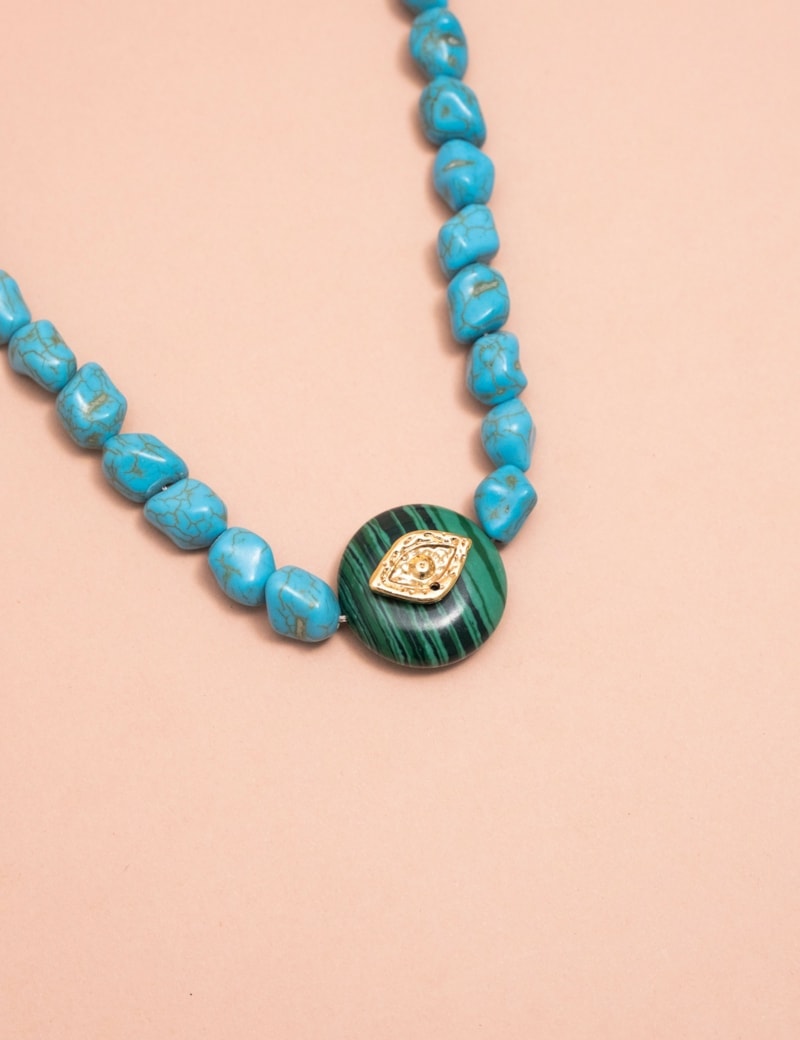 Peça: Colar banhado a ouro, pedra natural malaquita e turquesa com detalhes de olho grego, perfeito para adicionar um toque de elegância e feminilidade a qualquer visual. Proporcionando um charme delicado e sofisticado que complementa tanto trajes formais quanto casuais.