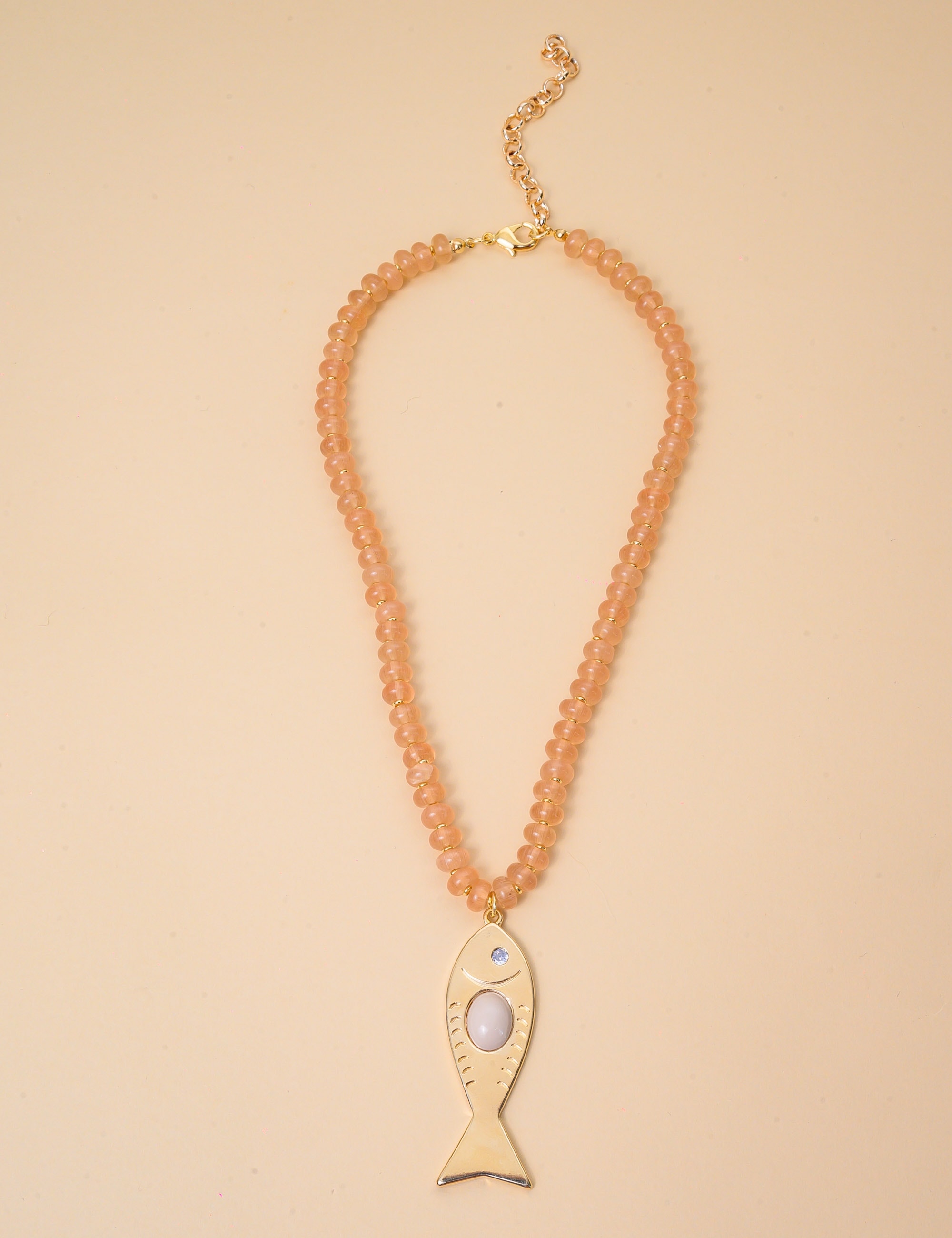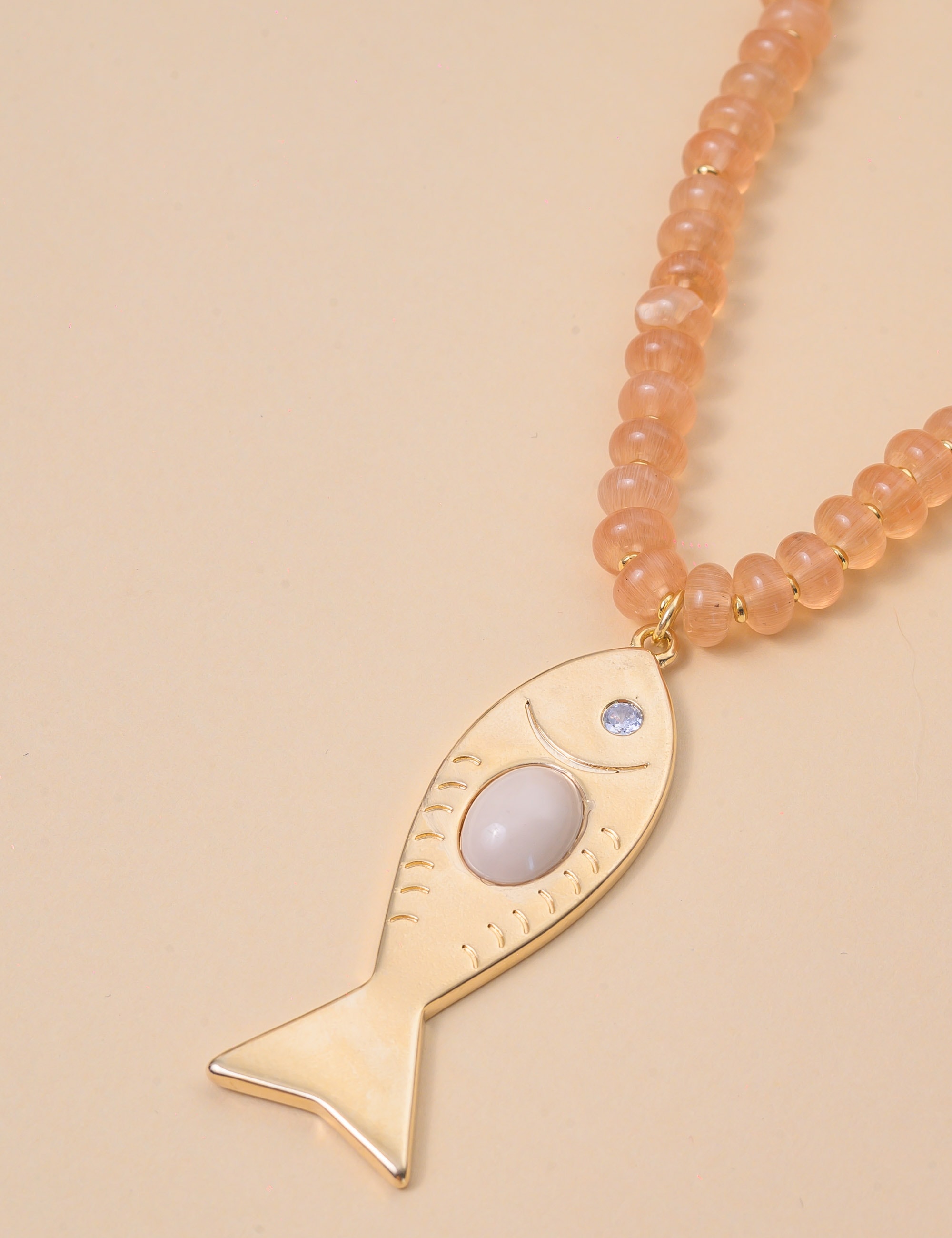 Colar com pedra bege e brilho delicado, trazendo um toque leve e sofisticado ao visual. Ideal para compor produções elegantes com inspiração natural.