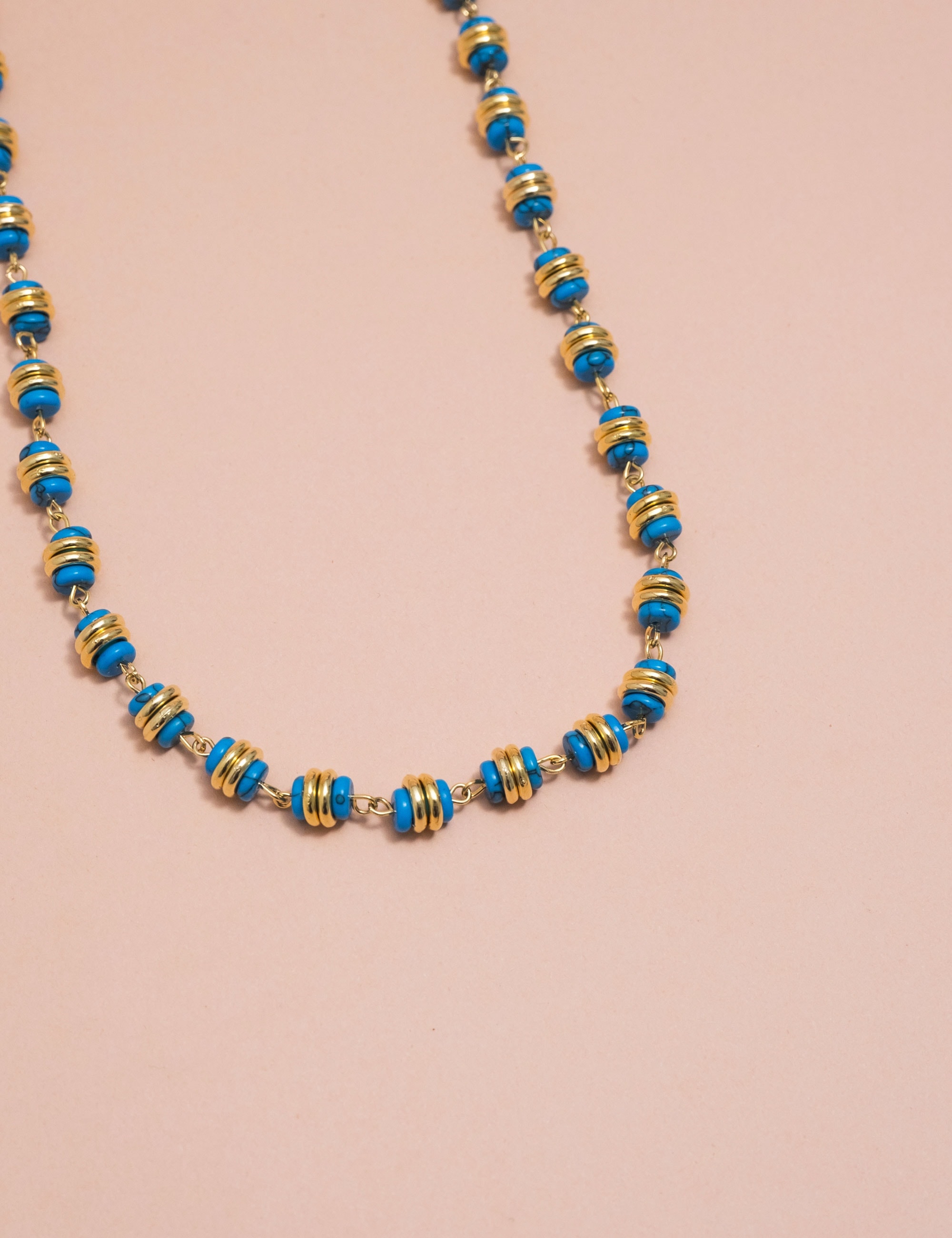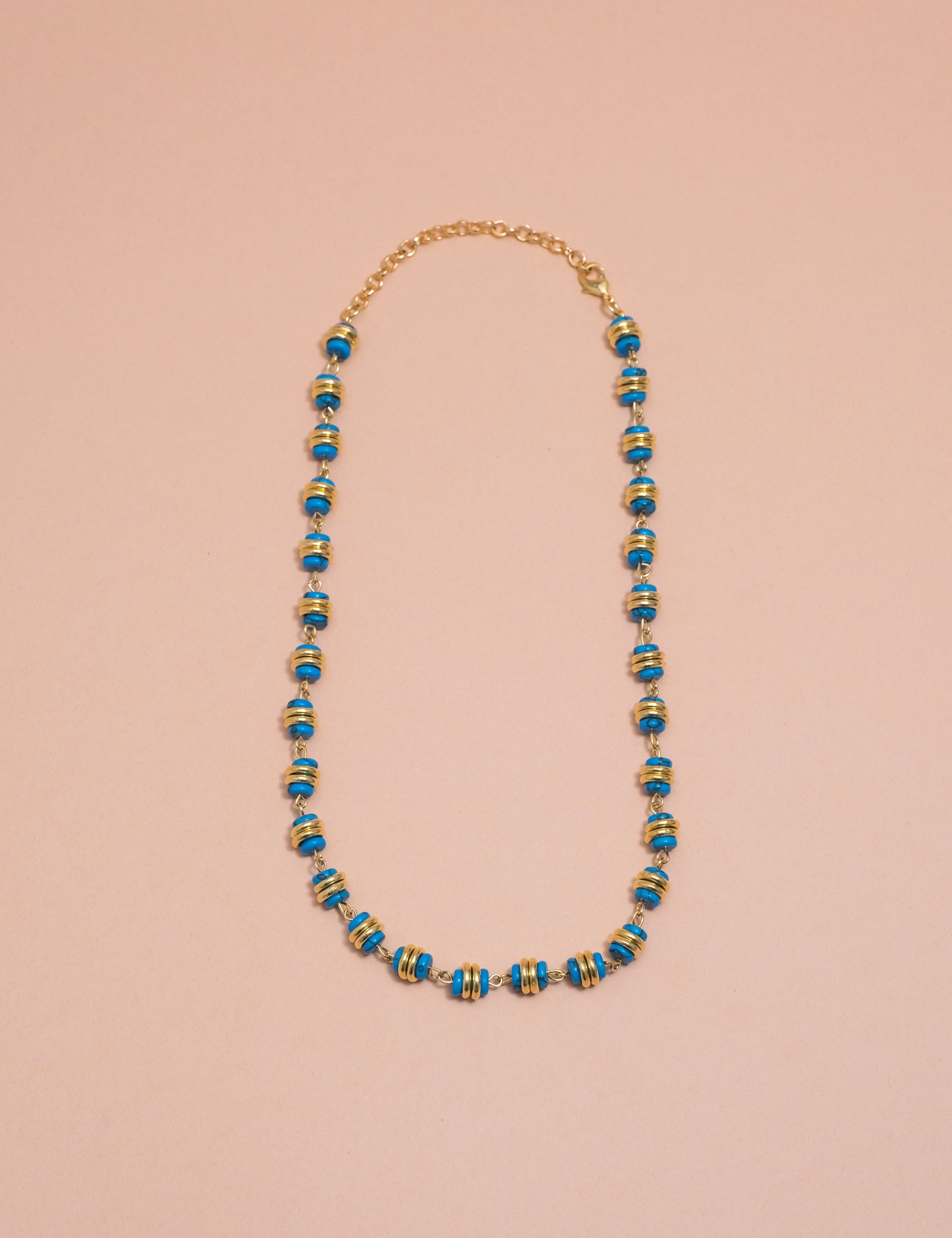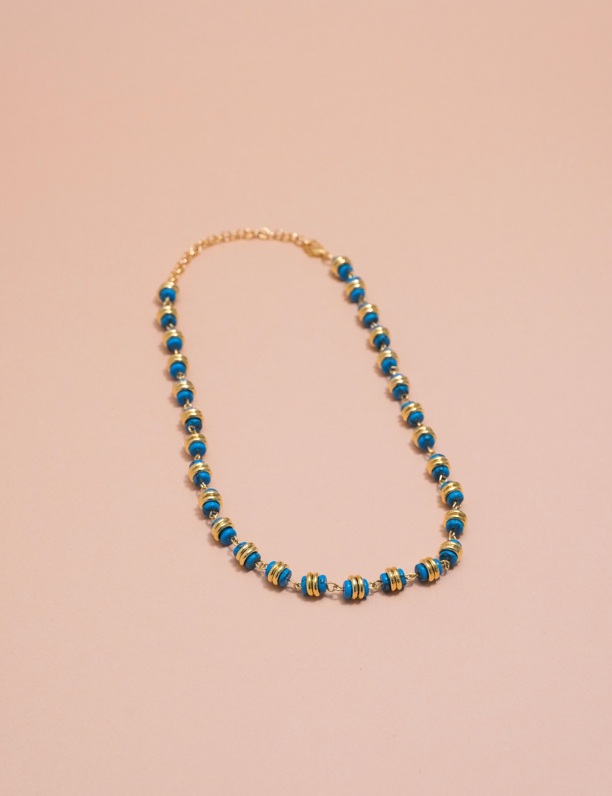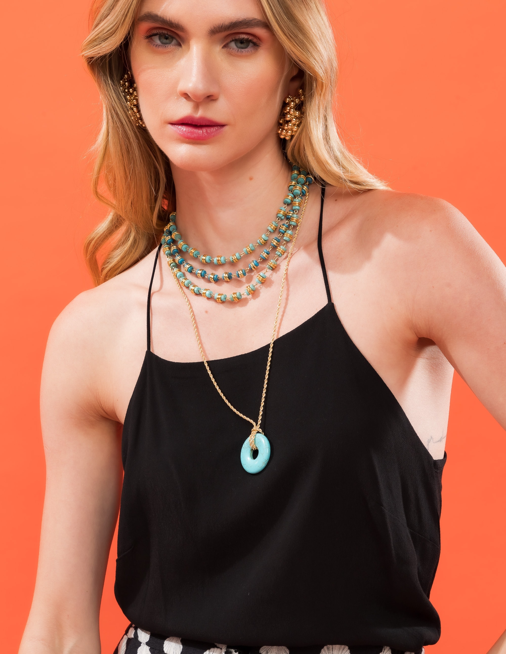 Peça: Envolva-se em estilo e serenidade com o nosso deslumbrante colar turquesa. Esta peça única combina a sofisticação dos canutilhos delicadamente entrelaçados com a vibrante beleza da pedra turquesa, criando um acessório que exala charme e elegância.