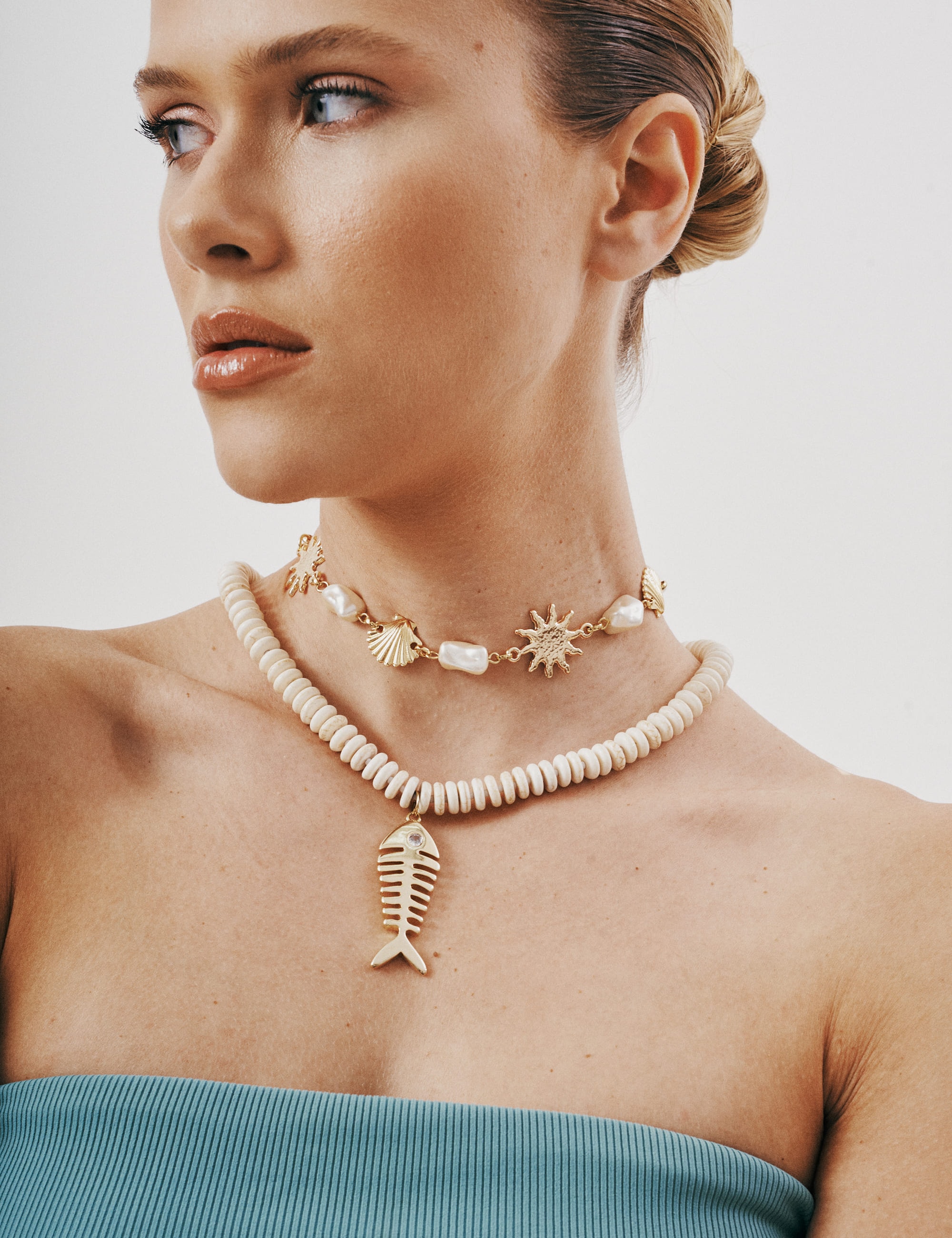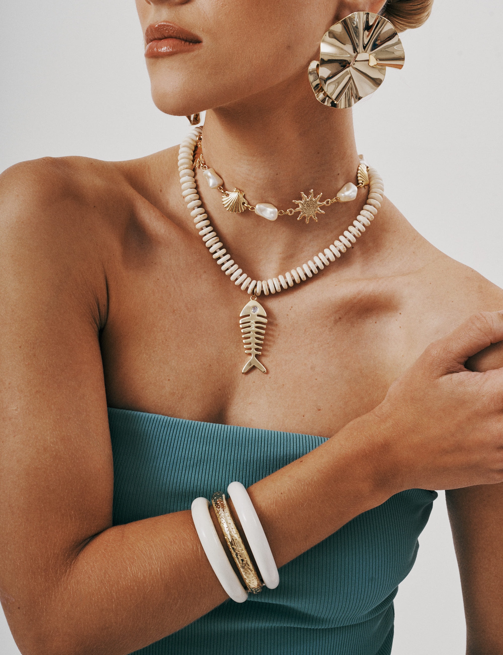 Colar com contas em tom off white e pingente dourado em formato de espinha de peixe, trazendo um toque moderno e descontraído ao visual. O detalhe em pedra cristal adiciona brilho sutil, equilibrando elegância e leveza. Uma peça perfeita para composições praianas ou looks com personalidade e estilo.