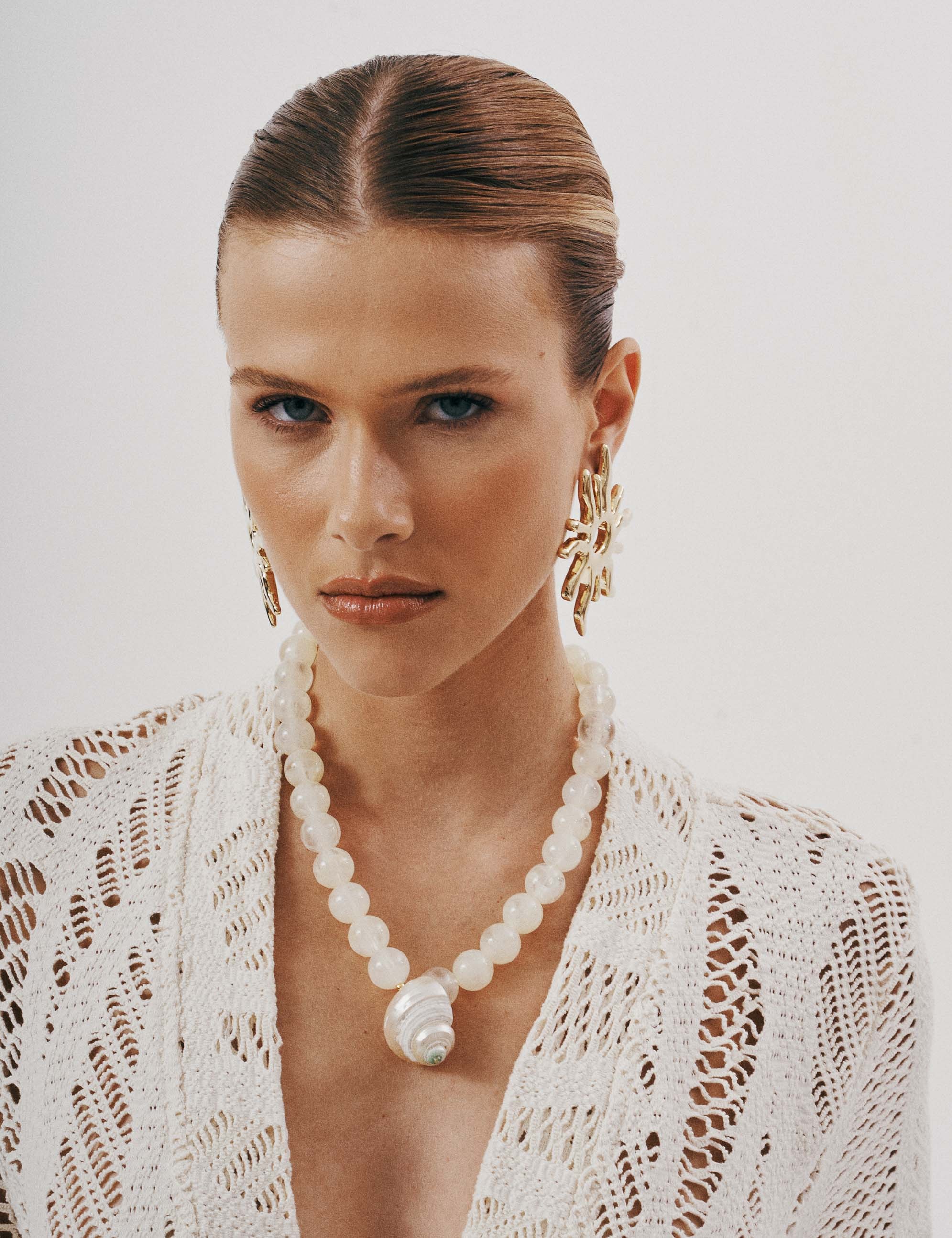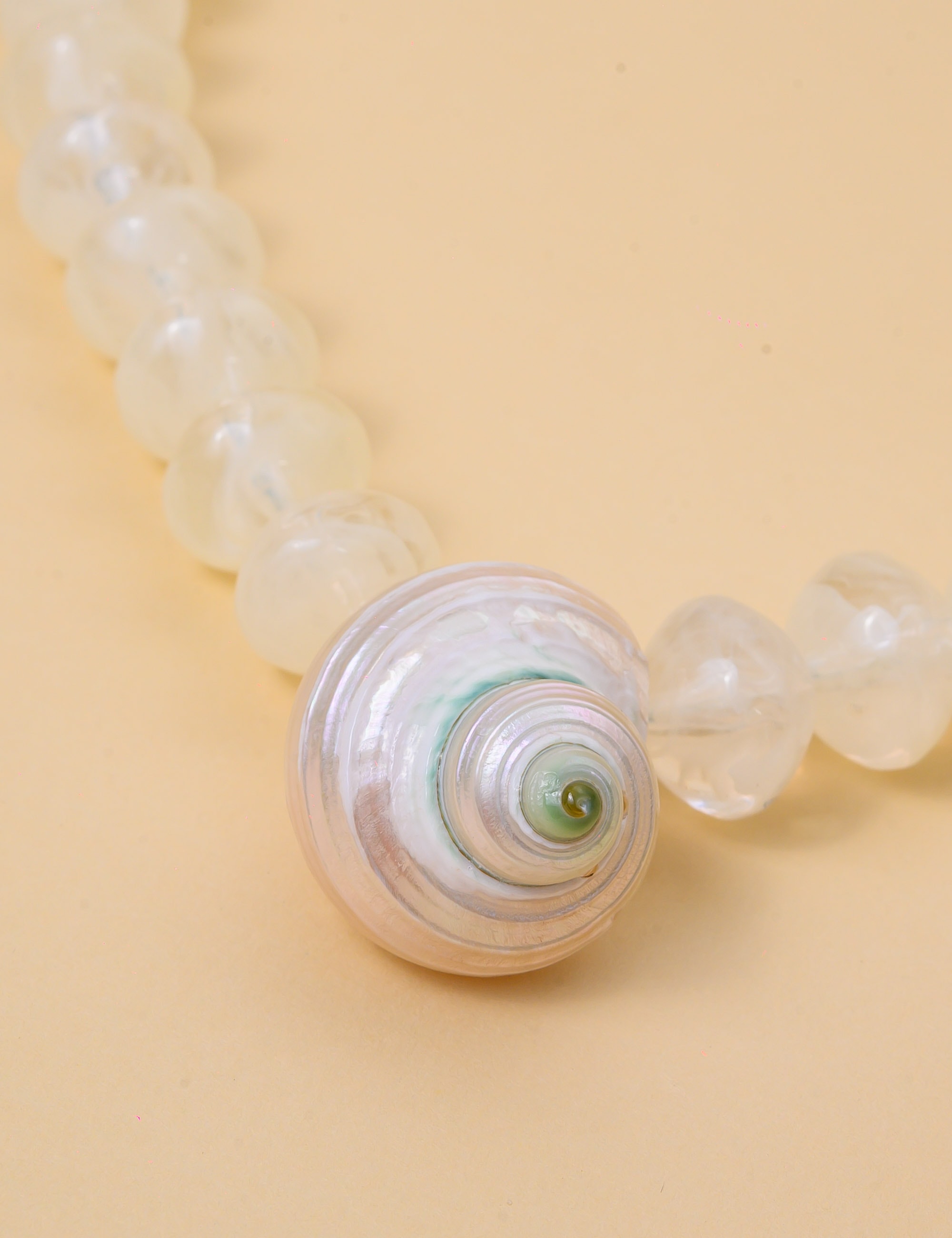 Colar com bolas em resina off white e pingente de caracol, peça marcante que combina leveza e sofisticação para compor diferentes produções.