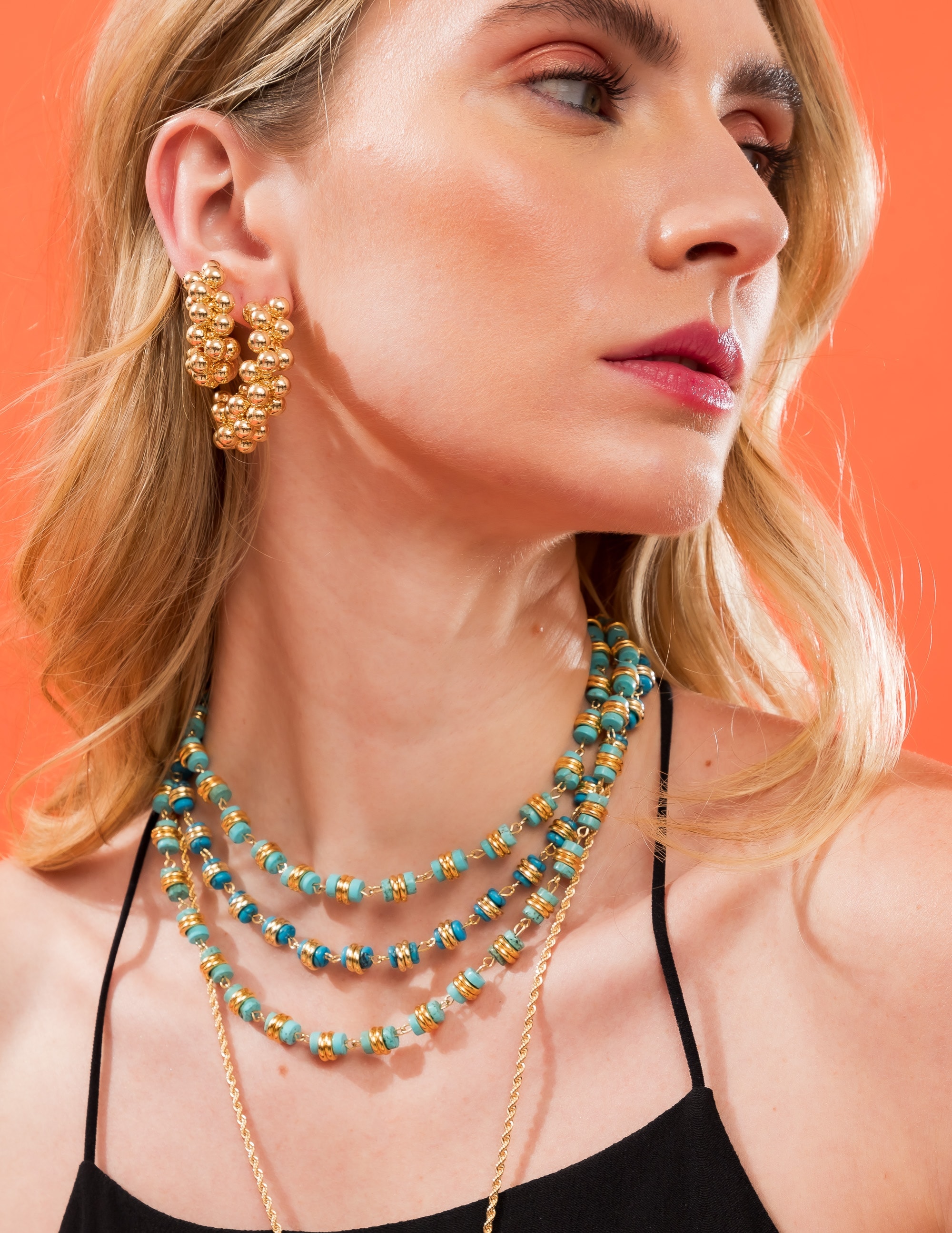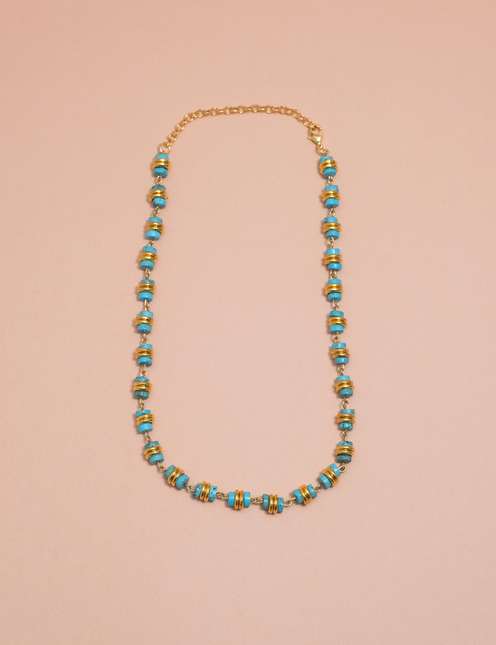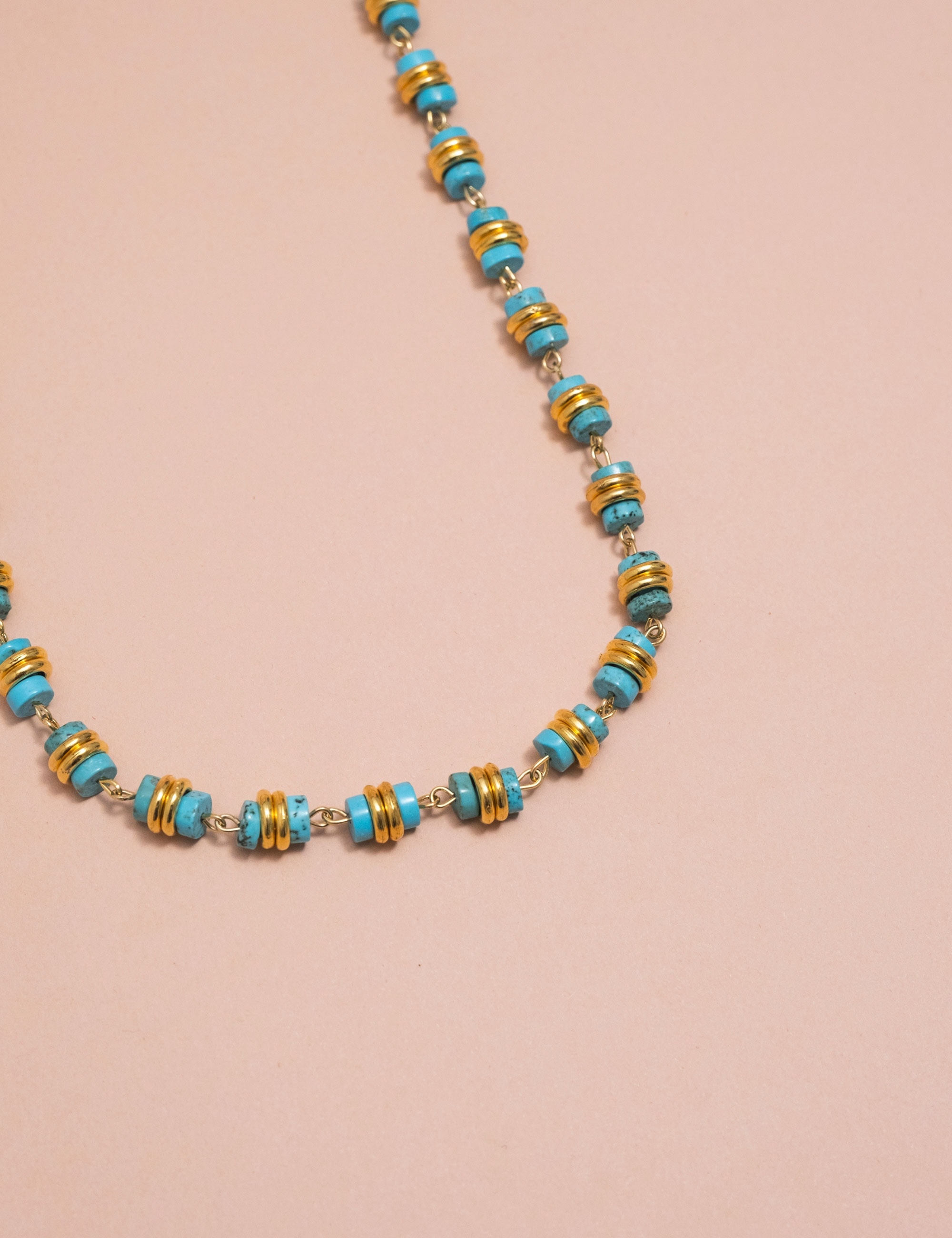 Peça: Envolva-se em estilo e serenidade com o nosso deslumbrante colar turquesa. Esta peça única combina a sofisticação dos canutilhos delicadamente entrelaçados com a vibrante beleza da pedra turquesa, criando um acessório que exala charme e elegância.