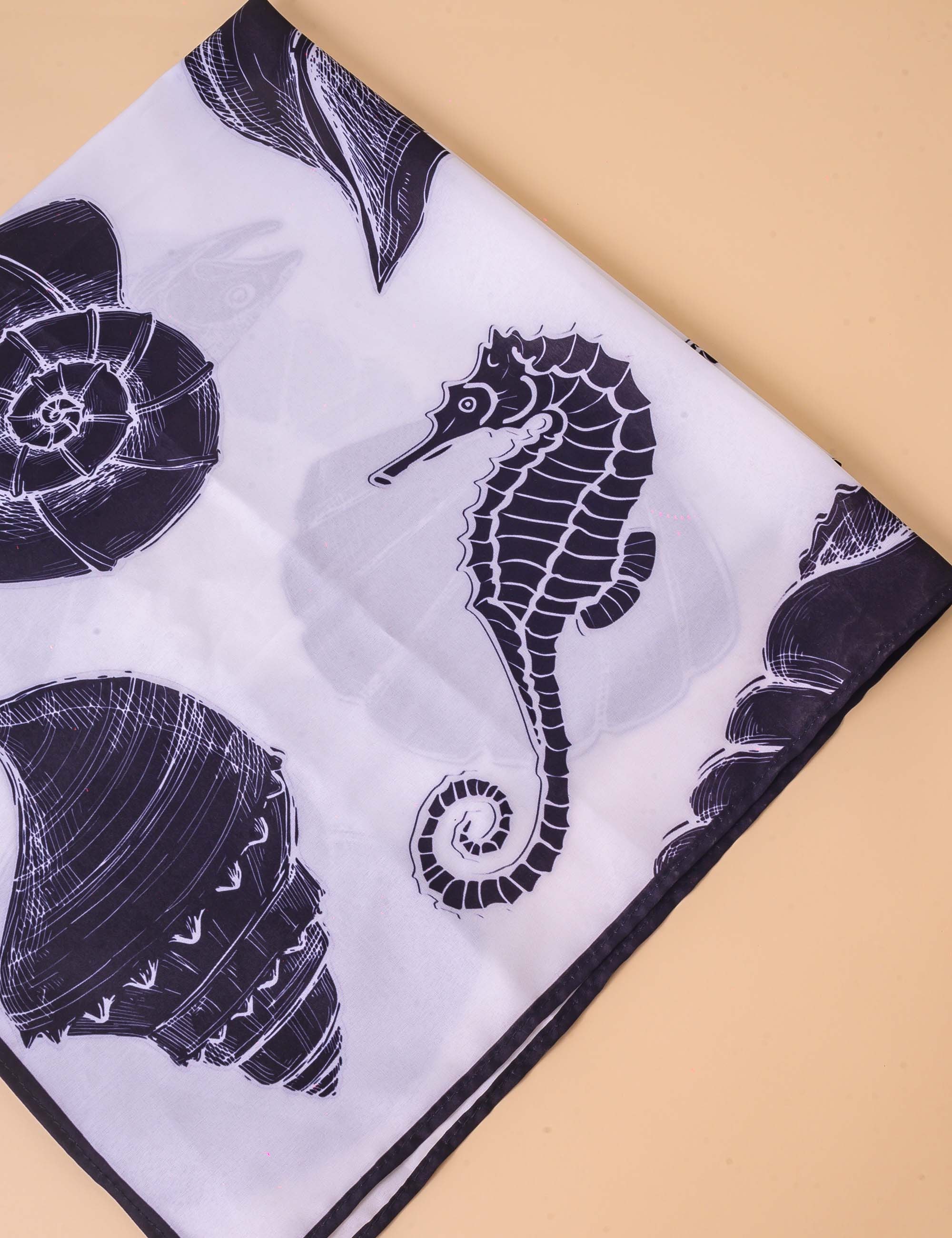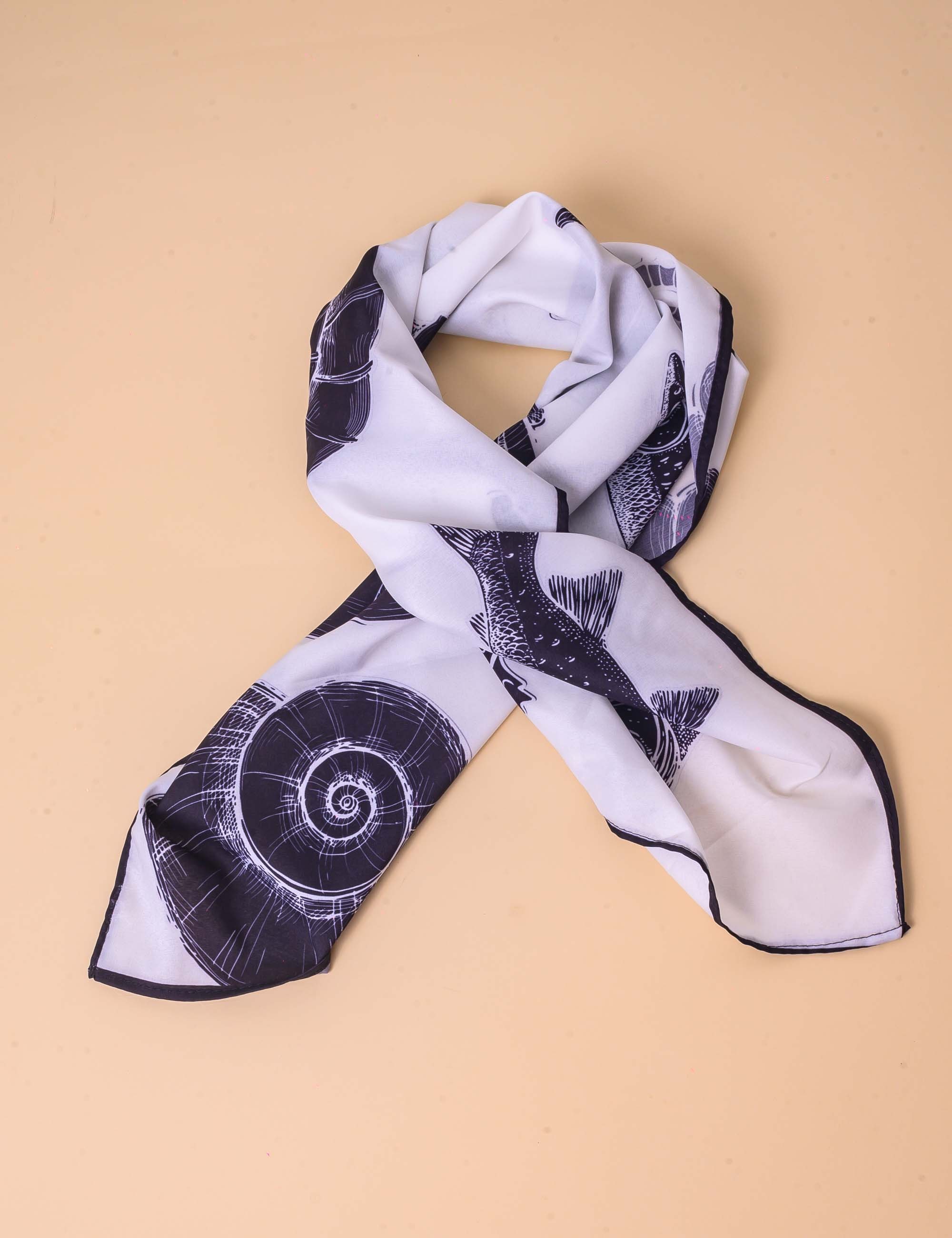 Lenço de peixe, preto e branco, um ícone atemporal que combina estilo e personalidade. Versátil e cheio de atitude, pode ser usado no cabelo, no pescoço, no pulso ou como acessório para complementar produções casuais com um toque fashion e descolado.