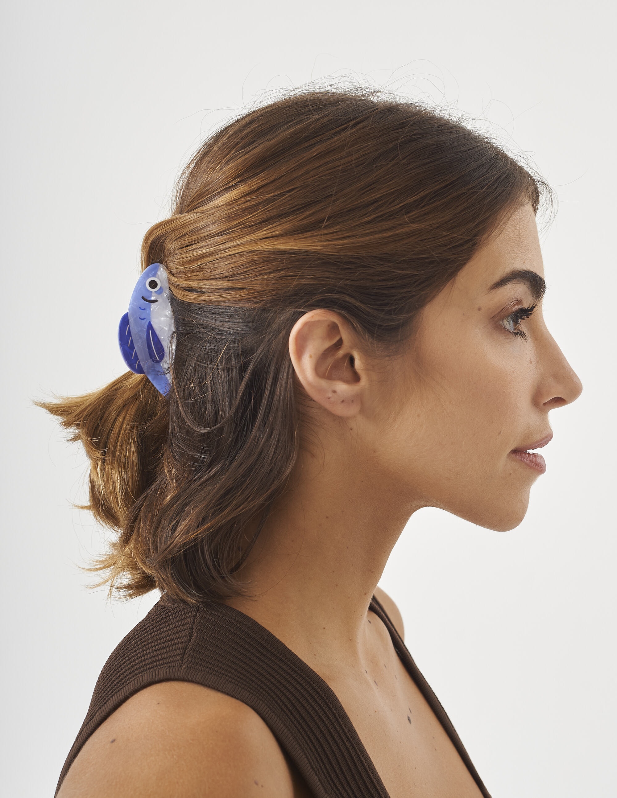 Presilha de resina em formato de peixe azul, com acabamento brilhante e toque divertido. Perfeita para dar um charme extra ao look.