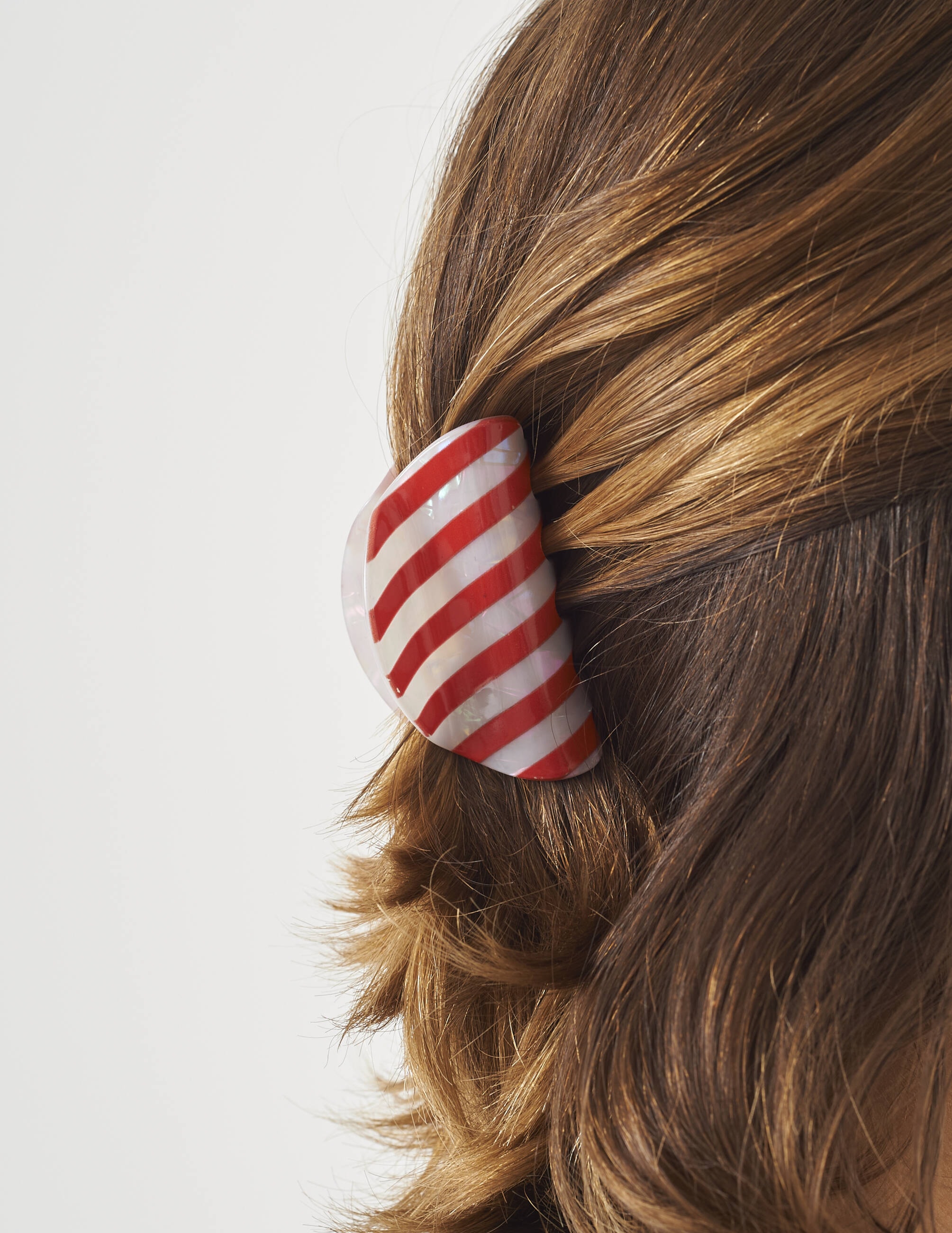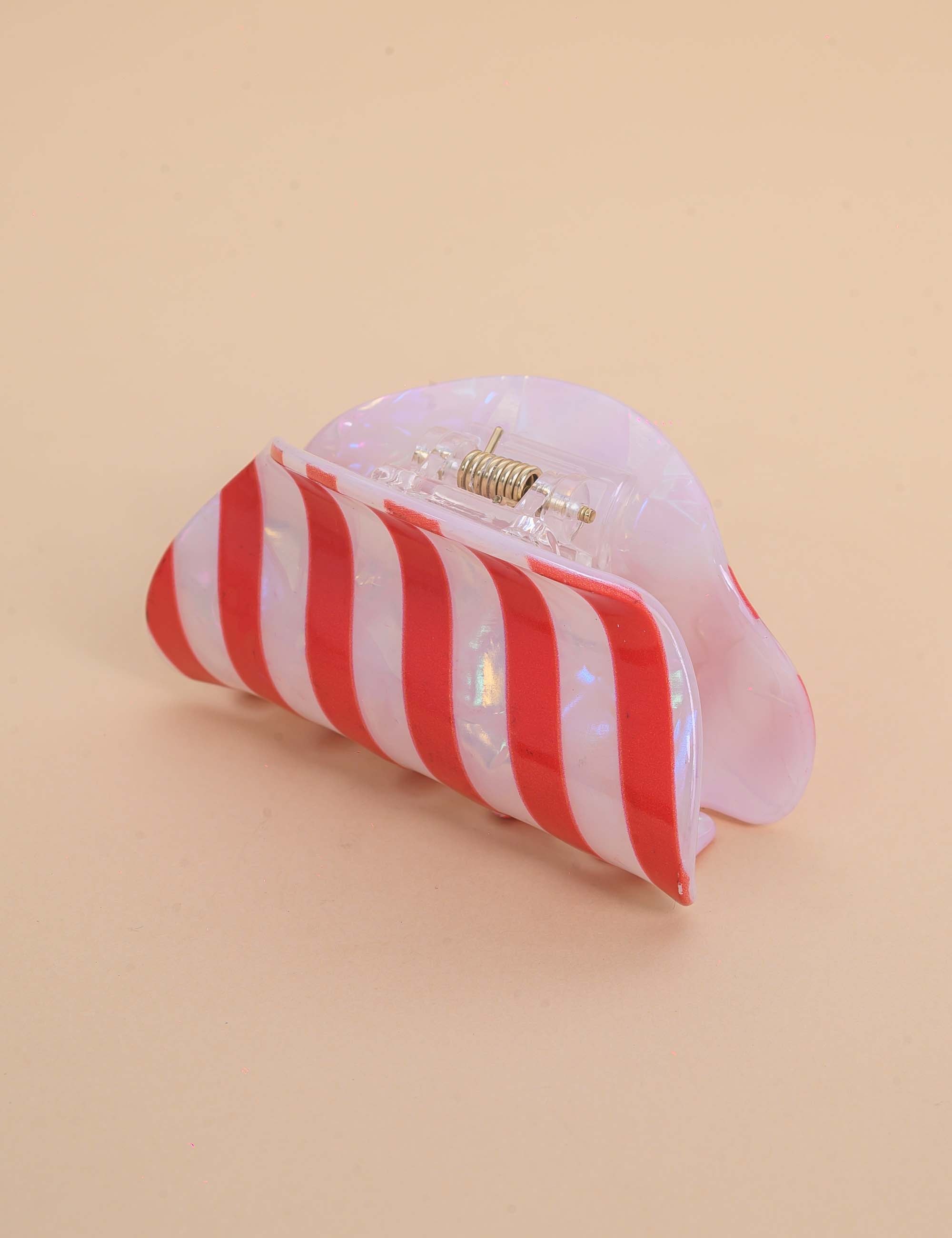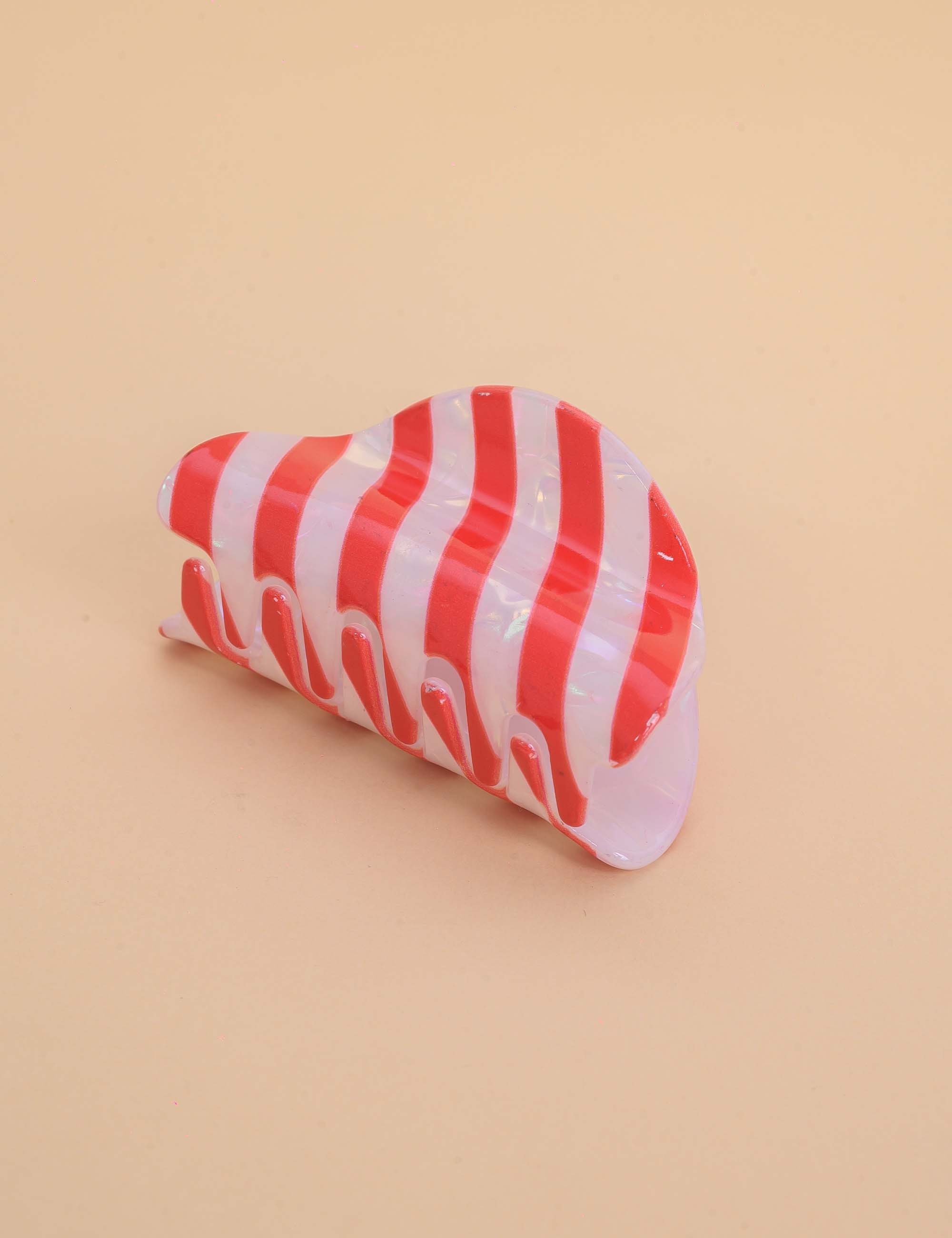 Presilha de resina, com acabamento brilhante e listras vermelhas. Perfeita para dar um charme extra ao look.